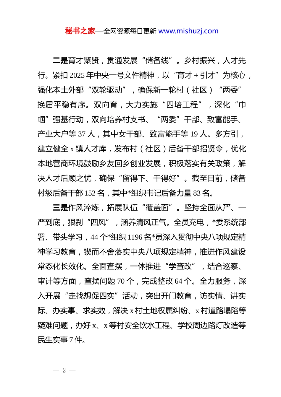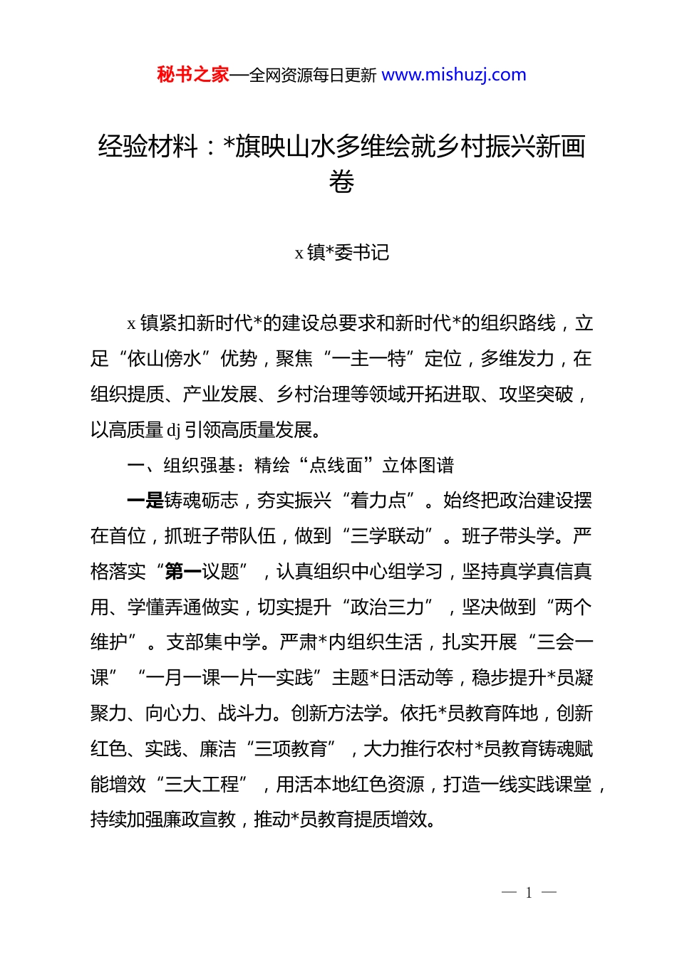 秘书之家—全网资源每日更新 www.mishuzj.com经验材料:*旗映山水多维绘就乡村振兴新画卷x 镇*委书记x 镇紧扣新时代*的建设总要求和新时代*的组织路线,立足“依山傍水”优势,聚焦“一主一特”定位,多维发力,在组织提质、产业发展、乡村治理等领域开拓进取、攻坚突破,以高质量 dj 引领高质量发展。一、组织强基:精绘“点线面”立体图谱一是铸魂砺志,夯实振兴“着力点”。始终把政治建设摆在首位,抓班子带队伍,做到“三学联动”。班子带头学。严格落实“第一议题”,认真组织中心组学习,坚持真学真信真用、学懂弄通做实,切实提升“政治三力”,坚决做到“两个维护”。支部集中学。严肃*内组织生活,扎实开展“三会一课”“一月一课一片一实践”主题*日活动等,稳步提升*员凝聚力、向心力、战斗力。创新方法学。依托*员教育阵地,创新红色、实践、廉洁“三项教育”,大力推行农村*员教育铸魂赋能增效“三大工程”,用活本地红色资源,打造一线实践课堂,持续加强廉政宣教,推动*员教育提质增效。— 1 —秘书之家—全网资源每日更新 www.mishuzj.com二是育才聚贤,贯通发展“储备线”。乡村振兴,人才先行。紧扣 2025 年中央一号文件精神,以“育才+引才”为核心,强化本土外部“双轮驱动”,确保新一轮村(社区)“两委”换届平稳有序。双向育,大力实施“四培工程”,深化“巾帼”强基行动,双向培养村支书、“两委”干部、致富能手、产业大户等 37 人,其中女干部、致富能手等 19 人。多方引,建立健全 x 镇人才库,发布村(社区)后备干部招贤令,优化本地营商环境鼓励乡友回乡创业发展,积极落实有关政策,解决人才后顾之忧,确保“留得下、干得好”。截至目前,储备村级后备干部 152 名,其中*组织书记后备力量 83 名。三是作风淬炼,拓展队伍“覆盖面”。坚持全面从严、一严到底,狠刹“四风”,涵养清风正气。全员充电,*委系统部署、带头学习,44 个*组织 1196 名*员深入贯彻中央八项规定精神学习教育,锲而不舍落实中央八项规定精神,推进作风建设常态化长效化。全面查摆,一体推进“学查改”,结合巡察、审计等方面,查摆问题 70 个,完成整改 64 个。全力服务,深入开展“走找想促四实”活动,突出开门教育,访实情、讲实际、办实事、求实效,解决 x 村土地权属纠纷、x 村道路塌陷等疑难问题,办好 x、x 等村安全饮水工程、学校周边路灯改造等民生实事 7 件。— 2 —秘书之家—全网资源每日更新 www.mishuzj.com二、产业赋能:深耕“山水林”生态布局一是非遗焕彩,擦亮舌尖“金招牌”。把创响“x 牛扣”国字号品牌作为*委重要任务,聚焦“x 牛扣”非遗品牌,深挖地域美食文化底蕴,持续擦亮“深山御膳”特色名片。实施全产业链发展战略,以产业振兴为核心,支持 x 小黄牛良种繁育基地建设,夯实品质根基;推进标准化肉牛养殖基地建设,提升规模化、科学化养殖水平;加大政策扶持力度,培育壮大肉牛加工龙头企业,完善冷链物流和精深加工体系,实现育种、养殖、加工一体化发展。同时,依托非遗品牌效应,融合文化旅游资源,全力打造集生产加工、非遗体验、生态观光于一体的肉牛产业示范小镇,让非遗技艺焕发新生,为乡村振兴注入强劲动能。二是山水生金,做活生态“锦绣卷”。立足“依山傍水”生态禀赋,*委以“一轴一带一基地”布局现代化农业产业,创新“dj+产业”融合路径。以“水”为轴,沿梅溪河打造 6 村相连的 2000 亩供港蔬菜、水果示范园和万亩优质稻示范片,引入智慧农业系统,打造粤港澳大湾区“菜篮子”“米袋子”供应基地。以“山”为带,沿柴君山脉一带打造 3000 亩槐米、万亩油茶示范园。大力推行“*支部+合作社+农户”联动模式,*支部在产业基地设立*员示范岗,32 名*员大户带头推广新技— 3 —秘书之家—全网资源每日更新 www.mishuzj.com术,合作社通过土地流转、务工就业、收益分红等,带动周边村民参与生态种植,户均增收 1.3 万元,切实将绿水青山的生态优势转化为强村富民的发展实效,走出一条生态美、产业兴、百姓富的乡村振兴之路。三是林间掘金,深挖绿色“聚宝盆”。践行...