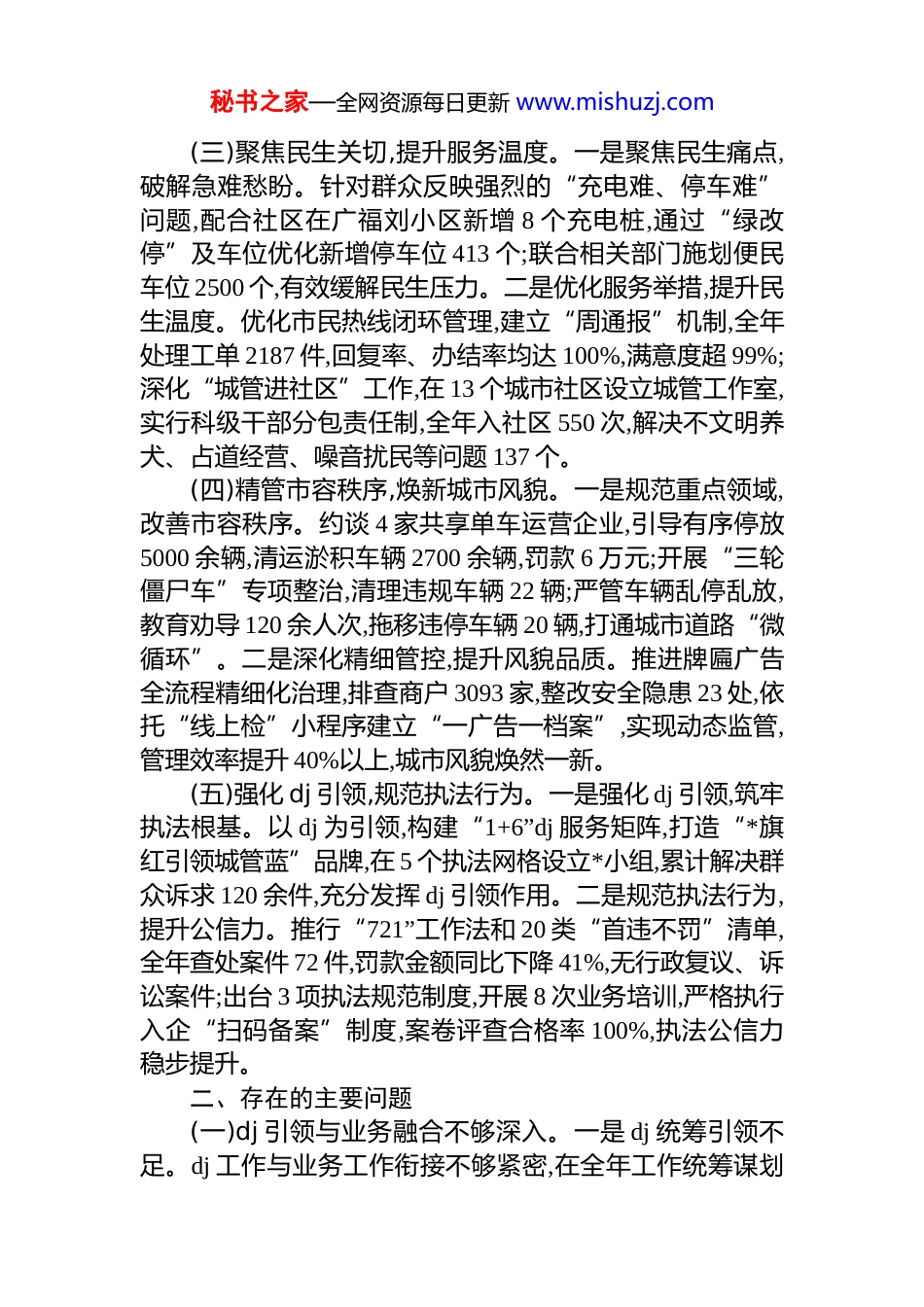 秘书之家—全网资源每日更新 www.mishuzj.com开发区行政执法大队 2025 年度工作总结和2026 年工作计划2025 年,开发区行政执法大队紧紧围绕城市管理精细化、执法规范化、服务便民化目标,聚焦重点任务、创新工作举措,有效破解一批城市管理难题,各项工作取得显著成效。一、2025 年工作总结(一)创新执法模式,凝聚联动合力。一是创新执法模式,破解管控难题。深刻把握城市管理时空分布规律,创新推行“潮汐执法”模式,通过科学研判问题、动态调配力量、精准匹配执法时段,有效破解执法力量有限与管理需求不均的核心矛盾,相关工作经验被省住建厅纳入 2025 年度城市管理典型经验(第一批),成为全省城市管理创新实践标杆。二是深化联动机制,凝聚治理合力。持续深化“城警联动”工作机制,联合公安、交警等部门创新推行“走街式”联合执法,聚焦主次干道、商圈、学校、医院“四大周边”重点区域,常态化开展执法整治行动,筑牢城市管理与民生安全双重防线,执法管控质效显著提升。(二)深耕生态治理,筑牢环保防线。一是构建闭环体系,靶向整治污染。构建“源头管控+过程督导+末端执法”全链条生态环保治理体系,精准靶向整治扬尘、餐饮油烟、渣土运输等突出污染问题,明确各环节管控责任,确保治理工作有序推进。二是狠抓措施落地,提升治理质效。推动 9 家帮包货场签订治理承诺书,完成 115 块钢板铺设及 2700 余平方米道路硬化;通过“线上洗”小程序实现 848 家餐饮单位全覆盖监管,完成 123 家大型餐饮门店油烟检测,油烟达标率提升至 98%;建立渣土车全流程管控机制,查处违规运输 12 起、罚款 3.679 万元,生态环境持续改善。秘书之家—全网资源每日更新 www.mishuzj.com(三)聚焦民生关切,提升服务温度。一是聚焦民生痛点,破解急难愁盼。针对群众反映强烈的“充电难、停车难”问题,配合社区在广福刘小区新增 8 个充电桩,通过“绿改停”及车位优化新增停车位 413 个;联合相关部门施划便民车位 2500 个,有效缓解民生压力。二是优化服务举措,提升民生温度。优化市民热线闭环管理,建立“周通报”机制,全年处理工单 2187 件,回复率、办结率均达 100%,满意度超 99%;深化“城管进社区”工作,在 13 个城市社区设立城管工作室,实行科级干部分包责任制,全年入社区 550 次,解决不文明养犬、占道经营、噪音扰民等问题 137 个。(四)精管市容秩序,焕新城市风貌。一是规范重点领域,改善市容秩序。约谈 4 家共享单车运营企业,引导有序停放5000 余辆,清运淤积车辆 2700 余辆,罚款 6 万元;开展“三轮僵尸车”专项整治,清理违规车辆 22 辆;严管车辆乱停乱放,教育劝导 120 余人次,拖移违停车辆 20 辆,打通城市道路“微循环”。二是深化精细管控,提升风貌品质。推进牌匾广告全流程精细化治理,排查商户 3093 家,整改安全隐患 23 处,依托“线上检”小程序建立“一广告一档案”,实现动态监管,管理效率提升 40%以上,城市风貌焕然一新。(五)强化 dj 引领,规范执法行为。一是强化 dj 引领,筑牢执法根基。以 dj 为引领,构建“1+6”dj 服务矩阵,打造“*旗红引领城管蓝”品牌,在 5 个执法网格设立*小组,累计解决群众诉求 120 余件,充分发挥 dj 引领作用。二是规范执法行为,提升公信力。推行“721”工作法和 20 类“首违不罚”清单,全年查处案件 72 件,罚款金额同比下降 41%,无行政复议、诉讼案件;出台 3 项执法规范制度,开展 8 次业务培训,严格执行入企“扫码备案”制度,案卷评查合格率 100%,执法公信力稳步提升。二、存在的主要问题(一)dj 引领与业务融合不够深入。一是 dj 统筹引领不足。dj 工作与业务工作衔接不够紧密,在全年工作统筹谋划秘书之家—全网资源每日更新 www.mishuzj.comdj 工作创新方面存在薄弱环节,深入基层一线调研实践不够,未能形成 dj 统揽全局、引领各项工作高质量推进的良好格局。二是活动开展成效不佳。在城管进社区、*员报到等活动中,形式较为单一,亮点特色不突出,针对群众急难愁盼问题,解决思路不宽、办法不多,活动成效未能充分彰显,dj 服务效能有待进一步提升。(二)执法队伍专业素养有待提升。一是队伍学习主动性弱...