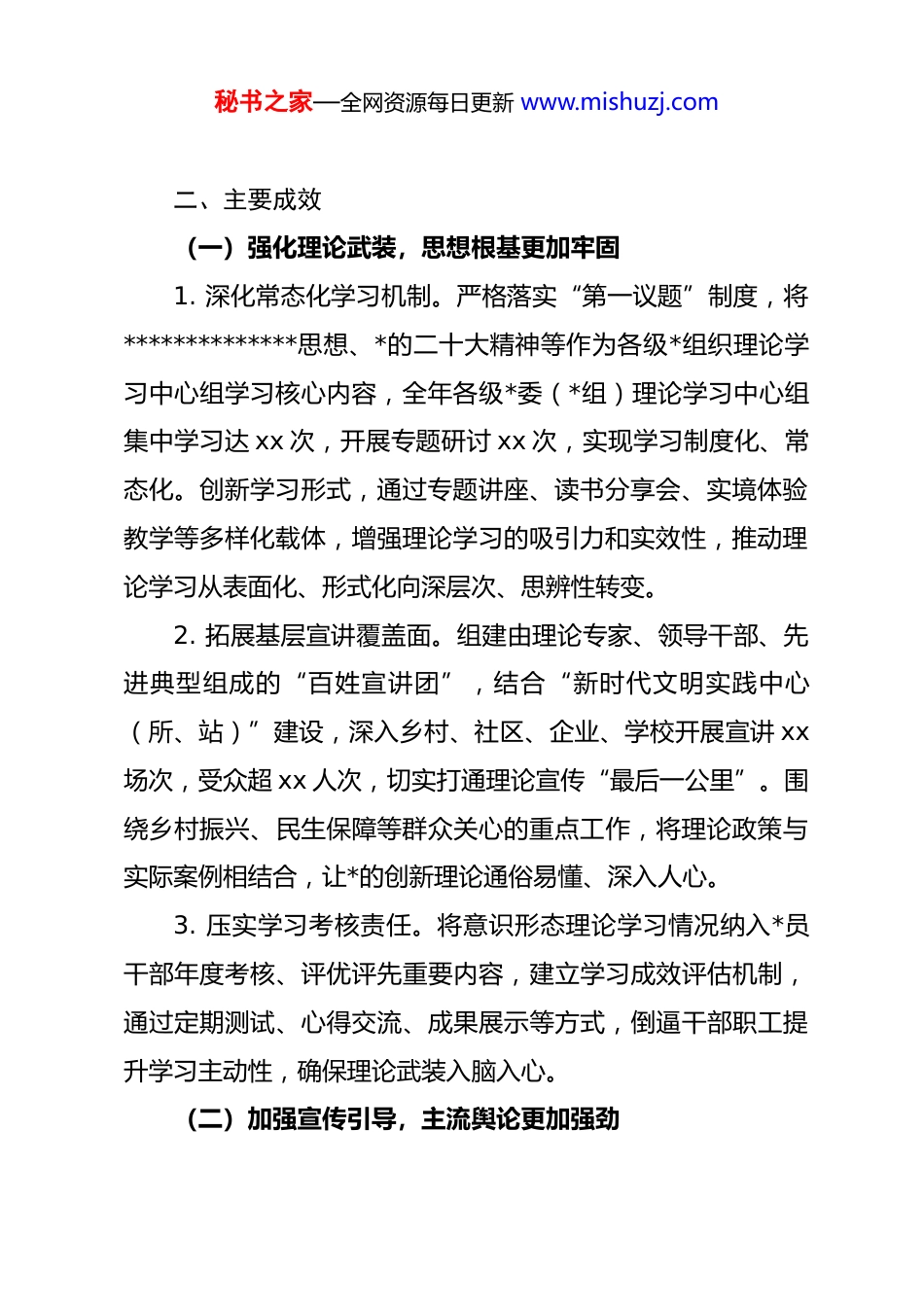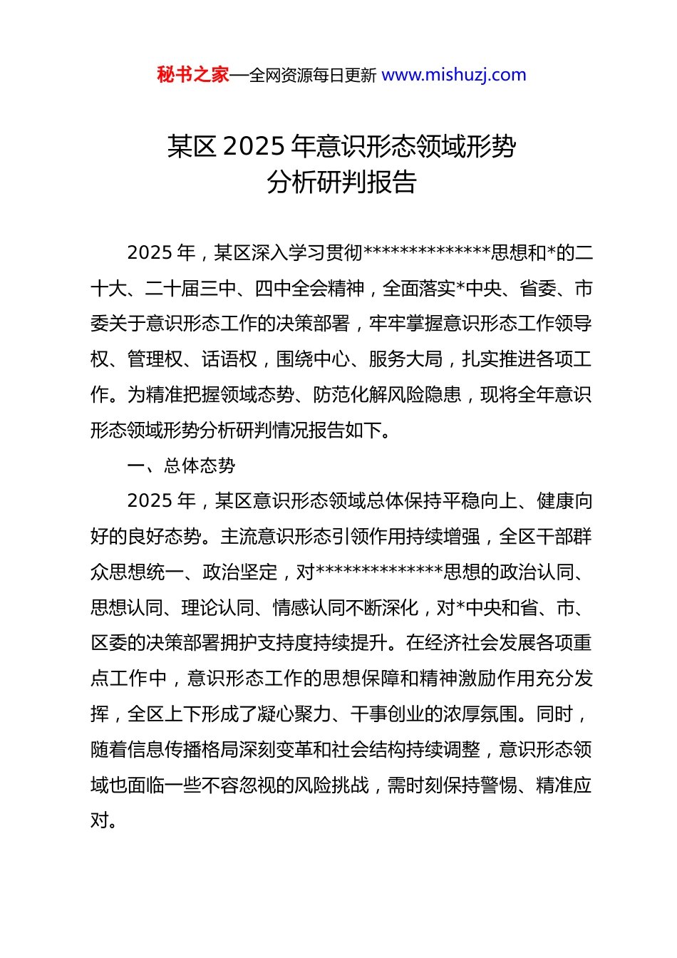 秘书之家—全网资源每日更新 www.mishuzj.com某区 2025 年意识形态领域形势分析研判报告2025 年,某区深入学习贯彻**************思想和*的二十大、二十届三中、四中全会精神,全面落实*中央、省委、市委关于意识形态工作的决策部署,牢牢掌握意识形态工作领导权、管理权、话语权,围绕中心、服务大局,扎实推进各项工作。为精准把握领域态势、防范化解风险隐患,现将全年意识形态领域形势分析研判情况报告如下。一、总体态势2025 年,某区意识形态领域总体保持平稳向上、健康向好的良好态势。主流意识形态引领作用持续增强,全区干部群众思想统一、政治坚定,对**************思想的政治认同、思想认同、理论认同、情感认同不断深化,对*中央和省、市、区委的决策部署拥护支持度持续提升。在经济社会发展各项重点工作中,意识形态工作的思想保障和精神激励作用充分发挥,全区上下形成了凝心聚力、干事创业的浓厚氛围。同时,随着信息传播格局深刻变革和社会结构持续调整,意识形态领域也面临一些不容忽视的风险挑战,需时刻保持警惕、精准应对。秘书之家—全网资源每日更新 www.mishuzj.com二、主要成效(一)强化理论武装,思想根基更加牢固1. 深化常态化学习机制。严格落实“第一议题”制度,将**************思想、*的二十大精神等作为各级*组织理论学习中心组学习核心内容,全年各级*委(*组)理论学习中心组集中学习达 xx 次,开展专题研讨 xx 次,实现学习制度化、常态化。创新学习形式,通过专题讲座、读书分享会、实境体验教学等多样化载体,增强理论学习的吸引力和实效性,推动理论学习从表面化、形式化向深层次、思辨性转变。2. 拓展基层宣讲覆盖面。组建由理论专家、领导干部、先进典型组成的“百姓宣讲团”,结合“新时代文明实践中心(所、站)”建设,深入乡村、社区、企业、学校开展宣讲 xx场次,受众超 xx 人次,切实打通理论宣传“最后一公里”。围绕乡村振兴、民生保障等群众关心的重点工作,将理论政策与实际案例相结合,让*的创新理论通俗易懂、深入人心。3. 压实学习考核责任。将意识形态理论学习情况纳入*员干部年度考核、评优评先重要内容,建立学习成效评估机制,通过定期测试、心得交流、成果展示等方式,倒逼干部职工提升学习主动性,确保理论武装入脑入心。(二)加强宣传引导,主流舆论更加强劲秘书之家—全网资源每日更新 www.mishuzj.com1. 构建多元宣传矩阵。整合区融媒体中心、政府网站、“两微一端”等宣传平台,形成“传统媒体+新兴媒体”协同发力的传播格局。严格落实新闻宣传“三审三校”制度,全年发布各类权威信息 xx 条,制作主题宣传作品 xx 件,其中多个作品被上级媒体转载,总阅读量突破 xx 万人次,有效扩大主流舆论覆盖面。2. 聚焦重点主题宣传。围绕重大时间节点和区委、区政府中心工作,策划开展“高质量发展蹲点记”“身边榜样·最美瞬间”等系列宣传活动,深入挖掘全区在产业升级、生态保护、民生改善等领域的先进典型和鲜活案例 xx 个,通过典型引领弘扬崇德向善、担当作为的价值导向,凝聚发展正能量。3. 丰富文化传播载体。充分发挥文化场馆、旅游景区等阵地作用,广泛宣传社会主义核心价值观。持续开展“送戏下乡”“公益电影放映”等文化惠民活动,全年送戏下乡不少于xx 场,放映农村公益电影不少于 xx 场。深入推进红色文化传承,组织红色主题展览、文艺创作等活动,推动红色文化创造性转化、创新性发展。(三)健全防控机制,风险防线更加坚实1. 完善责任体系。严格落实意识形态工作责任制,构建区委统一领导、宣传部牵头协调、各部门分工负责的工作格局。秘书之家—全网资源每日更新 www.mishuzj.com明确各级*委(*组)主要负责同志为第一责任人,分管领导为直接责任人,班子成员履行“一岗双责”,将意识形态工作纳入 dj 工作责任制和领导班子、领导干部目标管理,层层传导压力。2. 强化风险排查处置。建立“日巡查、周通报、月分析”的舆情监测预警机制,组建专兼职网络评论员和舆情处置队伍xx 人,实时监测网络舆情动态。全年累计监测处置各类舆情xx 起,均实现快速响应、有效...