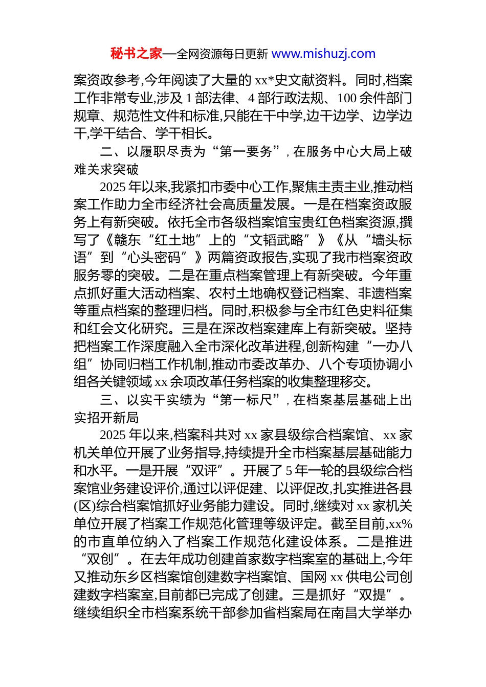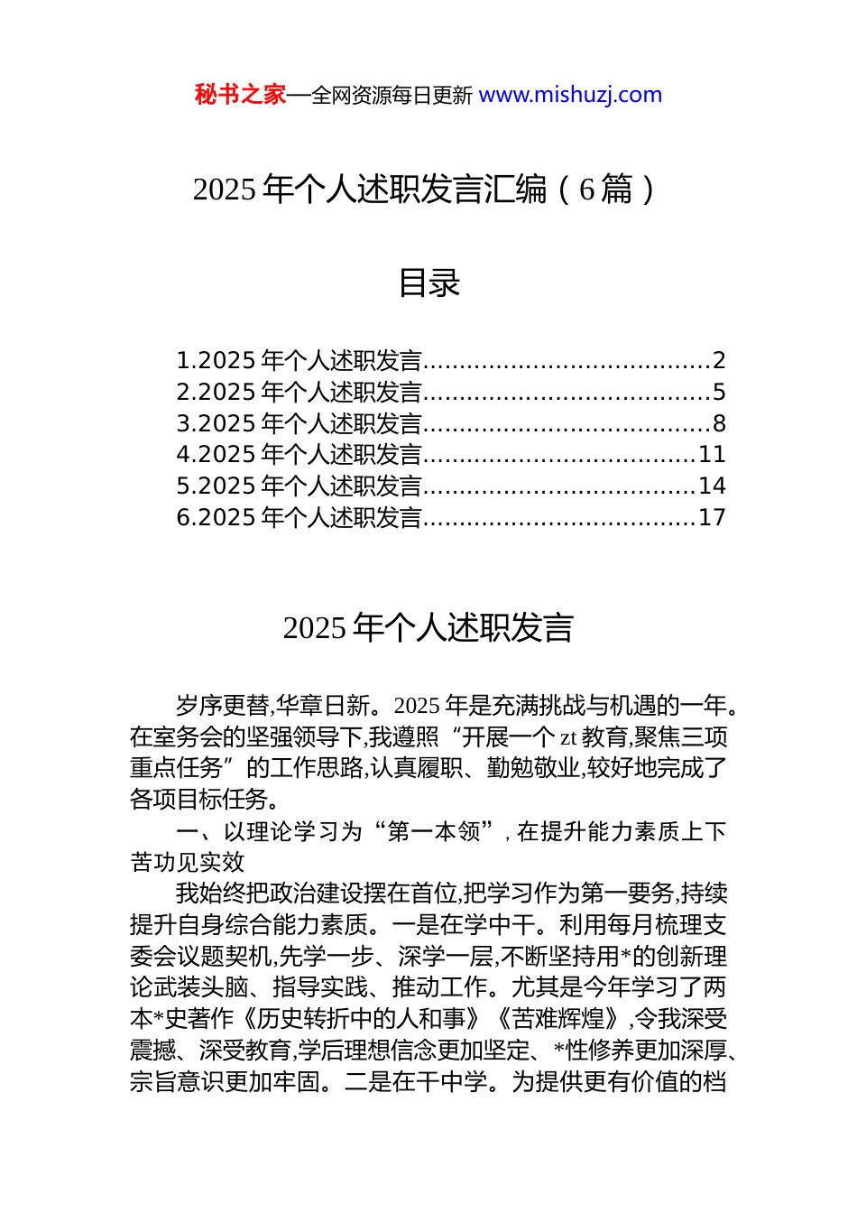 秘书之家—全网资源每日更新 www.mishuzj.com2025 年个人述职发言汇编(6 篇)目录1.2025 年个人述职发言.......................................22.2025 年个人述职发言.......................................53.2025 年个人述职发言.......................................84.2025 年个人述职发言.....................................115.2025 年个人述职发言.....................................146.2025 年个人述职发言.....................................172025 年个人述职发言岁序更替,华章日新。2025 年是充满挑战与机遇的一年。在室务会的坚强领导下,我遵照“开展一个 zt 教育,聚焦三项重点任务”的工作思路,认真履职、勤勉敬业,较好地完成了各项目标任务。一、以理论学习为“第一本领”,在提升能力素质上下苦功见实效我始终把政治建设摆在首位,把学习作为第一要务,持续提升自身综合能力素质。一是在学中干。利用每月梳理支委会议题契机,先学一步、深学一层,不断坚持用*的创新理论武装头脑、指导实践、推动工作。尤其是今年学习了两本*史著作《历史转折中的人和事》《苦难辉煌》,令我深受震撼、深受教育,学后理想信念更加坚定、*性修养更加深厚、宗旨意识更加牢固。二是在干中学。为提供更有价值的档秘书之家—全网资源每日更新 www.mishuzj.com案资政参考,今年阅读了大量的 xx*史文献资料。同时,档案工作非常专业,涉及 1 部法律、4 部行政法规、100 余件部门规章、规范性文件和标准,只能在干中学,边干边学、边学边干,学干结合、学干相长。二、以履职尽责为“第一要务”,在服务中心大局上破难关求突破2025 年以来,我紧扣市委中心工作,聚焦主责主业,推动档案工作助力全市经济社会高质量发展。一是在档案资政服务上有新突破。依托全市各级档案馆宝贵红色档案资源,撰写了《赣东“红土地”上的“文韬武略”》《从“墙头标语”到“心头密码”》两篇资政报告,实现了我市档案资政服务零的突破。二是在重点档案管理上有新突破。今年重点抓好重大活动档案、农村土地确权登记档案、非遗档案等重点档案的整理归档。同时,积极参与全市红色史料征集和红会文化研究。三是在深改档案建库上有新突破。坚持把档案工作深度融入全市深化改革进程,创新构建“一办八组”协同归档工作机制,推动市委改革办、八个专项协调小组各关键领域 xx 余项改革任务档案的收集整理移交。三、以实干实绩为“第一标尺”,在档案基层基础上出实招开新局2025 年以来,档案科共对 xx 家县级综合档案馆、xx 家机关单位开展了业务指导,持续提升全市档案基层基础能力和水平。一是开展“双评”。开展了 5 年一轮的县级综合档案馆业务建设评价,通过以评促建、以评促改,扎实推进各县(区)综合档案馆抓好业务能力建设。同时,继续对 xx 家机关单位开展了档案工作规范化管理等级评定。截至目前,xx%的市直单位纳入了档案工作规范化建设体系。二是推进“双创”。在去年成功创建首家数字档案室的基础上,今年又推动东乡区档案馆创建数字档案馆、国网 xx 供电公司创建数字档案室,目前都已完成了创建。三是抓好“双提”。继续组织全市档案系统干部参加省档案局在南昌大学举办秘书之家—全网资源每日更新 www.mishuzj.com的“档案速成班”,持续提高全市档案人员专业能力和水平。精心组织“6·9”国际档案日系列宣传活动,扎实开展档案行政执法监督检查,不断提升广大干部职工档案意识。四、以清廉务实为“第一底色”,在科室队伍建设上做文章树形象*办干部的一言一行直接代表了市委的形象,因此,我始终从严要求自己和科室同志,树立对外良好形象。一是更有战斗力。以开展“快稳严准细实”作风专题教育为契机,科室建立了工作任务台账、错情登记台账和每周工作复盘制度,进一步总结工作经验,优化工作流程,工作效能进一步提升。二是更有敬畏心。我们敬畏归档的每一页纸张、每一段影像,因为它们都是不可再生的历史记忆。同时,我们始终敬畏dj 国法,严格按规章程序办事,坚守廉洁底线,维护*办干部良好形象。2025 年个人述职发言今年以来,我主要负责法规和组织人事工作,包括 9-12 月负责秘书科以及服...