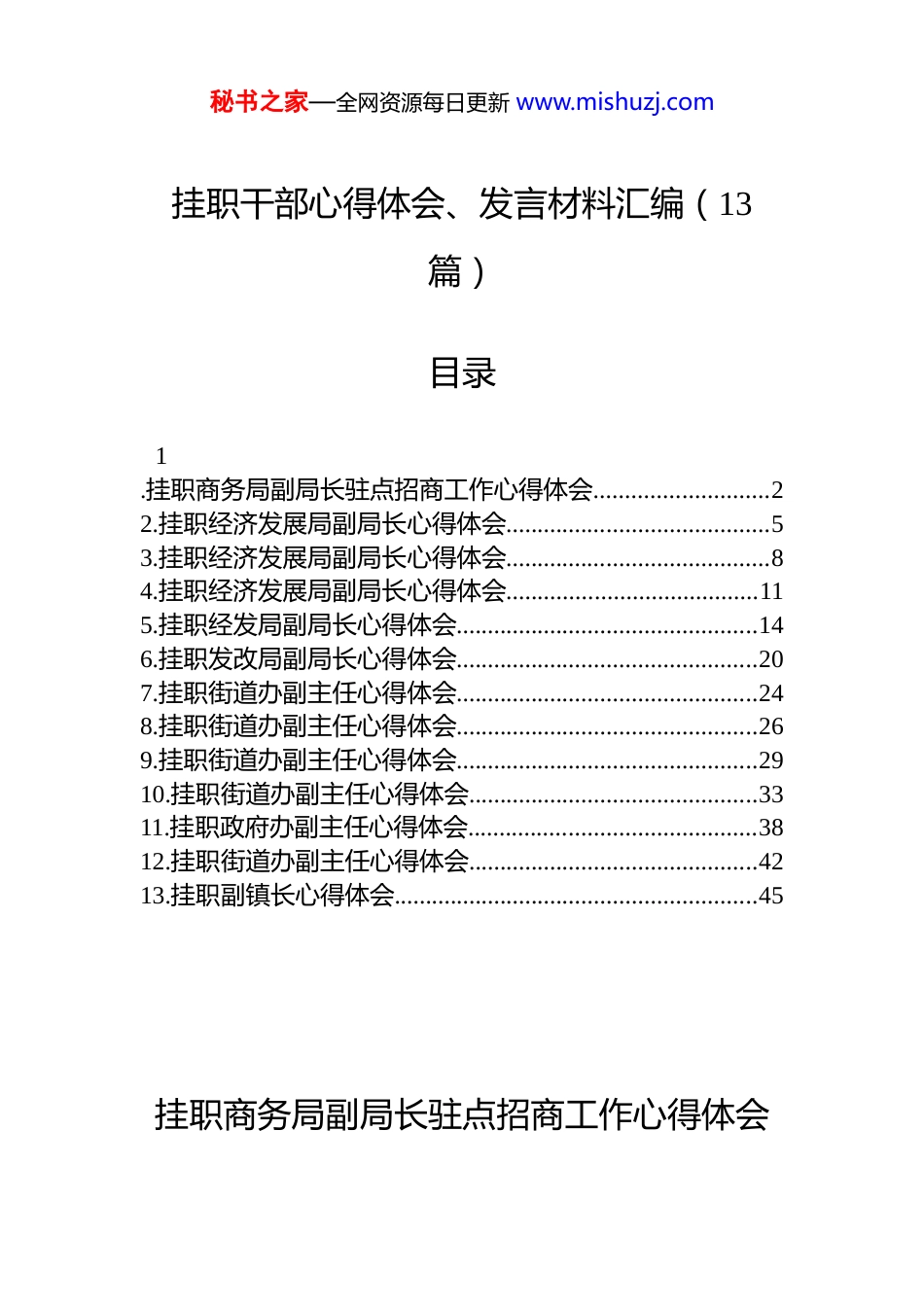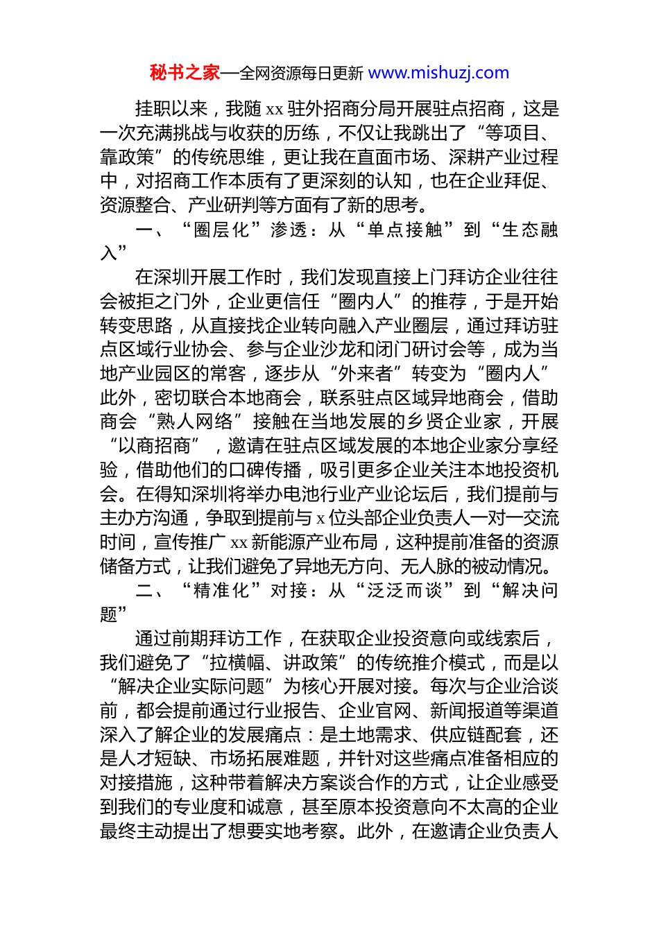 秘书之家—全网资源每日更新 www.mishuzj.com挂职干部心得体会、发言材料汇编(13篇)目录1.挂职商务局副局长驻点招商工作心得体会............................22.挂职经济发展局副局长心得体会..........................................53.挂职经济发展局副局长心得体会..........................................84.挂职经济发展局副局长心得体会........................................115.挂职经发局副局长心得体会................................................146.挂职发改局副局长心得体会................................................207.挂职街道办副主任心得体会................................................248.挂职街道办副主任心得体会................................................269.挂职街道办副主任心得体会................................................2910.挂职街道办副主任心得体会..............................................3311.挂职政府办副主任心得体会..............................................3812.挂职街道办副主任心得体会..............................................4213.挂职副镇长心得体会..........................................................45挂职商务局副局长驻点招商工作心得体会秘书之家—全网资源每日更新 www.mishuzj.com挂职以来,我随 xx 驻外招商分局开展驻点招商,这是一次充满挑战与收获的历练,不仅让我跳出了“等项目、靠政策”的传统思维,更让我在直面市场、深耕产业过程中,对招商工作本质有了更深刻的认知,也在企业拜促、资源整合、产业研判等方面有了新的思考。一、“圈层化”渗透:从“单点接触”到“生态融入”在深圳开展工作时,我们发现直接上门拜访企业往往会被拒之门外,企业更信任“圈内人”的推荐,于是开始转变思路,从直接找企业转向融入产业圈层,通过拜访驻点区域行业协会、参与企业沙龙和闭门研讨会等,成为当地产业园区的常客,逐步从“外来者”转变为“圈内人”此外,密切联合本地商会,联系驻点区域异地商会,借助商会“熟人网络”接触在当地发展的乡贤企业家,开展“以商招商”,邀请在驻点区域发展的本地企业家分享经验,借助他们的口碑传播,吸引更多企业关注本地投资机会。在得知深圳将举办电池行业产业论坛后,我们提前与主办方沟通,争取到提前与 x 位头部企业负责人一对一交流时间,宣传推广 xx 新能源产业布局,这种提前准备的资源储备方式,让我们避免了异地无方向、无人脉的被动情况。二、“精准化”对接:从“泛泛而谈”到“解决问题”通过前期拜访工作,在获取企业投资意向或线索后,我们避免了“拉横幅、讲政策”的传统推介模式,而是以“解决企业实际问题”为核心开展对接。每次与企业洽谈前,都会提前通过行业报告、企业官网、新闻报道等渠道深入了解企业的发展痛点:是土地需求、供应链配套,还是人才短缺、市场拓展难题,并针对这些痛点准备相应的对接措施,这种带着解决方案谈合作的方式,让企业感受到我们的专业度和诚意,甚至原本投资意向不太高的企业最终主动提出了想要实地考察。此外,在邀请企业负责人秘书之家—全网资源每日更新 www.mishuzj.com到 xx 实地考察时,不仅安排参观厂房和园区,还组织企业与本地上下游供应商、金融机构等对接,让企业直观看到产业链配套能力,对于不便实地考察的企业,我们通过宣传片及招商手册,让企业足不出户就能了解本地情况。三、“长期化”跟进:从“签约为王”到“陪伴成长”驻点招商过程中,很多项目并非一次对接就能成功,需要长期跟进、持续服务。我们建立了项目跟进台账,将企业分为“签约项目”“意向项目”“储备项目”三类,针对不同类型企业制定差异化跟进策略。对于“签约项目”,每周更新项目进展,为进一步解决项目建设中的痛点、堵点,保障项目快速推进,推行“标准地”改革,在土地挂牌前完成各项准备工作,由原来的项目等土地变成土地等项目,大幅缩短项目落地时间、降低制度性交易成本。实施“容缺办理”机制,提升审批部门办理效能,减少项目单位的办事成本,...