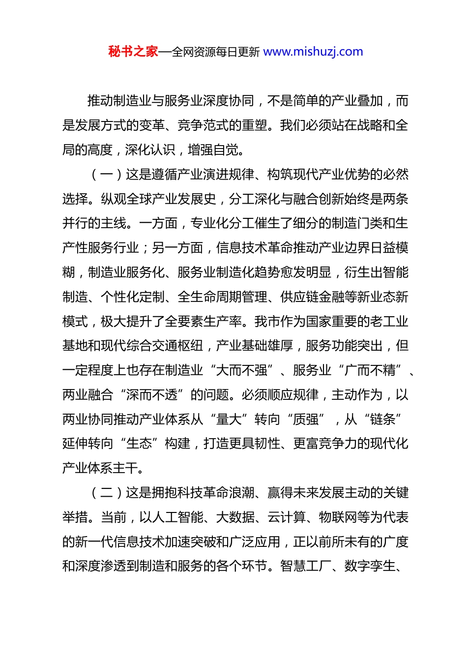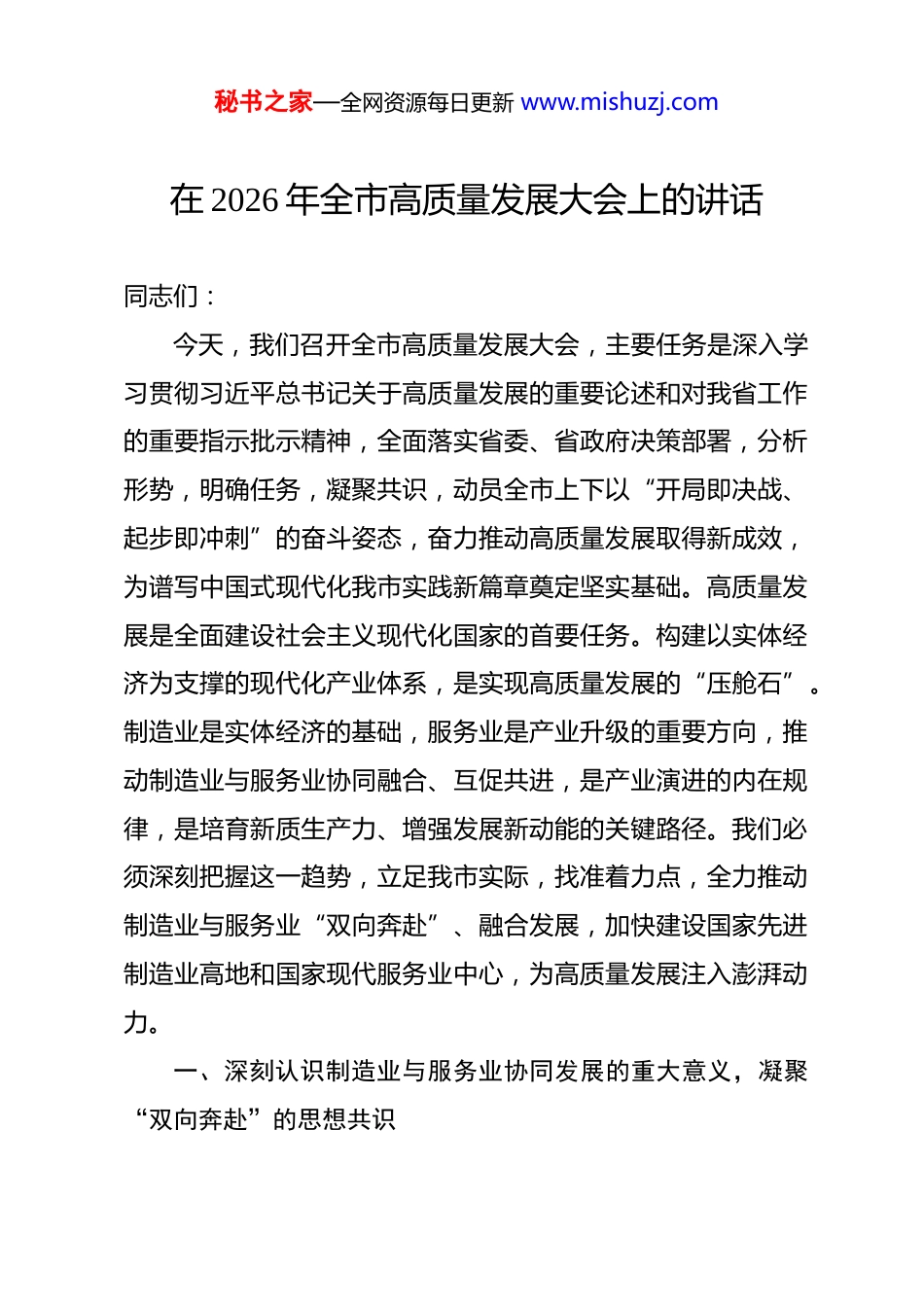 秘书之家—全网资源每日更新 www.mishuzj.com在 2026 年全市高质量发展大会上的讲话 同志们:今天,我们召开全市高质量发展大会,主要任务是深入学习贯彻习近平总书记关于高质量发展的重要论述和对我省工作的重要指示批示精神,全面落实省委、省政府决策部署,分析形势,明确任务,凝聚共识,动员全市上下以“开局即决战、起步即冲刺”的奋斗姿态,奋力推动高质量发展取得新成效,为谱写中国式现代化我市实践新篇章奠定坚实基础。高质量发展是全面建设社会主义现代化国家的首要任务。构建以实体经济为支撑的现代化产业体系,是实现高质量发展的“压舱石”。制造业是实体经济的基础,服务业是产业升级的重要方向,推动制造业与服务业协同融合、互促共进,是产业演进的内在规律,是培育新质生产力、增强发展新动能的关键路径。我们必须深刻把握这一趋势,立足我市实际,找准着力点,全力推动制造业与服务业“双向奔赴”、融合发展,加快建设国家先进制造业高地和国家现代服务业中心,为高质量发展注入澎湃动力。一、深刻认识制造业与服务业协同发展的重大意义,凝聚“双向奔赴”的思想共识秘书之家—全网资源每日更新 www.mishuzj.com推动制造业与服务业深度协同,不是简单的产业叠加,而是发展方式的变革、竞争范式的重塑。我们必须站在战略和全局的高度,深化认识,增强自觉。(一)这是遵循产业演进规律、构筑现代产业优势的必然选择。纵观全球产业发展史,分工深化与融合创新始终是两条并行的主线。一方面,专业化分工催生了细分的制造门类和生产性服务行业;另一方面,信息技术革命推动产业边界日益模糊,制造业服务化、服务业制造化趋势愈发明显,衍生出智能制造、个性化定制、全生命周期管理、供应链金融等新业态新模式,极大提升了全要素生产率。我市作为国家重要的老工业基地和现代综合交通枢纽,产业基础雄厚,服务功能突出,但一定程度上也存在制造业“大而不强”、服务业“广而不精”、两业融合“深而不透”的问题。必须顺应规律,主动作为,以两业协同推动产业体系从“量大”转向“质强”,从“链条”延伸转向“生态”构建,打造更具韧性、更富竞争力的现代化产业体系主干。(二)这是拥抱科技革命浪潮、赢得未来发展主动的关键举措。当前,以人工智能、大数据、云计算、物联网等为代表的新一代信息技术加速突破和广泛应用,正以前所未有的广度和深度渗透到制造和服务的各个环节。智慧工厂、数字孪生、秘书之家—全网资源每日更新 www.mishuzj.com平台经济、共享制造等不断涌现,不仅深刻改变了生产方式和服务模式,更在重构产业生态和竞争格局。未来的竞争,越来越体现为产业生态体系、融合发展能力的竞争。我市拥有较为完备的工业体系、丰富的应用场景和日益壮大的数字产业,必须抢抓新科技革命带来的“机会窗口”,以科技创新驱动两业在更高水平、更深层次上协同,推动产业智能化、绿色化、融合化发展,塑造面向未来的新质生产力和产业新优势。(三)这是畅通经济内外循环、满足人民美好生活需要的战略要求。制造业与服务业协同发展,能够有效促进供给侧结构性改革与扩大内需战略的有机结合。通过服务赋能制造,可以提升产品品质和附加值,创造新需求;通过制造支撑服务,可以夯实服务体验的物质基础,优化供给结构。这有利于打通生产、分配、流通、消费各环节的堵点,促进经济良性循环。我市拥有超千万的常住人口和辐射中原的广阔腹地,人民群众对高品质产品和服务的需求日益增长。推动两业协同,发展柔性制造、敏捷服务,能够更好满足个性化、多样化、升级化的消费需求,在创造市场、引导消费、改善民生中拓展发展空间,让高质量发展成果更多更公平惠及全体市民。二、准确把握制造业与服务业协同发展的主攻方向,明确“融合发展”的实践路径秘书之家—全网资源每日更新 www.mishuzj.com推动制造业与服务业协同发展,必须坚持系统观念,聚焦重点领域和关键环节,精准发力,久久为功。(一)强壮产业体系“主干”与“枝叶”,提升整体能级制造业是“主干”,服务业是“枝叶”,根深干壮方能枝繁叶茂。必须坚持把发展经济的着力点放在实体经济上,推动制造业与...