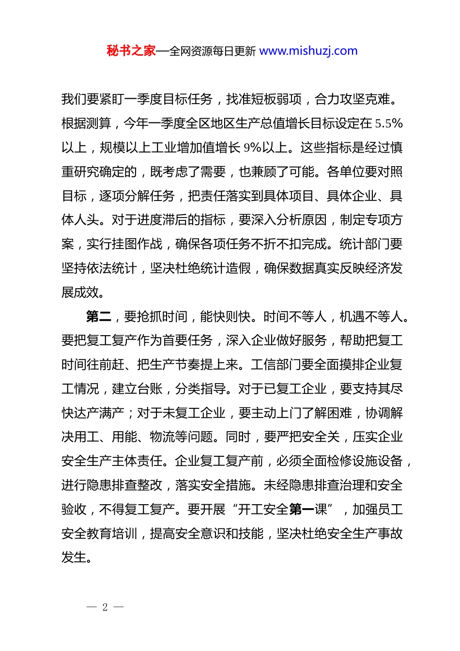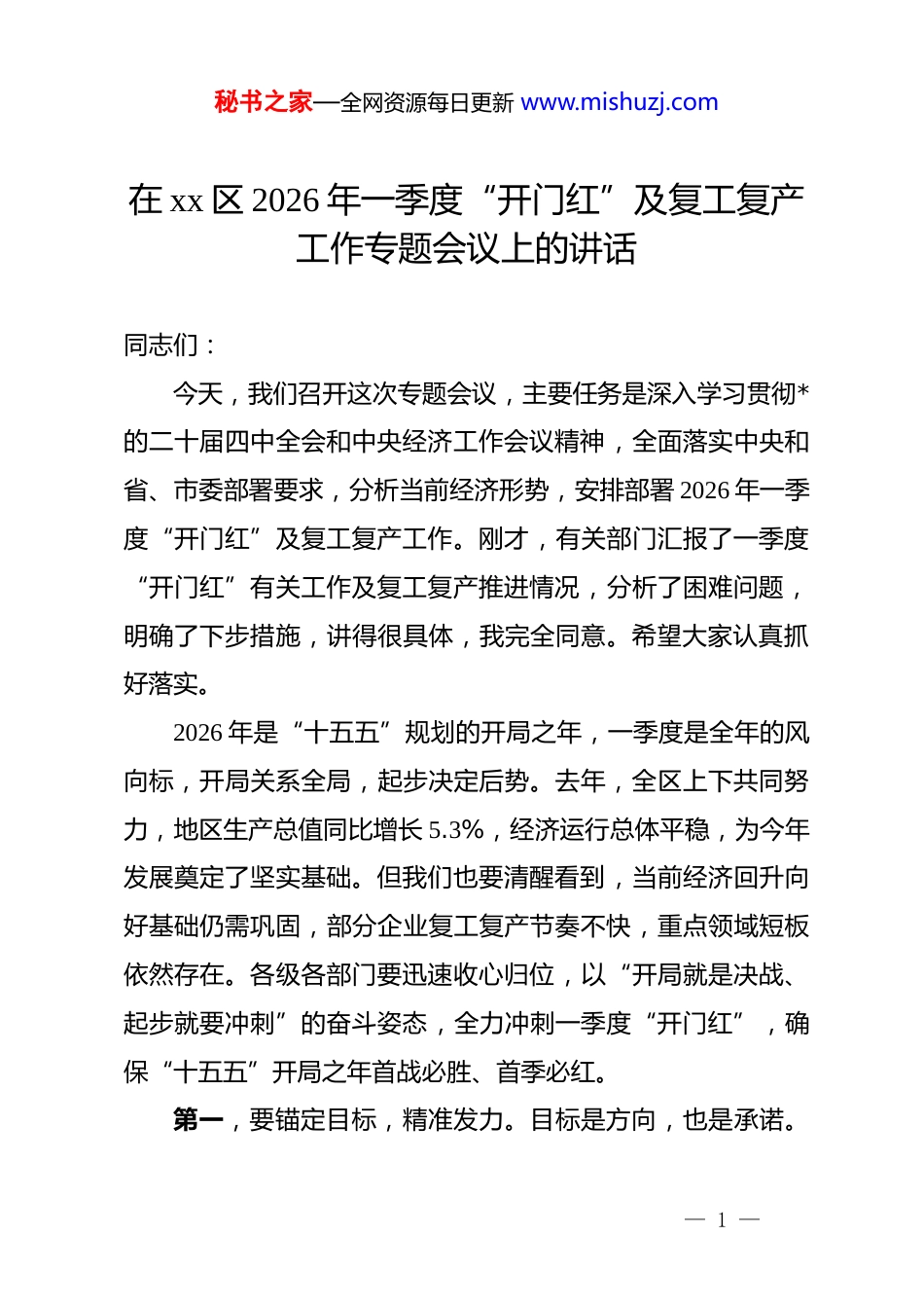 秘书之家—全网资源每日更新 www.mishuzj.com在 xx 区 2026 年一季度“开门红”及复工复产工作专题会议上的讲话同志们:今天,我们召开这次专题会议,主要任务是深入学习贯彻*的二十届四中全会和中央经济工作会议精神,全面落实中央和省、市委部署要求,分析当前经济形势,安排部署 2026 年一季度“开门红”及复工复产工作。刚才,有关部门汇报了一季度“开门红”有关工作及复工复产推进情况,分析了困难问题,明确了下步措施,讲得很具体,我完全同意。希望大家认真抓好落实。2026 年是“十五五”规划的开局之年,一季度是全年的风向标,开局关系全局,起步决定后势。去年,全区上下共同努力,地区生产总值同比增长 5.3%,经济运行总体平稳,为今年发展奠定了坚实基础。但我们也要清醒看到,当前经济回升向好基础仍需巩固,部分企业复工复产节奏不快,重点领域短板依然存在。各级各部门要迅速收心归位,以“开局就是决战、起步就要冲刺”的奋斗姿态,全力冲刺一季度“开门红”,确保“十五五”开局之年首战必胜、首季必红。第一,要锚定目标,精准发力。目标是方向,也是承诺。— 1 —秘书之家—全网资源每日更新 www.mishuzj.com我们要紧盯一季度目标任务,找准短板弱项,合力攻坚克难。根据测算,今年一季度全区地区生产总值增长目标设定在 5.5%以上,规模以上工业增加值增长 9%以上。这些指标是经过慎重研究确定的,既考虑了需要,也兼顾了可能。各单位要对照目标,逐项分解任务,把责任落实到具体项目、具体企业、具体人头。对于进度滞后的指标,要深入分析原因,制定专项方案,实行挂图作战,确保各项任务不折不扣完成。统计部门要坚持依法统计,坚决杜绝统计造假,确保数据真实反映经济发展成效。第二,要抢抓时间,能快则快。时间不等人,机遇不等人。要把复工复产作为首要任务,深入企业做好服务,帮助把复工时间往前赶、把生产节奏提上来。工信部门要全面摸排企业复工情况,建立台账,分类指导。对于已复工企业,要支持其尽快达产满产;对于未复工企业,要主动上门了解困难,协调解决用工、用能、物流等问题。同时,要严把安全关,压实企业安全生产主体责任。企业复工复产前,必须全面检修设施设备,进行隐患排查整改,落实安全措施。未经隐患排查治理和安全验收,不得复工复产。要开展“开工安全第一课”,加强员工安全教育培训,提高安全意识和技能,坚决杜绝安全生产事故发生。— 2 —秘书之家—全网资源每日更新 www.mishuzj.com第三,要聚焦重点,靶向攻坚。经济发展千头万绪,必须抓住牛鼻子。针对工业、投资、消费、房地产、劳动工资、招商引资等领域的短板弱项,要精准施策,以重点突破带动全局提升。工业方面,要支持重点企业扩大生产,推动新项目早日投产,确保工业增加值稳步增长。投资方面,要加快项目建设进度,特别是重大基础设施项目和产业项目,要形成更多实物工作量。消费方面,要结合春节后消费旺季,举办促消费活动,激发市场活力。房地产方面,要落实相关政策,支持刚性和改善性住房需求,促进房地产市场平稳健康发展。招商引资方面,要围绕主导产业和产业链进行招商,引进龙头企业项目,补链强链,增强产业发展后劲。第四,要主动服务,纾困解难。企业是经济的细胞,企业好,经济才好。要深入落实“五帮”升级版要求,加大政策宣贯力度,确保红利直达快享。具体而言,就是要帮企业融资,协调金融机构加大信贷支持,解决企业资金周转困难;帮企业培训,组织职业技能培训,满足企业用工需求;帮企业减负,落实减税降费政策,降低企业运营成本;帮企业创业,支持创新创业,培育新的经济增长点;帮企业解惑,及时解答企业政策疑问,提供专业指导。要建立健全“发现问题、限时解决、及时反馈”的工作闭环,增强企业发展信心。各部门要主动靠— 3 —秘书之家—全网资源每日更新 www.mishuzj.com前服务,不能坐在办公室里等企业上门,要深入一线,现场办公,切实解决企业实际困难。第五,要强化统筹,压实责任。工作落实,关键在责任。要强化统筹调度,领导带头深入一线,部门主动履职尽责,深入企业、项目一线协调解决问题。要加强与...