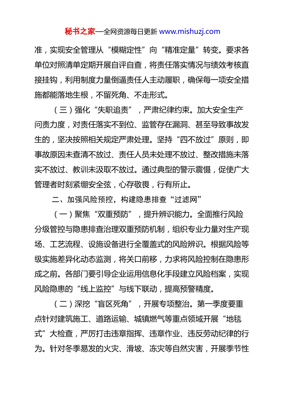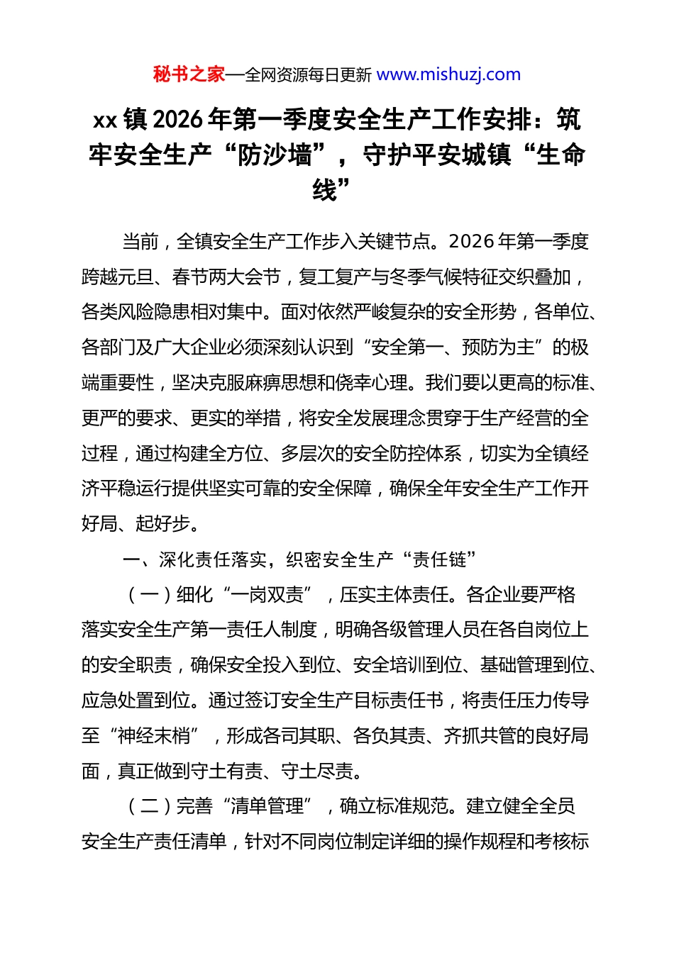 秘书之家—全网资源每日更新 www.mishuzj.comxx 镇 2026 年第一季度安全生产工作安排:筑牢安全生产“防沙墙”,守护平安城镇“生命线”当前,全镇安全生产工作步入关键节点。2026 年第一季度跨越元旦、春节两大会节,复工复产与冬季气候特征交织叠加,各类风险隐患相对集中。面对依然严峻复杂的安全形势,各单位、各部门及广大企业必须深刻认识到“安全第一、预防为主”的极端重要性,坚决克服麻痹思想和侥幸心理。我们要以更高的标准、更严的要求、更实的举措,将安全发展理念贯穿于生产经营的全过程,通过构建全方位、多层次的安全防控体系,切实为全镇经济平稳运行提供坚实可靠的安全保障,确保全年安全生产工作开好局、起好步。一、深化责任落实,织密安全生产“责任链”(一)细化“一岗双责”,压实主体责任。各企业要严格落实安全生产第一责任人制度,明确各级管理人员在各自岗位上的安全职责,确保安全投入到位、安全培训到位、基础管理到位、应急处置到位。通过签订安全生产目标责任书,将责任压力传导至“神经末梢”,形成各司其职、各负其责、齐抓共管的良好局面,真正做到守土有责、守土尽责。(二)完善“清单管理”,确立标准规范。建立健全全员安全生产责任清单,针对不同岗位制定详细的操作规程和考核标秘书之家—全网资源每日更新 www.mishuzj.com准,实现安全管理从“模糊定性”向“精准定量”转变。要求各单位对照清单定期开展自评自查,将责任落实情况与绩效考核直接挂钩,利用制度力量倒逼责任人主动履职,确保每一项安全措施都能落地生根,不留死角、不走形式。(三)强化“失职追责”,严肃纪律约束。加大安全生产问责力度,对责任落实不到位、监管存在漏洞、甚至导致事故发生的,坚决按照相关规定严肃处理。坚持“四不放过”原则,即事故原因未查清不放过、责任人员未处理不放过、整改措施未落实不放过、教训未汲取不放过。通过典型的警示震慑,促使广大管理者时刻紧绷安全弦,心存敬畏,行有所止。二、加强风险预控,构建隐患排查“过滤网”(一)聚焦“双重预防”,提升辨识能力。全面推行风险分级管控与隐患排查治理双重预防机制,组织专业力量对生产现场、工艺流程、设施设备进行全覆盖式的风险辨识。根据风险等级实施差异化动态监测,将关口前移,力求将风险控制在隐患形成之前。各部门要引导企业运用信息化手段建立风险档案,实现风险隐患的“线上监控”与线下联动,提高预警精度。(二)深挖“盲区死角”,开展专项整治。第一季度要重点针对建筑施工、道路运输、城镇燃气等重点领域开展“地毯式”大检查,严厉打击违章指挥、违章作业、违反劳动纪律的行为。针对冬季易发的火灾、滑坡、冻灾等自然灾害,开展季节性秘书之家—全网资源每日更新 www.mishuzj.com专项巡查。通过聘请第三方专家参与检查,以专业眼光审视潜在威胁,确保隐患排查见底、整改清零,不给事故留有余地。(三)落实“闭环管理”,确保整改实效。针对检查中发现的问题隐患,必须按照“五定原则”落实整改,即定整改责任人、定整改措施、定整改完成时间、定整改完成标准、定整改验收人。建立隐患整改销号制度,做到排查一个、登记一个、整改一个、销号一个。对重大隐患实行挂牌督办,跟踪督察整改进度,确保隐患治理形成闭合回路,坚决防止“虚假整改”和“反弹回潮”。三、提升应急能力,架起生命安全“防护墙”(一)优化“预案体系”,提高响应速度。各单位要结合第一季度气候特点及节假日生产实际,进一步修订完善各类生产安全事故应急预案,确保预案的科学性、针对性和可操作性。加强预案之间的衔接配合,构建起上下贯通、左右联动的应急指挥网络。定期开展预案评审,针对演练中暴露出的问题及时进行动态调整,确保在关键时刻预案能“拿得出、用得上、打得赢”。(二)强化“演练实操”,增强避险技能。各部门应组织开展针对性强的综合应急演练和专项避险训练,特别是针对高层火灾、危险化学品泄漏、有限空间作业等高风险场景。通过模拟真实环境,让从业人员熟练掌握灭火器、自救呼吸器等应急器材的使用方法,熟悉疏散逃生路线。坚持“实战导向”,通过不打秘书之家...