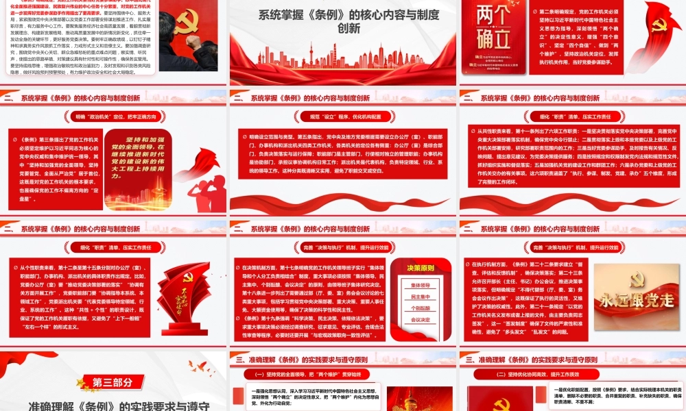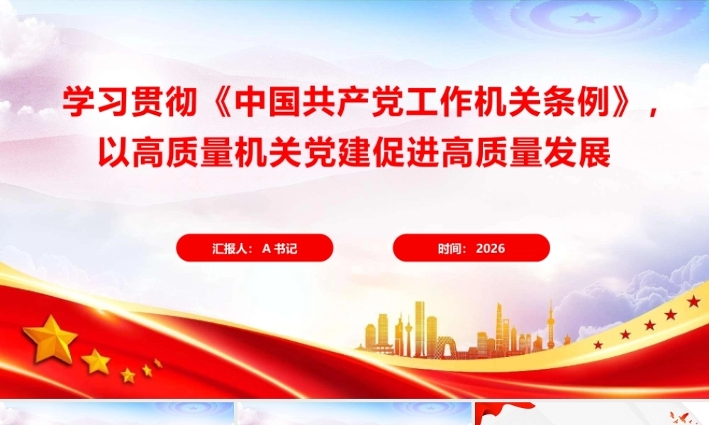 汇报人: A 书记时间: 2026学习贯彻《中国共产党工作机关条例》,以高质量机关党建促进高质量发展 党的工作机关在实施党的领导、加强党的建设、推进党的事业中发挥着重要作用。新修订的《中国共产党工作机关条例》日前发布,这是健全党的领导制度体系、加强党的组织制度建设的重要举措。《条例》以习近平新时代中国特色社会主义思想为指导,巩固党和国家机构改革成果,进一步强化对党的工作机关的政治要求,规范党的工作机关的设立和运行,为全面加强和规范党的工作机关工作明确了基本遵循。党的各级工作机关要认真贯彻落实《条例》,自觉服从服务于党的中心工作,不断提高政治能力、履职能力和工作水平,为新征程党和国家事业发展提供坚强组织保障。目录深刻把握《条例》修订的时代背景与重大意义01 系统掌握《条例》的核心内容与制度创新02 准确理解《条例》的实践要求与遵守原则03 《中国共产党工作机关条例》全文内容04 扎实推进《条例》的贯彻落实与长效保障05第一部分深刻把握《条例》修订的时代背景与重大意义一、 深刻把握《条例》修订的时代背景与重大意义 无论是革命战争年代统筹作战指挥、动员群众力量,还是新中国成立后推进国家建设、夯实执政基础,再到改革开放以来协调各方资源、推动经济社会发展,党的工作机关始终是党“如身使臂、如臂使指”的执行中枢。 2017 年首次发布的《中国共产党工作机关条例(试行)》,为党的工作机关设立运行提供了基本遵循,但随着实践发展,部分条款已难以完全适应新形势新要求,修订完善成为必然。从历史逻辑来看,党的工作机关在革命、建设、改革各个时期都发挥了关键作用一、 深刻把握《条例》修订的时代背景与重大意义从现实需求来看,当前我们党正团结带领全国各族人民推进具有许多新的历史特点的伟大斗争、党的建设新的伟大工程、中国特色社会主义伟大事业 党和国家机构改革取得重大成果,需要通过《条例》修订巩固改革成效,进一步理顺党的工作机关职能体系; 面对复杂多变的国际形势、艰巨繁重的国内改革发展稳定任务,需要通过强化党的工作机关建设,提升党统筹全局、协调各方的能力。一、 深刻把握《条例》修订的时代背景与重大意义 《条例》作为规范党的工作机关的基础主干法规,其修订既与《中国共产党党组工作条例》《中国共产党地方委员会工作条例》相衔接,又针对党的工作机关特点细化制度要求,进一步填补了制度空白,为党的组织体系建设提供了更坚实的制度支撑。从制度建设来看,《条例》修订是完善党的组织制度体系的关键一环一、 深刻把握《条例》修订的时代背景与重大意义 党的工作机关作为党的机关,直接在党中央以及地方各级党委领导下工作,必须旗帜鲜明讲政治,增强“四个意识”、坚定“四个自信”、做到“两个维护”,充分彰显政治机关本色。要按照《条例》要求,把坚定维护以习近平同志为核心的党中央权威和集中统一领导作为履行职责、开展工作的根本政治原则,坚决听从党中央指挥,自觉向党中央看齐,同党中央要求对标对表,把牢政治方向,严守政治纪律和政治规矩,始终在思想上政治上行动上同以习近平同志为核心的党中央保持高度一致。要持续用党的创新理论统一思想、统一意志、统一行动,善于从政治上把握大局、分析问题、推进工作。要坚持以党的政治建设为统领,持续深化政治机关意识教育,引导党员干部不断提高政治判断力、政治领悟力、政治执行力,切实把对“两个确立”决定性意义的深刻领悟转化为坚决做到“两个维护”的高度自觉和实际行动。(一)要把牢政治机关定位《中国共产党工作机关条例》一、 深刻把握《条例》修订的时代背景与重大意义 党的工作机关是落实党中央以及地方各级党委决策部署的执行机关,职能作用发挥得好不好,事关党的理论和路线方针政策贯彻执行,事关党和国家事业发展。《条例》明确规定,党的工作机关首要职责是坚决贯彻落实党中央决策部署。要完善党中央重大决策部署和习近平总书记重要指示批示精神落实机制,确保党中央令行禁止。要深刻领会《条例》精神,提高政治站位,深化思想认识,紧扣自身职责强化制度机制保障,增强抓落实的政治自觉和政...