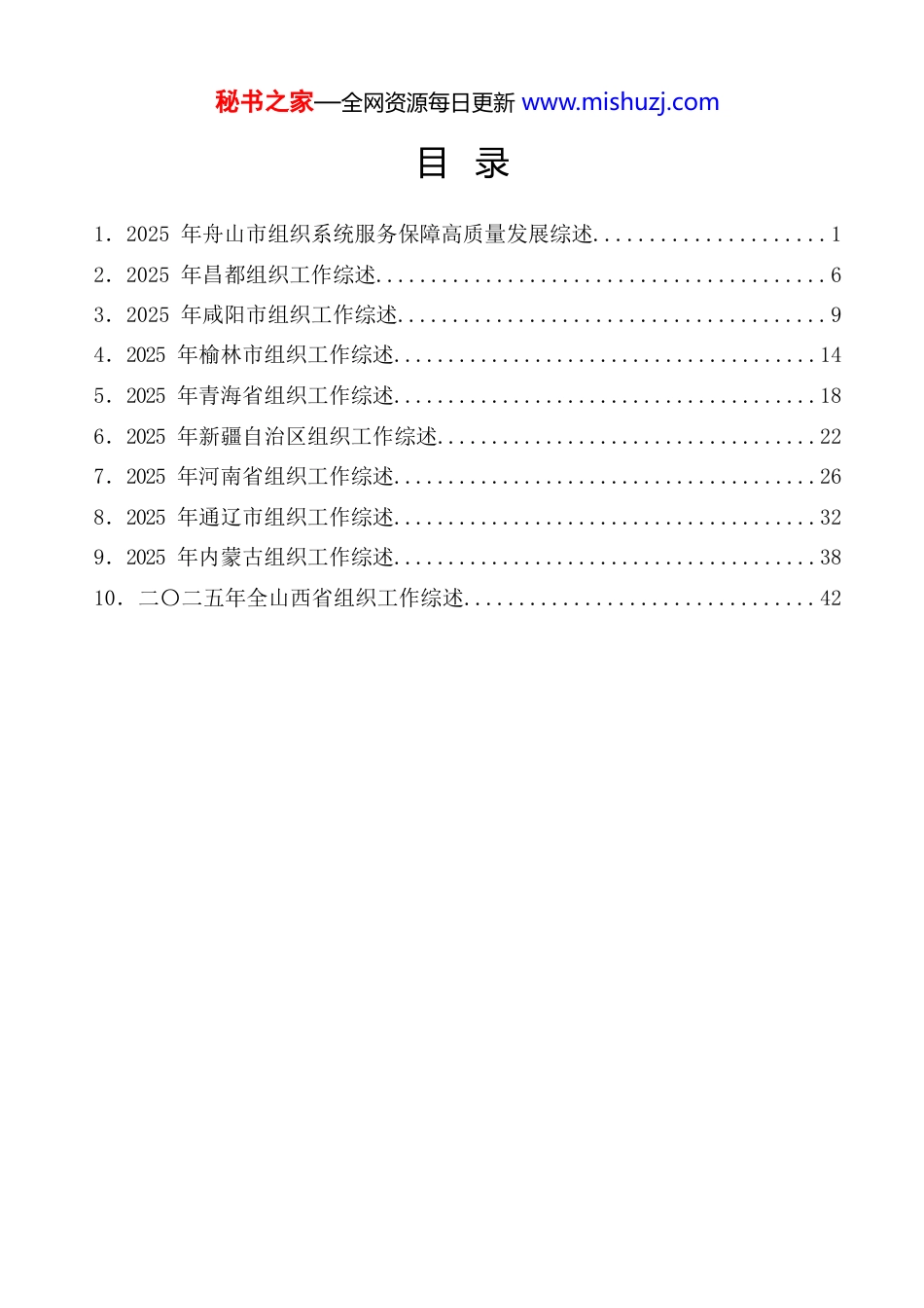 秘书之家—全网资源每日更新 www.mishuzj.com目 录1.2025 年舟山市组织系统服务保障高质量发展综述.....................1 2.2025 年昌都组织工作综述.........................................6 3.2025 年咸阳市组织工作综述.......................................9 4.2025 年榆林市组织工作综述.......................................14 5.2025 年青海省组织工作综述.......................................18 6.2025 年新疆自治区组织工作综述...................................22 7.2025 年河南省组织工作综述.......................................26 8.2025 年通辽市组织工作综述.......................................32 9.2025 年内蒙古组织工作综述.......................................38 10.二〇二五年全山西省组织工作综述................................42 秘书之家—全网资源每日更新 www.mishuzj.com秘书之家—全网资源每日更新 www.mishuzj.com淬炼初心担使命 砥砺奋进开新局2025 年舟山市组织系统服务保障高质量发展综述(2026 年 2 月 10 日)岁序常易,华章日新。重大项目建设现场,党旗如炬,照亮攻坚破难的奋进之路;远洋渔船甲板之上,“海上党课”声声入耳,筑牢漂泊四方的信仰之基;科技创新前沿阵地, “产业教授”破壁而入、“科技副总”驻企深耕,共同点燃海洋经济高质量发展的强劲引擎。从惊涛拍岸的渔场到星罗棋布的海岛,从机器轰鸣的项目工地到烟火氤氲的渔农村,一面面鲜艳的党旗迎风招展,引领着舟山这座海洋城市在时代浪潮中勇毅前行,在万顷碧波间,奏响高质量组织工作服务保障高质量发展的雄浑协奏曲。过去一年,全市组织系统深入学习贯彻习近平新时代中国特色社会主义思想,紧扣省委“132”总体工作部署和市委中心大局,深化政治建设铸魂提能、干部队伍培优提档、人才工作筑峰提级、基层基础攀高提质等重点工作,持续提升组工品牌影响力和辨识度,为加快建设现代海洋城市、奋力谱写中国式现代化舟山新篇章提供坚强组织保证。一、凝心铸魂强党性政治建设走深走实固根本过去一年,全市组织系统坚持把政治建设摆在首位,坚持不懈用党的创新理论凝心铸魂,开展深入贯彻中央八项规定精神学习教育,以“走前列、作示范”标准定位,一体推进学习教育“学、查、改、促”,带动全市 4820 个基层党组织和 8.72 万名党员深学细悟、整改提升,在一场场直抵灵魂的作风洗礼中,接受政治历练、思想淬炼、作风锤炼。在理论武装上持续发力,让党的创新理论落地生根、入脑入心。全市组织系统将政治训练贯穿干部教育培训全过程,创新打造“海上党校”,健全完善海洋经济课程体系。深化“千岛干部讲学比评”,首创“专家讲理论、局长讲业务”“双讲”模式,举办基本培训班次 108 期,实现模块化党员培训全覆盖在政治监督中精准发力,为事业发展保驾护航、校准方向。开展贯彻落实秘书之家—全网资源每日更新 www.mishuzj.com“第一议题”制度调研,督促全面自查、即时整改。健全政治素质考察常态化机制和政绩观考察闭环评估机制,选派 12 名政绩观察员对 30 余个重大项目开展秘书之家—全网资源每日更新 www.mishuzj.com蹲点监督。二、护航大局显担当服务发展精准有力促跨越全市组织系统始终聚焦组织路线服务政治路线根本要求,将组织工作放到现代海洋城市建设的大局中去谋划、推进、落实,找准服务保障的切入点和着力点,以精准高效的组织举措为各项重点工作落地见效赋能添力。聚焦大宗商品资源配置枢纽建设这一国家战略,选配 105 名专业干部到国家战略攻坚一线,为九大产业牵头部门新配备 40 岁左右专业干部 11 名;完善“以考促干”助力重大项目机制,将 50 项省市重点项目关联至 136 名市管干部,全面推进重大项目顺利实施。全年新引进大宗商品人才 7000 余人。在优化营商环境的战场上,组织力量冲锋在前。去年,我市迭代退职干部助企工作机制,深化“一企一服务”模式,两批次选派 58 名企业服务专员,帮助解决行政审批、生产经营等问题 198 个;完善“一对一”人才...