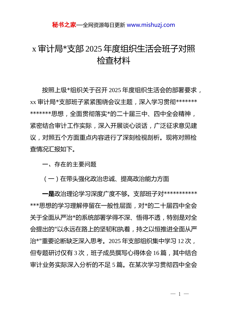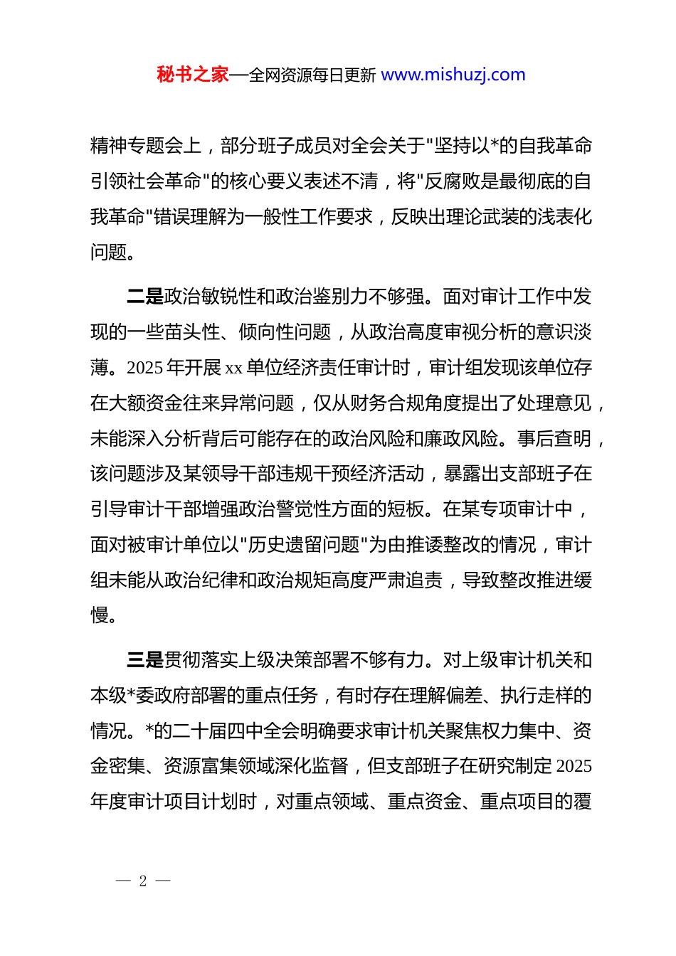 秘书之家—全网资源每日更新 www.mishuzj.comx 审计局*支部 2025 年度组织生活会班子对照检查材料按照上级*组织关于召开 2025 年度组织生活会的部署要求,xx 审计局*支部班子紧紧围绕会议主题,深入学习贯彻**************思想,全面贯彻落实*的二十届三中、四中全会精神,紧密结合审计工作实际,深入开展谈心谈话,广泛征求意见建议,对照五个方面重点内容进行了深刻检视剖析。现将对照检查情况汇报如下。一、存在的主要问题(一)在带头强化政治忠诚、提高政治能力方面一是政治理论学习深度广度不够。支部班子对**************思想的学习理解停留在一般性层面,对*的二十届四中全会关于全面从严治*的系统部署学得不深、悟得不透,特别是对全会提出的"以永远在路上的坚韧和执着,持之以恒推进全面从严治*"重要论断缺乏深入思考。2025 年支部组织集中学习 12 次,但专题研讨仅有 3 次,班子成员撰写心得体会 16 篇,其中结合审计业务实际深入分析的不足 5 篇。在某次学习贯彻四中全会— 1 —秘书之家—全网资源每日更新 www.mishuzj.com精神专题会上,部分班子成员对全会关于"坚持以*的自我革命引领社会革命"的核心要义表述不清,将"反腐败是最彻底的自我革命"错误理解为一般性工作要求,反映出理论武装的浅表化问题。二是政治敏锐性和政治鉴别力不够强。面对审计工作中发现的一些苗头性、倾向性问题,从政治高度审视分析的意识淡薄。2025 年开展 xx 单位经济责任审计时,审计组发现该单位存在大额资金往来异常问题,仅从财务合规角度提出了处理意见,未能深入分析背后可能存在的政治风险和廉政风险。事后查明,该问题涉及某领导干部违规干预经济活动,暴露出支部班子在引导审计干部增强政治警觉性方面的短板。在某专项审计中,面对被审计单位以"历史遗留问题"为由推诿整改的情况,审计组未能从政治纪律和政治规矩高度严肃追责,导致整改推进缓慢。三是贯彻落实上级决策部署不够有力。对上级审计机关和本级*委政府部署的重点任务,有时存在理解偏差、执行走样的情况。*的二十届四中全会明确要求审计机关聚焦权力集中、资金密集、资源富集领域深化监督,但支部班子在研究制定 2025年度审计项目计划时,对重点领域、重点资金、重点项目的覆— 2 —秘书之家—全网资源每日更新 www.mishuzj.com盖不够全面,安排的 23 个审计项目中,涉及民生资金、重大投资项目的仅 8 个,占比 34.8%。在落实"审计结果转化为治理效能"的要求上,2025 年开展的 15 个经济责任审计项目,审计发现问题 187 个,推动建立完善制度 21 项,但仍有 43 个问题整改不到位,整改率仅为 77%,反映出执行力不强的问题。(二)在带头固本培元、增强*性方面一是*性锤炼的主动性和自觉性不够。支部班子在抓*性教育上方式方法单一,满足于完成规定动作,缺乏创新载体和有效抓手。2025 年"三会一课"基本按部就班完成,但主题*日活动12 次中有 6 次为传达文件、集中学习,缺乏实践体验和情感共鸣。组织班子成员赴 xx 红色教育基地开展*性教育时,部分同志存在走过场心态,在缅怀革命先烈环节交头接耳、态度散漫,未能真正触及思想灵魂。在年度民主评议*员中,班子成员自评材料内容雷同度较高,相互批评环节"好人主义"倾向明显,5 名班子成员相互提出批评意见仅 7 条,且多为"学习不够系统""深入基层不够"等隔靴搔痒式意见。二是*内政治生活的严肃性不强。支部班子对组织生活会的政治性、严肃性认识不足,批评与自我批评武器运用不好。2024 年度组织生活会上,班子成员自我批评避重就轻,谈工作— 3 —秘书之家—全网资源每日更新 www.mishuzj.com多、谈思想少,谈成绩多、谈问题少,相互批评顾虑重重、轻描淡写。在讨论决定重大事项时,有时存在"一言堂"现象,对xx 审计项目外包服务采购事项,仅由主要负责人和分管领导商议后即予确定,未经支部会议集体研究,程序不够规范。部分班子成员参加双重组织生活不经常,以工作忙为由缺席支部活动,全年出勤率最低的仅为 75%。三是理想信念根基扎得不牢。面对新形势下审计工作面临的新挑战新考验,部分班子成员理想信...