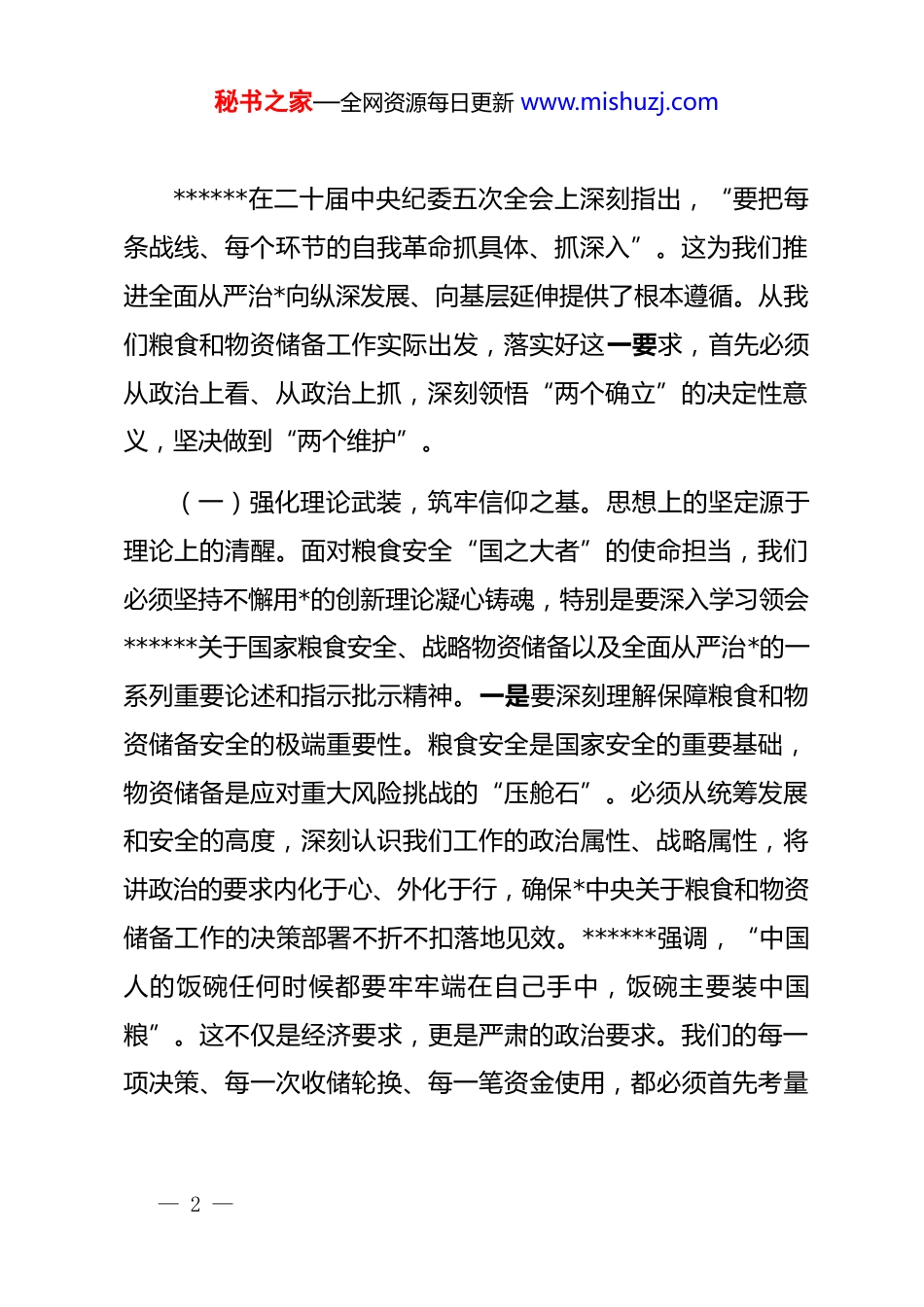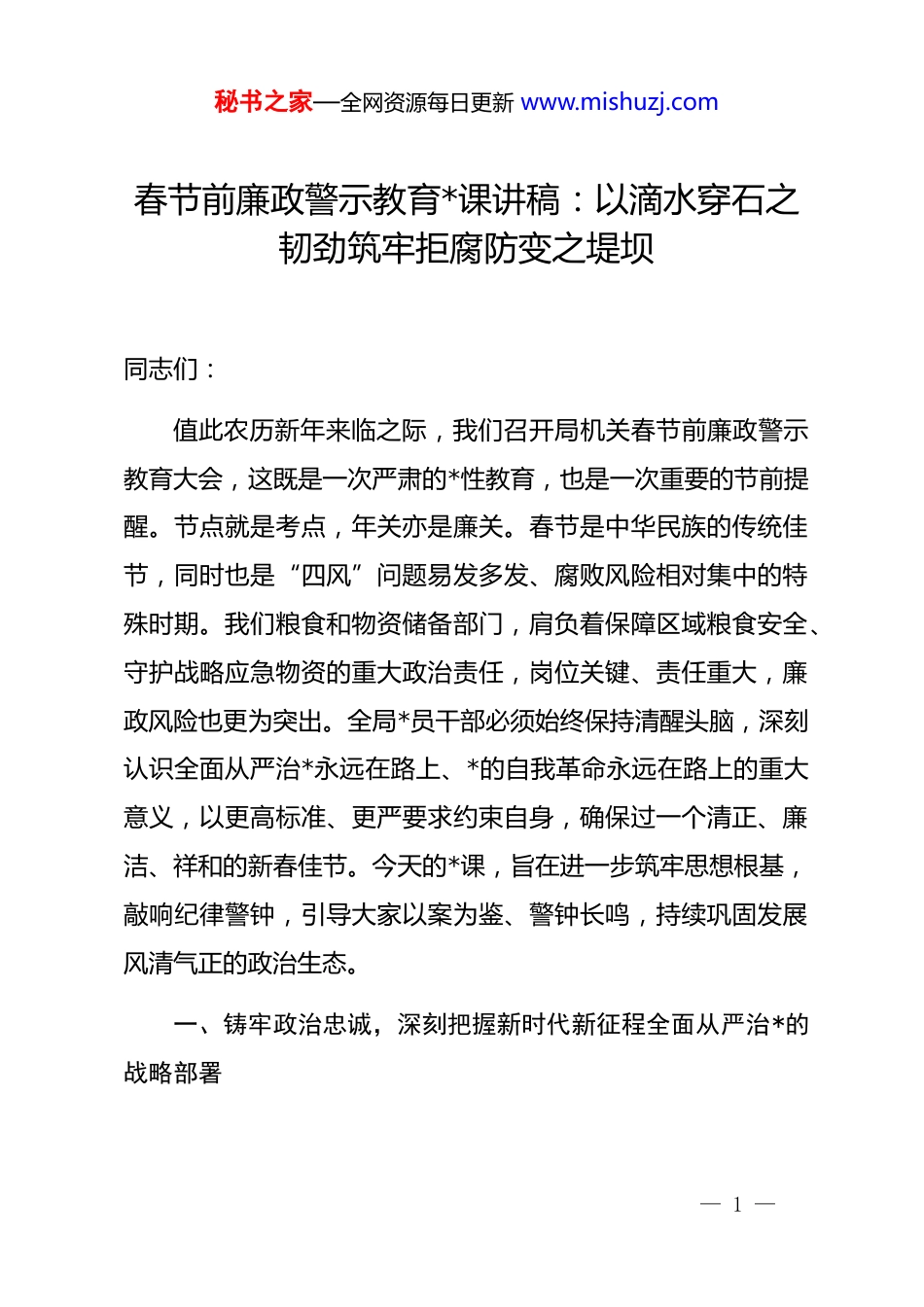 秘书之家—全网资源每日更新 www.mishuzj.com春节前廉政警示教育*课讲稿:以滴水穿石之韧劲筑牢拒腐防变之堤坝同志们:值此农历新年来临之际,我们召开局机关春节前廉政警示教育大会,这既是一次严肃的*性教育,也是一次重要的节前提醒。节点就是考点,年关亦是廉关。春节是中华民族的传统佳节,同时也是“四风”问题易发多发、腐败风险相对集中的特殊时期。我们粮食和物资储备部门,肩负着保障区域粮食安全、守护战略应急物资的重大政治责任,岗位关键、责任重大,廉政风险也更为突出。全局*员干部必须始终保持清醒头脑,深刻认识全面从严治*永远在路上、*的自我革命永远在路上的重大意义,以更高标准、更严要求约束自身,确保过一个清正、廉洁、祥和的新春佳节。今天的*课,旨在进一步筑牢思想根基,敲响纪律警钟,引导大家以案为鉴、警钟长鸣,持续巩固发展风清气正的政治生态。一、铸牢政治忠诚,深刻把握新时代新征程全面从严治*的战略部署— 1 —秘书之家—全网资源每日更新 www.mishuzj.com******在二十届中央纪委五次全会上深刻指出,“要把每条战线、每个环节的自我革命抓具体、抓深入”。这为我们推进全面从严治*向纵深发展、向基层延伸提供了根本遵循。从我们粮食和物资储备工作实际出发,落实好这一要求,首先必须从政治上看、从政治上抓,深刻领悟“两个确立”的决定性意义,坚决做到“两个维护”。(一)强化理论武装,筑牢信仰之基。思想上的坚定源于理论上的清醒。面对粮食安全“国之大者”的使命担当,我们必须坚持不懈用*的创新理论凝心铸魂,特别是要深入学习领会******关于国家粮食安全、战略物资储备以及全面从严治*的一系列重要论述和指示批示精神。一是要深刻理解保障粮食和物资储备安全的极端重要性。粮食安全是国家安全的重要基础,物资储备是应对重大风险挑战的“压舱石”。必须从统筹发展和安全的高度,深刻认识我们工作的政治属性、战略属性,将讲政治的要求内化于心、外化于行,确保*中央关于粮食和物资储备工作的决策部署不折不扣落地见效。******强调,“中国人的饭碗任何时候都要牢牢端在自己手中,饭碗主要装中国粮”。这不仅是经济要求,更是严肃的政治要求。我们的每一项决策、每一次收储轮换、每一笔资金使用,都必须首先考量— 2 —秘书之家—全网资源每日更新 www.mishuzj.com其政治效果,确保经得起历史和人民的检验。二是要系统掌握推进自我革命的科学方法论。*的自我革命是我们*跳出治乱兴衰历史周期率的第二个答案。要深入学习领会*在长期实践中形成的关于自我净化、自我完善、自我革新、自我提高的制度规范和宝贵经验,理解其内在逻辑和实践要求。特别是要结合我局实际,思考如何在项目审批、资金管理、物资采购、仓储监管等关键环节,嵌入自我革命的理念和方法,主动查找风险、堵塞漏洞。三是要自觉运用立场观点方法指导实践。学习的目的全在于应用。要坚持学思用贯通、知信行统一,将学习成果转化为谋划工作的思路、推动发展的举措、防范风险的能力。要善于运用*的创新理论中蕴含的立场观点方法,分析研判我市粮食物资储备领域面临的新形势新挑战,找准廉政风险点,提出有针对性的防控措施,把学习成效体现到保障区域粮食安全和物资储备安全的实际工作中。(二)严守纪律规矩,划清行为底线。纪律是管*治*的“戒尺”,也是*员干部约束自身行为的标准和遵循。粮食和物资储备工作政策性、专业性、涉密性强,必须把纪律建设摆在更加突出的位置。一是要全方位学习掌握 dj 法规。新修订的《中国共产 dj 律处分条例》是管*治*的重要基础性法规。全体— 3 —秘书之家—全网资源每日更新 www.mishuzj.com*员干部要逐章逐条学、联系实际学,搞清楚 d 的纪律规矩是什么,弄明白能干什么、不能干什么。要重点学习掌握政治纪律、组织纪律、廉洁纪律、群众纪律、工作纪律、生活纪律的具体要求,特别是与粮食购销、储备管理、项目建设、财务管理等密切相关的条款,做到学纪、知纪、明纪、守纪。二是要将纪律教育与警示教育深度融合。通过经常性纪律教育,让*员干部重视、警醒、知止。要把警示教育作为纪律教育的重要载体,用身边事...