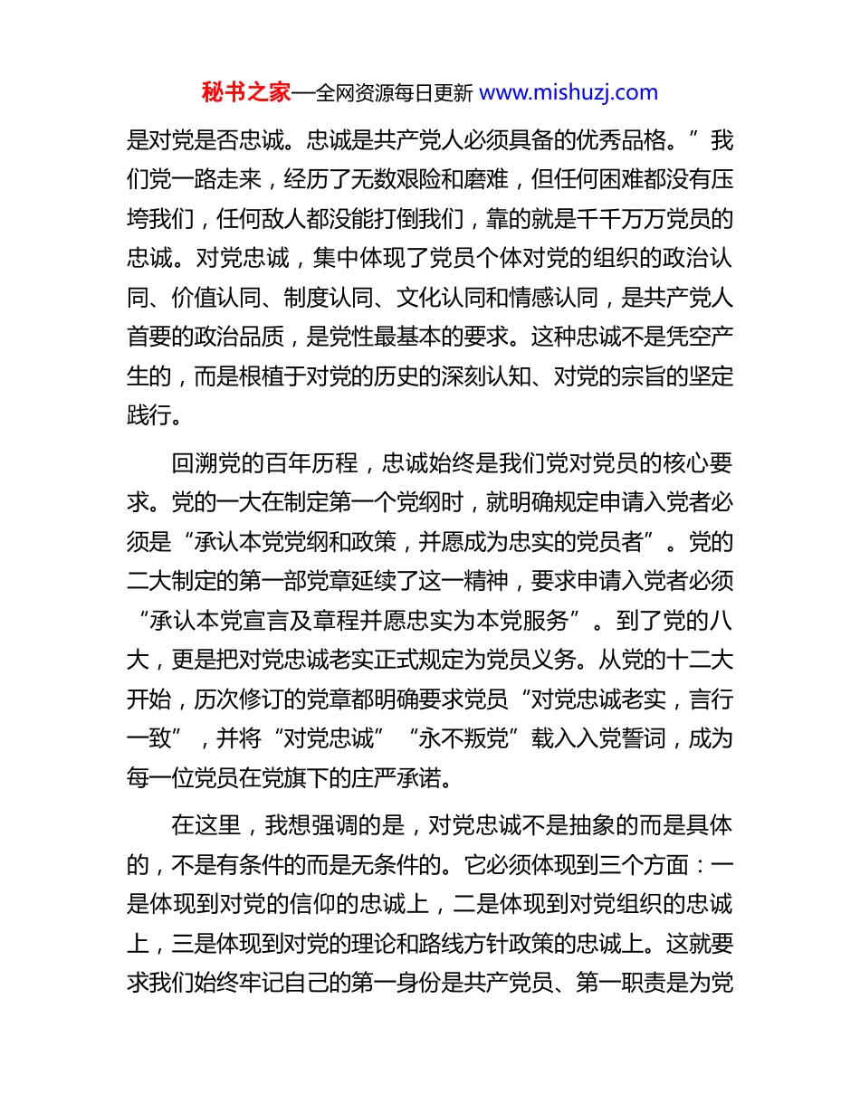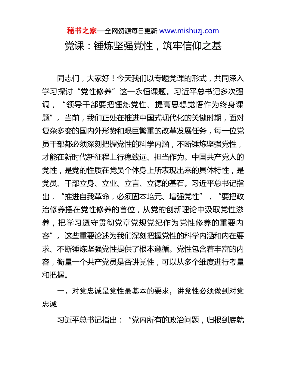 秘书之家—全网资源每日更新 www.mishuzj.com党课:锤炼坚强党性,筑牢信仰之基同志们,大家好!今天我们以专题党课的形式,共同深入学习探讨“党性修养”这一永恒课题。习近平总书记多次强调,“领导干部要把锤炼党性、提高思想觉悟作为终身课题”。当前,我们正处在推进中国式现代化的关键时期,面对复杂多变的国内外形势和艰巨繁重的改革发展任务,每一位党员干部都必须深刻把握党性的科学内涵,不断锤炼坚强党性,才能在新时代新征程上行稳致远、担当作为。中国共产党人的党性,是党的性质在党员个体身上所表现出来的具体特性,是党员、干部立身、立业、立言、立德的基石。习近平总书记指出,“推进自我革命,必须固本培元、增强党性”,“要把政治修养摆在党性修养的首位,从党的创新理论中汲取党性滋养,把学习遵守贯彻党章党规党纪作为党性修养的重要内容”。这些重要论述为我们深刻把握党性的科学内涵和内在要求、不断锤炼坚强党性提供了根本遵循。党性包含着丰富的内容,衡量一个共产党员是否讲党性,可以从多个维度进行考量和把握。一、对党忠诚是党性最基本的要求,讲党性必须做到对党忠诚习近平总书记指出:“党内所有的政治问题,归根到底就秘书之家—全网资源每日更新 www.mishuzj.com是对党是否忠诚。忠诚是共产党人必须具备的优秀品格。”我们党一路走来,经历了无数艰险和磨难,但任何困难都没有压垮我们,任何敌人都没能打倒我们,靠的就是千千万万党员的忠诚。对党忠诚,集中体现了党员个体对党的组织的政治认同、价值认同、制度认同、文化认同和情感认同,是共产党人首要的政治品质,是党性最基本的要求。这种忠诚不是凭空产生的,而是根植于对党的历史的深刻认知、对党的宗旨的坚定践行。回溯党的百年历程,忠诚始终是我们党对党员的核心要求。党的一大在制定第一个党纲时,就明确规定申请入党者必须是“承认本党党纲和政策,并愿成为忠实的党员者”。党的二大制定的第一部党章延续了这一精神,要求申请入党者必须“承认本党宣言及章程并愿忠实为本党服务”。到了党的八大,更是把对党忠诚老实正式规定为党员义务。从党的十二大开始,历次修订的党章都明确要求党员“对党忠诚老实,言行一致”,并将“对党忠诚”“永不叛党”载入入党誓词,成为每一位党员在党旗下的庄严承诺。在这里,我想强调的是,对党忠诚不是抽象的而是具体的,不是有条件的而是无条件的。它必须体现到三个方面:一是体现到对党的信仰的忠诚上,二是体现到对党组织的忠诚上,三是体现到对党的理论和路线方针政策的忠诚上。这就要求我们始终牢记自己的第一身份是共产党员、第一职责是为党秘书之家—全网资源每日更新 www.mishuzj.com工作,任何时候任何情况下都相信组织、依靠组织、服从组织,始终以党的旗帜为旗帜、以党的意志为意志、以党的使命为使命。在实际工作中,对党忠诚就是要坚持服从服务政治大局,胸怀“国之大者”、党之大计,牢固树立全国一盘棋思想,坚持小道理服从大道理、地方利益服从国家整体利益,自觉在大局下行动,坚决有力地把党中央决策部署落到实处。X大学的党员教授 X,二十余年深耕软 X 研究领域,主持 X 项国家自然科学基金项目,带领团队攻克多个技术难题,他把对党忠诚落实到“为党育人、为国育才”的具体行动中,指导的学生中有 X 名考取知名高校博士,用科研实绩诠释了党员学者的忠诚担当。同时,对党忠诚既表现为在事关党和人民事业的根本原则问题上,必须立场坚定、态度鲜明,敢于斗争、善于斗争,全力为党护党、兴党强党;也表现为在日常言行中,忠于职守、尽心尽责,积极担当作为,种好党组织交给的“责任田”,踏踏实实干好每一件事。无论是关键时刻的挺身而出,还是日常工作的履职尽责,都是对党忠诚的生动体现。二、党性的根本问题是世界观问题,讲党性必须坚定马克思主义信仰习近平总书记指出:“马克思主义政党不是因利益而结成的政党,而是以共同理想信念而组织起来的政党。”我们党从诞生之日起就把马克思主义理想信念和崇高追求写在自己的旗帜上,坚持以马克思主义为指导,把实现共产主义作为自己的秘书之家—全网资源每日更新 www....