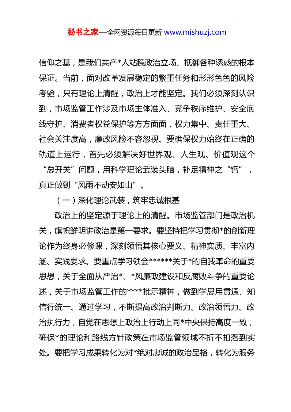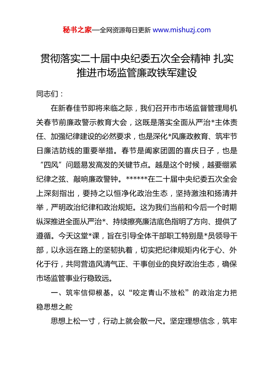 秘书之家—全网资源每日更新 www.mishuzj.com贯彻落实二十届中央纪委五次全会精神 扎实推进市场监管廉政铁军建设同志们:在新春佳节即将来临之际,我们召开市市场监督管理局机关春节前廉政警示教育大会,这既是落实全面从严治*主体责任、加强纪律建设的必然要求,也是深化*风廉政教育、筑牢节日廉洁防线的重要举措。春节是阖家团圆的喜庆日子,也是“四风”问题易发高发的关键节点。越是这个时候,越要绷紧纪律之弦、敲响廉政警钟。******在二十届中央纪委五次全会上深刻指出,要持之以恒净化政治生态,坚持激浊和扬清并举,严明政治纪律和政治规矩。这为我们当前和今后一个时期纵深推进全面从严治*、持续擦亮廉洁底色指明了方向、提供了遵循。今天这堂*课,旨在引导全体干部职工特别是*员领导干部,以永远在路上的坚韧执着,切实把纪律规矩内化于心、外化于行,共同营造风清气正、干事创业的良好政治生态,确保市场监管事业行稳致远。一、筑牢信仰根基,以“咬定青山不放松”的政治定力把稳思想之舵思想上松一寸,行动上就会散一尺。坚定理想信念,筑牢秘书之家—全网资源每日更新 www.mishuzj.com信仰之基,是我们共产*人站稳政治立场、抵御各种诱惑的根本保证。当前,面对改革发展稳定的繁重任务和形形色色的风险考验,只有理论上清醒,政治上才能坚定。我们必须深刻认识到,市场监管工作涉及市场主体准入、竞争秩序维护、安全底线守护、消费者权益保护等方方面面,权力集中、责任重大、社会关注度高,廉政风险不容忽视。要确保权力始终在正确的轨道上运行,首先必须解决好世界观、人生观、价值观这个“总开关”问题,用科学理论武装头脑,补足精神之“钙”,真正做到“风雨不动安如山”。(一)深化理论武装,筑牢忠诚根基政治上的坚定源于理论上的清醒。市场监管部门是政治机关,旗帜鲜明讲政治是第一要求。要坚持把学习贯彻*的创新理论作为终身必修课,深刻领悟其核心要义、精神实质、丰富内涵、实践要求。要重点学习领会******关于*的自我革命的重要思想,关于全面从严治*、*风廉政建设和反腐败斗争的重要论述,关于市场监管工作的****批示精神,做到学思用贯通、知信行统一。通过学习,不断提高政治判断力、政治领悟力、政治执行力,自觉在思想上政治上行动上同*中央保持高度一致,确保*的理论和路线方针政策在市场监管领域不折不扣落到实处。要把学习成果转化为对*绝对忠诚的政治品格,转化为服务秘书之家—全网资源每日更新 www.mishuzj.com高质量发展的实际行动,转化为清正廉洁的价值追求,切实增强“四个意识”、坚定“四个自信”、做到“两个维护”,始终做政治上的明白人、老实人。(二)坚定理想信念,坚守初心使命崇高的理想信念是共产*人的精神支柱和政治灵魂。要深刻认识我们*百余年奋斗历程中理想信念所发挥的至关重要的引领作用,从*的辉煌成就、艰辛历程、历史经验、优良传统中汲取智慧和力量。要时刻牢记市场监管工作“为了谁、依靠谁、我是谁”的根本问题,始终坚持以人民为中心的发展思想,把人民满意不满意作为检验工作成效的根本标准。面对权力、金钱、美色的诱惑,面对监管执法的压力,面对服务对象的请托,要经常对照*章*规 dj 检视自己,对照先进典型反思自己,想一想组织的培养、人民的期望,问一问入*为什么、在岗干什么、身后留什么。只有理想信念坚定,才能在各种考验面前保持定力,在关键时刻挺直脊梁,永葆共产*人拒腐蚀、永不沾的政治本色。(三)严守纪律规矩,校准行为标尺d 的纪律是*的各级组织和全体*员必须遵守的行为规则。******反复强调,要把纪律建设摆在更加突出位置, *规制定、dj 教育、执纪监督全过程都要贯彻严的要求。市场监管干秘书之家—全网资源每日更新 www.mishuzj.com部手握执法权、审批权、监督权,尤其要把纪律规矩刻印在心、落实于行。要深入学习新修订的《中国共产 dj 律处分条例》等*内法规和国家法律法规,搞清楚 d 的纪律规矩是什么,弄明白能干什么、不能干什么。要时刻用纪律这把尺子衡量自己的言行,自觉遵守*的政治纪律、组织纪律、廉洁纪律、群众纪律、工作纪律、生活纪律。要习惯在受监督和...