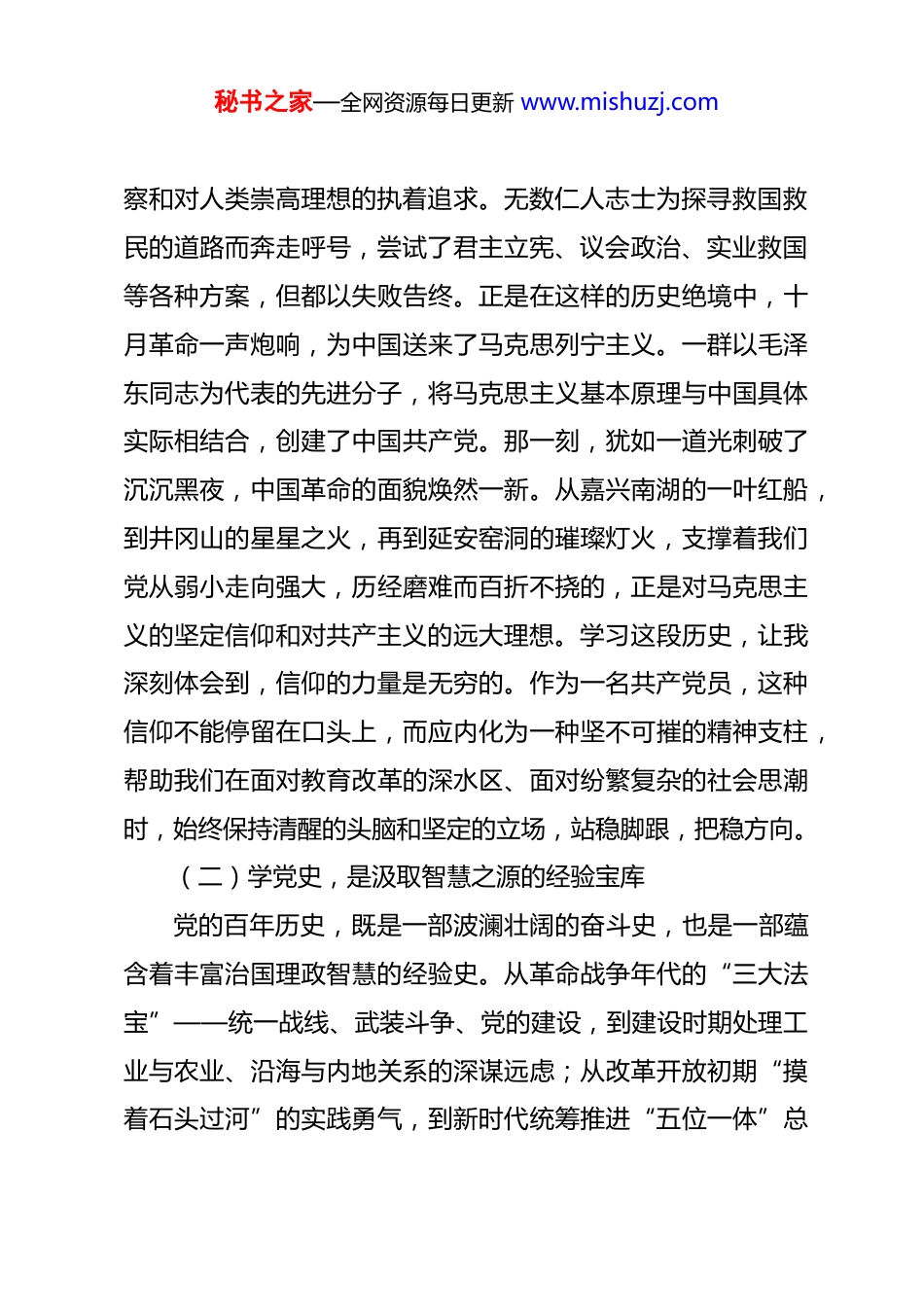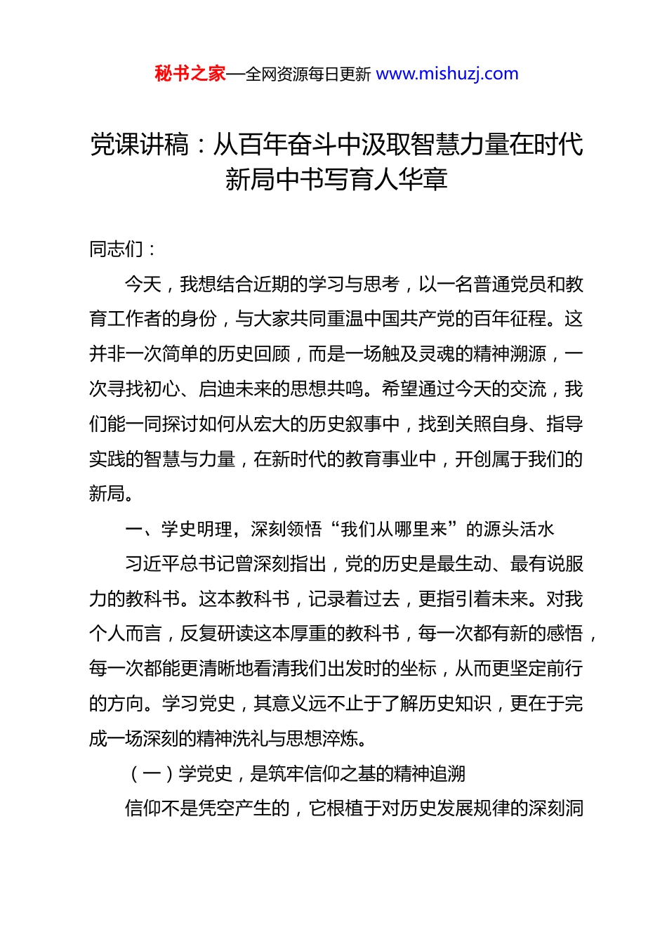 秘书之家—全网资源每日更新 www.mishuzj.com党课讲稿:从百年奋斗中汲取智慧力量在时代新局中书写育人华章 同志们:今天,我想结合近期的学习与思考,以一名普通党员和教育工作者的身份,与大家共同重温中国共产党的百年征程。这并非一次简单的历史回顾,而是一场触及灵魂的精神溯源,一次寻找初心、启迪未来的思想共鸣。希望通过今天的交流,我们能一同探讨如何从宏大的历史叙事中,找到关照自身、指导实践的智慧与力量,在新时代的教育事业中,开创属于我们的新局。一、学史明理,深刻领悟“我们从哪里来”的源头活水习近平总书记曾深刻指出,党的历史是最生动、最有说服力的教科书。这本教科书,记录着过去,更指引着未来。对我个人而言,反复研读这本厚重的教科书,每一次都有新的感悟,每一次都能更清晰地看清我们出发时的坐标,从而更坚定前行的方向。学习党史,其意义远不止于了解历史知识,更在于完成一场深刻的精神洗礼与思想淬炼。(一)学党史,是筑牢信仰之基的精神追溯信仰不是凭空产生的,它根植于对历史发展规律的深刻洞秘书之家—全网资源每日更新 www.mishuzj.com察和对人类崇高理想的执着追求。无数仁人志士为探寻救国救民的道路而奔走呼号,尝试了君主立宪、议会政治、实业救国等各种方案,但都以失败告终。正是在这样的历史绝境中,十月革命一声炮响,为中国送来了马克思列宁主义。一群以毛泽东同志为代表的先进分子,将马克思主义基本原理与中国具体实际相结合,创建了中国共产党。那一刻,犹如一道光刺破了沉沉黑夜,中国革命的面貌焕然一新。从嘉兴南湖的一叶红船,到井冈山的星星之火,再到延安窑洞的璀璨灯火,支撑着我们党从弱小走向强大,历经磨难而百折不挠的,正是对马克思主义的坚定信仰和对共产主义的远大理想。学习这段历史,让我深刻体会到,信仰的力量是无穷的。作为一名共产党员,这种信仰不能停留在口头上,而应内化为一种坚不可摧的精神支柱,帮助我们在面对教育改革的深水区、面对纷繁复杂的社会思潮时,始终保持清醒的头脑和坚定的立场,站稳脚跟,把稳方向。(二)学党史,是汲取智慧之源的经验宝库党的百年历史,既是一部波澜壮阔的奋斗史,也是一部蕴含着丰富治国理政智慧的经验史。从革命战争年代的“三大法宝”——统一战线、武装斗争、党的建设,到建设时期处理工业与农业、沿海与内地关系的深谋远虑;从改革开放初期“摸着石头过河”的实践勇气,到新时代统筹推进“五位一体”总秘书之家—全网资源每日更新 www.mishuzj.com体布局的战略智慧,党在不同历史时期,总能根据世情、国情、党情的变化,制定出正确的路线方针政策,团结带领人民不断从胜利走向新的胜利。这些历史经验,是党和人民用鲜血、汗水和泪水写就的,是弥足珍贵的精神财富。对我而言,学习这些经验,尤其要学习其中蕴含的科学思想方法和工作方法。例如,实事求是的思想路线,要求我们在教育教学工作中,必须从学生实际、学校实际出发,不能搞“一刀切”,不能脱离现实;群众路线的工作方法,提醒我要时刻心系师生,多听取一线教师的意见,多关心学生们的成长困惑,把服务师生作为一切工作的出发点和落脚点。这些智慧并非束之高阁的理论,而是可以随时取用、指导我们解决现实问题的“金钥匙”。(三)学党史,是砥砺品格之刃的磨刀石党史中,一个个闪光的名字,构成了一座座巍然屹立的精神丰碑。他们中有为了理想信念不惜抛头颅、洒热血的革命先烈,有在艰苦环境中无私奉献的建设功臣,有在改革浪潮中敢为人先的时代先锋,也有在平凡岗位上默默耕耘的普通党员。李大钊“铁肩担道义”的豪情,焦裕禄“心中装着全体人民、唯独没有他自己”的境界,黄大年“心有大我、至诚报国”的情怀,张桂梅“燃灯校长”的执着……他们的事迹,穿越时空,依然散发着震撼人心的人格力量。每当读到他们的故事,我总秘书之家—全网资源每日更新 www.mishuzj.com会进行深刻的自我反思与拷问:我的党性是否足够坚定?我的工作作风是否足够扎实?我为教育事业、为学生成长是否尽到了最大努力?这种对照与反思,就像一块磨刀石,不断磨砺着我的党性修光与个人品格。它让我明白,作为一...