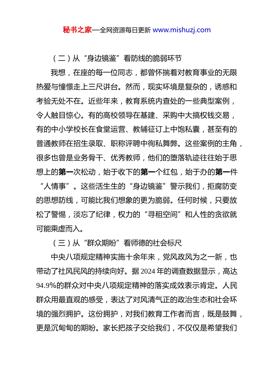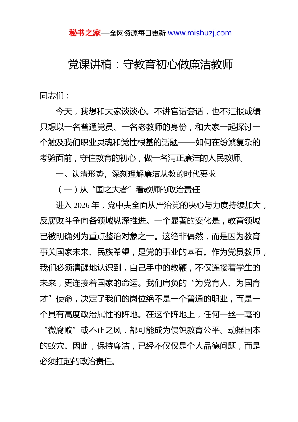 秘书之家—全网资源每日更新 www.mishuzj.com党课讲稿:守教育初心做廉洁教师 同志们:今天,我想和大家谈谈心。不讲官话套话,也不汇报成绩只想以一名普通党员、一名老教师的身份,和大家一起探讨一个触及我们职业灵魂和党性根基的话题——如何在纷繁复杂的考验面前,守住教育的初心,做一名清正廉洁的人民教师。一、认清形势,深刻理解廉洁从教的时代要求(一)从“国之大者”看教师的政治责任进入 2026 年,党中央全面从严治党的决心与力度持续加大,反腐败斗争向各领域纵深推进。一个显著的变化是,教育领域已被明确列为重点整治对象之一。这绝非偶然,而是因为教育事关国家未来、民族希望,是党的事业的基石。作为党员教师,我们必须清醒地认识到,自己手中的教鞭,不仅连接着学生的未来,更连接着国家的命运。我们肩负的“为党育人、为国育才”使命,决定了我们的岗位绝不是一个普通的职业,而是一个具有高度政治属性的阵地。在这个阵地上,任何一丝一毫的“微腐败”或不正之风,都可能成为侵蚀教育公平、动摇国本的蚁穴。因此,保持廉洁,已经不仅仅是个人品德问题,而是必须扛起的政治责任。秘书之家—全网资源每日更新 www.mishuzj.com(二)从“身边镜鉴”看防线的脆弱环节我想,在座的每一位同志,都曾怀揣着对教育事业的无限热爱与憧憬走上三尺讲台。然而,现实环境是复杂的,诱惑和考验无处不在。近些年来,教育系统内查处的一些典型案例,令人触目惊心。有的高校领导在基建、采购中大搞权钱交易,有的中小学校长在食堂运营、教辅征订上中饱私囊,甚至有的普通教师在招生录取、职称评聘中徇私舞弊。这些案例的主角,很多也曾是业务骨干、优秀教师,他们的堕落轨迹往往始于思想上的第一次松动,始于收下的第一个红包,始于办的第一件“人情事”。这些活生生的“身边镜鉴”警示我们,拒腐防变的思想防线,可能比我们想象的更为脆弱。任何时候,只要放松了警惕,淡忘了纪律,权力的“寻租空间”和人性的贪欲就可能乘虚而入。(三)从“群众期盼”看师德的社会标尺中央八项规定精神实施十余年来,党风政风为之一新,也带动了社风民风的持续向好。据 2024 年的调查数据显示,高达94.9%的群众对中央八项规定精神的落实成效表示肯定。人民群众用最直观的感受,表达了对风清气正的政治生态和社会环境的强烈拥护。这份拥护,对我们教育工作者而言,既是鼓舞,更是沉甸甸的期盼。家长把孩子交给我们,不仅仅是希望我们秘书之家—全网资源每日更新 www.mishuzj.com传授知识,更希望我们能以高尚的品德影响孩子,塑造他们健全的人格。社会对教师的职业道德要求,历来都是最高的。一个廉洁自律、品行端正的教师,本身就是一本无字的教科书,其言传身教的力量,远胜于千言万语。反之,任何师德失范的行为,都会在社会上被无限放大,严重伤害教师群体的整体形象和教育的公信力。二、正视风险,精准把握廉洁从教的实践关口作为一线教育工作者,廉政风险并非远在天边,而是潜藏于日常工作的各个环节之中。守住廉洁底线,就需要我们对这些风险点有清醒的认知和高度的警觉。(一)守住“人情”与“原则”的边界,严把招生评优关招生、分班、评优、评奖等工作,是社会高度关注的敏感领域,也是最容易被“人情”所困扰的环节。当亲戚、朋友、甚至领导为某个学生“打招呼”时,我们是坚持原则、一视同仁,还是碍于情面、开口子、行方便?这看似是人情世故,实则是对我们党性原则和职业操守的直接考验。违规操作,哪怕只是微小的倾斜,破坏的却是教育最核心的公平价值。一旦公平的天平失衡,伤害的不仅是其他学生的正当权益,更是孩子们心中对规则、对正义的信仰。我们必须时刻牢记,手中的这点权力,是学校和组织赋予我们服务学生的,绝不能成为谋取秘书之家—全网资源每日更新 www.mishuzj.com私利、交换人情的工具。程序必须公开透明,标准必须始终如一,这既是对所有学生负责,也是对自己最好的保护。(二)守住“公利”与“私欲”的防线,严把经费使用关学校的每一分钱,无论是财政拨款、科研经费还是代管费用,都是公款,都必须用在刀刃上。在经费使用和物资采购环节,同样存...