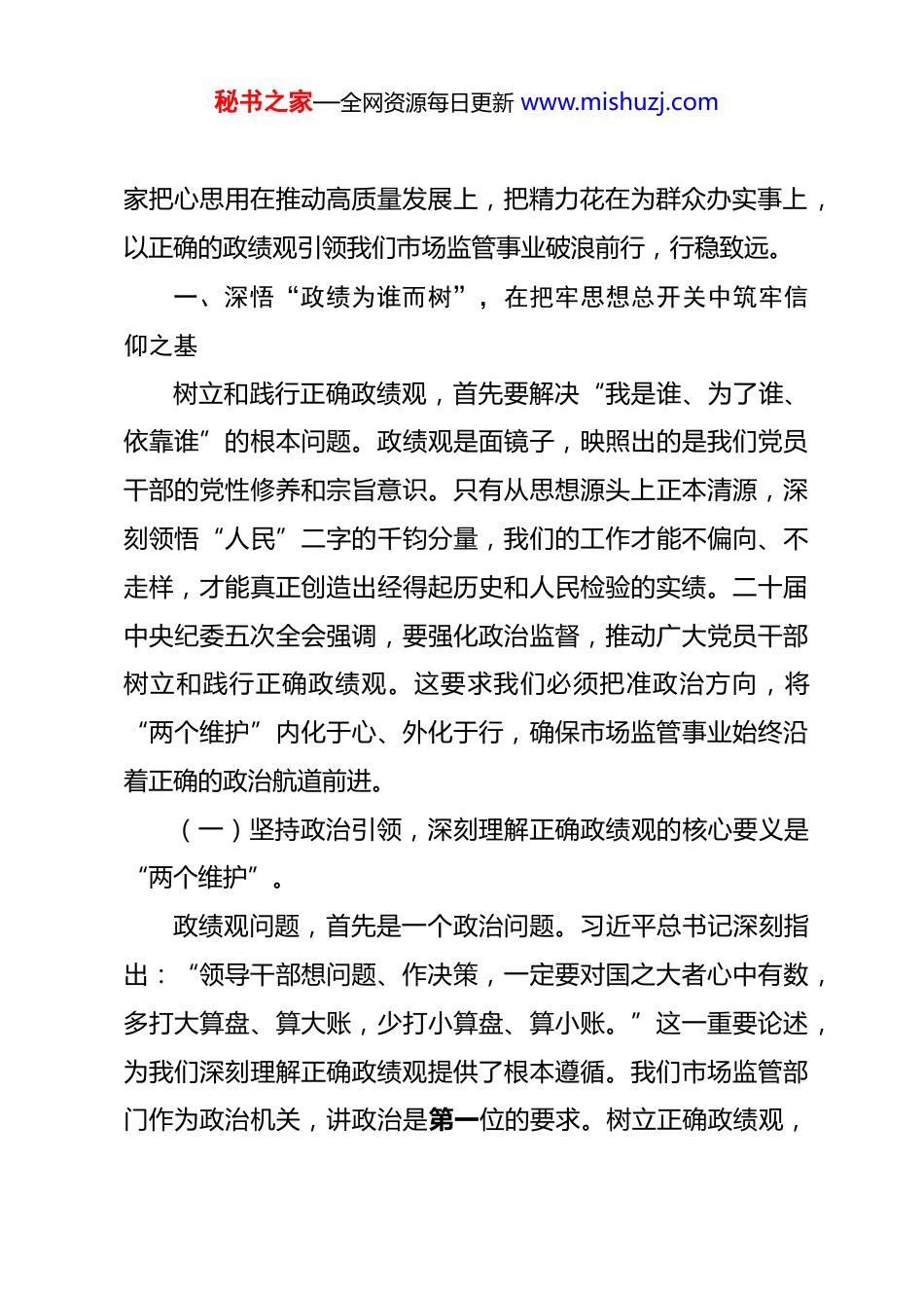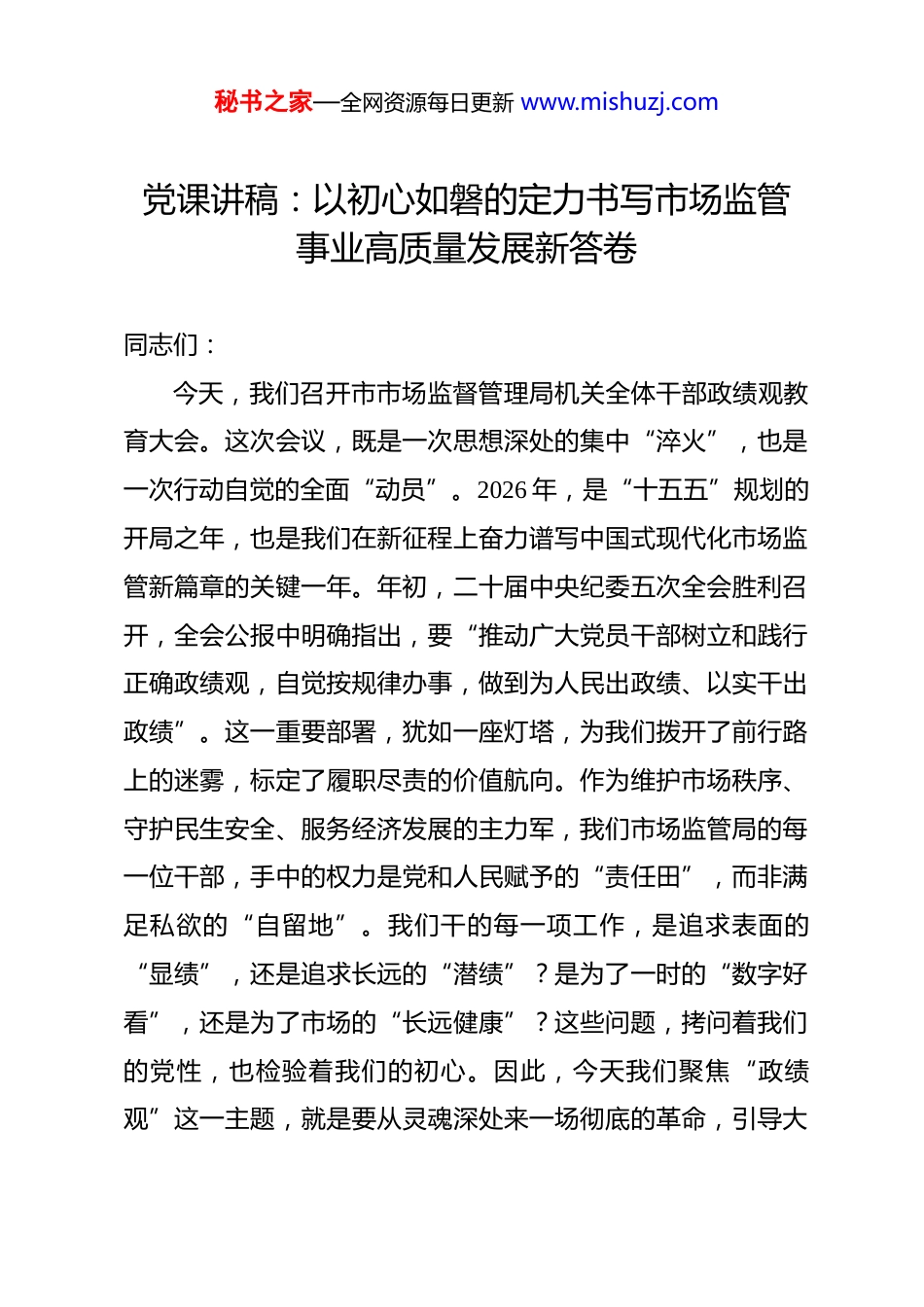 秘书之家—全网资源每日更新 www.mishuzj.com党课讲稿:以初心如磐的定力书写市场监管事业高质量发展新答卷 同志们:今天,我们召开市市场监督管理局机关全体干部政绩观教育大会。这次会议,既是一次思想深处的集中“淬火”,也是一次行动自觉的全面“动员”。2026 年,是“十五五”规划的开局之年,也是我们在新征程上奋力谱写中国式现代化市场监管新篇章的关键一年。年初,二十届中央纪委五次全会胜利召开,全会公报中明确指出,要“推动广大党员干部树立和践行正确政绩观,自觉按规律办事,做到为人民出政绩、以实干出政绩”。这一重要部署,犹如一座灯塔,为我们拨开了前行路上的迷雾,标定了履职尽责的价值航向。作为维护市场秩序、守护民生安全、服务经济发展的主力军,我们市场监管局的每一位干部,手中的权力是党和人民赋予的“责任田”,而非满足私欲的“自留地”。我们干的每一项工作,是追求表面的“显绩”,还是追求长远的“潜绩”?是为了一时的“数字好看”,还是为了市场的“长远健康”?这些问题,拷问着我们的党性,也检验着我们的初心。因此,今天我们聚焦“政绩观”这一主题,就是要从灵魂深处来一场彻底的革命,引导大秘书之家—全网资源每日更新 www.mishuzj.com家把心思用在推动高质量发展上,把精力花在为群众办实事上,以正确的政绩观引领我们市场监管事业破浪前行,行稳致远。一、深悟“政绩为谁而树”,在把牢思想总开关中筑牢信仰之基树立和践行正确政绩观,首先要解决“我是谁、为了谁、依靠谁”的根本问题。政绩观是面镜子,映照出的是我们党员干部的党性修养和宗旨意识。只有从思想源头上正本清源,深刻领悟“人民”二字的千钧分量,我们的工作才能不偏向、不走样,才能真正创造出经得起历史和人民检验的实绩。二十届中央纪委五次全会强调,要强化政治监督,推动广大党员干部树立和践行正确政绩观。这要求我们必须把准政治方向,将“两个维护”内化于心、外化于行,确保市场监管事业始终沿着正确的政治航道前进。(一)坚持政治引领,深刻理解正确政绩观的核心要义是“两个维护”。政绩观问题,首先是一个政治问题。习近平总书记深刻指出:“领导干部想问题、作决策,一定要对国之大者心中有数,多打大算盘、算大账,少打小算盘、算小账。”这一重要论述,为我们深刻理解正确政绩观提供了根本遵循。我们市场监管部门作为政治机关,讲政治是第一位的要求。树立正确政绩观,秘书之家—全网资源每日更新 www.mishuzj.com最根本的就是要深刻领悟“两个确立”的决定性意义,增强“四个意识”、坚定“四个自信”、做到“两个维护”,始终在思想上政治上行动上同以习近平同志为核心的党中央保持高度一致。不能把局部利益放在全局利益之上,不能为了部门的“一亩三分地”而损害全国统一大市场的建设大局。例如,在落实公平竞争审查制度时,我们可能会遇到来自地方保护主义的压力,有的部门可能希望为本地企业“开绿灯”。但作为市场监管干部,我们的政绩绝不能体现在“保护落后”上,而是要体现在坚决破除地方保护和行政性垄断上,体现在为所有市场主体营造公平竞争的市场环境上。这就是算大账、算全局账。我们要深刻认识到,维护党中央权威和集中统一领导,不是抽象的口号,而是要具体落实到我们每一项行政审批、每一次执法检查、每一件消费维权工作中。只有心系“国之大者”,时刻对标对表党中央的决策部署,我们的工作才能不迷失方向,我们的政绩才能融入党和国家事业的大局之中。(二)坚持人民至上,精准把握正确政绩观的价值取向是“为民造福”。“共产党就是给人民办事的,就是要让人民的生活一天天好起来,一天比过得好。”习近平总书记质朴无华的语言,道出了我们共产党人政绩观的灵魂所在。市场监管工作,一头连着秘书之家—全网资源每日更新 www.mishuzj.com1160 多万户市场主体(截至 2025 年底数据),一头连着全市千万人民群众的衣食住行,是名副其实的“民生部门”。我们的政绩,不应该是写在纸上、挂在墙上的数字和图表,而应该是人民群众发自内心的笑容和点赞。试想,如果我们只是追求市场主体数量的简单增长,而忽视了质量的提升...