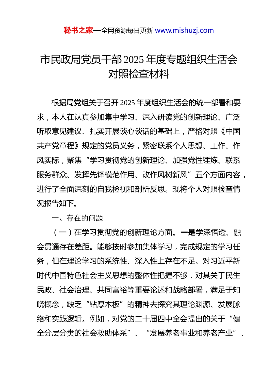 秘书之家—全网资源每日更新 www.mishuzj.com市民政局党员干部 2025 年度专题组织生活会对照检查材料 根据局党组关于召开 2025 年度组织生活会的统一部署和要求,本人在认真参加集中学习、深入研读党的创新理论、广泛听取意见建议、扎实开展谈心谈话的基础上,严格对照《中国共产党章程》规定的党员义务,紧密联系个人思想、工作、作风实际,聚焦“学习贯彻党的创新理论、加强党性锤炼、联系服务群众、发挥先锋模范作用、改作风树新风”五个方面内容,进行了全面深刻的自我检视和剖析反思。现将个人对照检查情况报告如下。一、存在的问题(一)在学习贯彻党的创新理论方面。一是学深悟透、融会贯通存在差距。能够按时参加集体学习,完成规定的学习任务,但在理论学习的系统性、深入性上存在不足。对习近平新时代中国特色社会主义思想的整体性把握不够,对其关于民生民政、社会治理、共同富裕等重要论述和战略部署,满足于知晓概念,缺乏“钻厚木板”的精神去探究其理论渊源、发展脉络和实践逻辑。例如,对党的二十届四中全会提出的关于“健全分层分类的社会救助体系”、“发展养老事业和养老产业”、秘书之家—全网资源每日更新 www.mishuzj.com“完善社会治理体系”等与民政工作直接相关的新部署新要求,理解停留在文件字面,未能完全将其转化为指导我市养老服务体系建设、基层社区治理创新、社会救助精准高效的具体思路和方法论,理论学习的“消化吸收”功能发挥不充分。二是学用结合、指导实践能力不强。存在一定的理论学习和实际工作“两张皮”现象,运用党的创新理论立场观点方法分析和解决民政领域复杂问题的能力有待提升。在谋划推动工作时,有时习惯于凭经验、按惯例,未能自觉从新思想中找方向、找答案。比如,在参与研究我市“一老一小”服务保障优化方案时,虽然收集了相关数据,但更多是就事论事,未能主动运用“坚持以人民为中心的发展思想”和“推动全体人民共同富裕取得更为明显的实质性进展”等理论视角,去深度分析当前服务供给不均衡、不充分的深层次矛盾,提出的建议措施创新性、前瞻性不足,导致方案的理论支撑和战略高度有所欠缺,与“民政为民、民政爱民”工作理念的深度融合不够。三是常学常新、内化于心的自觉不足。存在“以干代学”、学习碎片化的问题,当繁忙的业务工作与政治理论学习时间冲突时,有时会不自觉地降低优先级。对理论学习的重要性认识有时出现波动,未能真正做到把学习作为一种政治责任、一种精神追求、一种生活方式。例如,2025 年局里组织关于“发展新时代‘枫桥经验’,秘书之家—全网资源每日更新 www.mishuzj.com提升基层治理效能”的系列专题讲座,我因处理几件紧急信访件,缺席了部分关键内容的学习,事后虽然补了笔记,但缺乏沉浸式的思考和与同事的深入交流,错过了深化理解基层治理现代化内涵的良机,反映出政治理论学习的韧劲和恒心有待加强。(二)在加强党性锤炼方面。一是政治判断力、领悟力、执行力需持续提升。能够自觉在思想上政治上行动上同党中央保持一致,坚决贯彻上级决策部署。但在运用政治眼光观察和分析民政领域具体问题时,敏感性和穿透力不够强。对社会上一些涉及民生政策调整、社会救助标准等热点问题的模糊认识或片面议论,有时未能第一时间从政治高度洞察其潜在影响,主动进行解释引导、凝聚共识的意识不强,存在“多一事不如少一事”的想法。在落实某些需要多部门协调的民政改革任务时,遇到阻力有时会产生畏难情绪,从政治大局出发攻坚克难的锐气有所消磨。二是理想信念的根基扎得不够牢固。对世界观、人生观、价值观这个“总开关”拧得不够紧,在持续改造主观世界、抵御各种错误思潮侵蚀方面警惕性有待提高。在日常工作和“八小时之外”的生活中,虽然能坚守党员不信教的纪律底线,但对网络上、社会交往中偶尔出现的涉及风水命运、消极处世哲学等内容的“灰色信息”,有时缺乏足够的政治鉴秘书之家—全网资源每日更新 www.mishuzj.com别力和批判态度,认为只是“闲聊谈资”,未能旗帜鲜明地抵制和澄清,反映出党性修养的“防腐剂”作用在细微处发挥不够充分。三是纪律规矩意识需进一步强化。对...