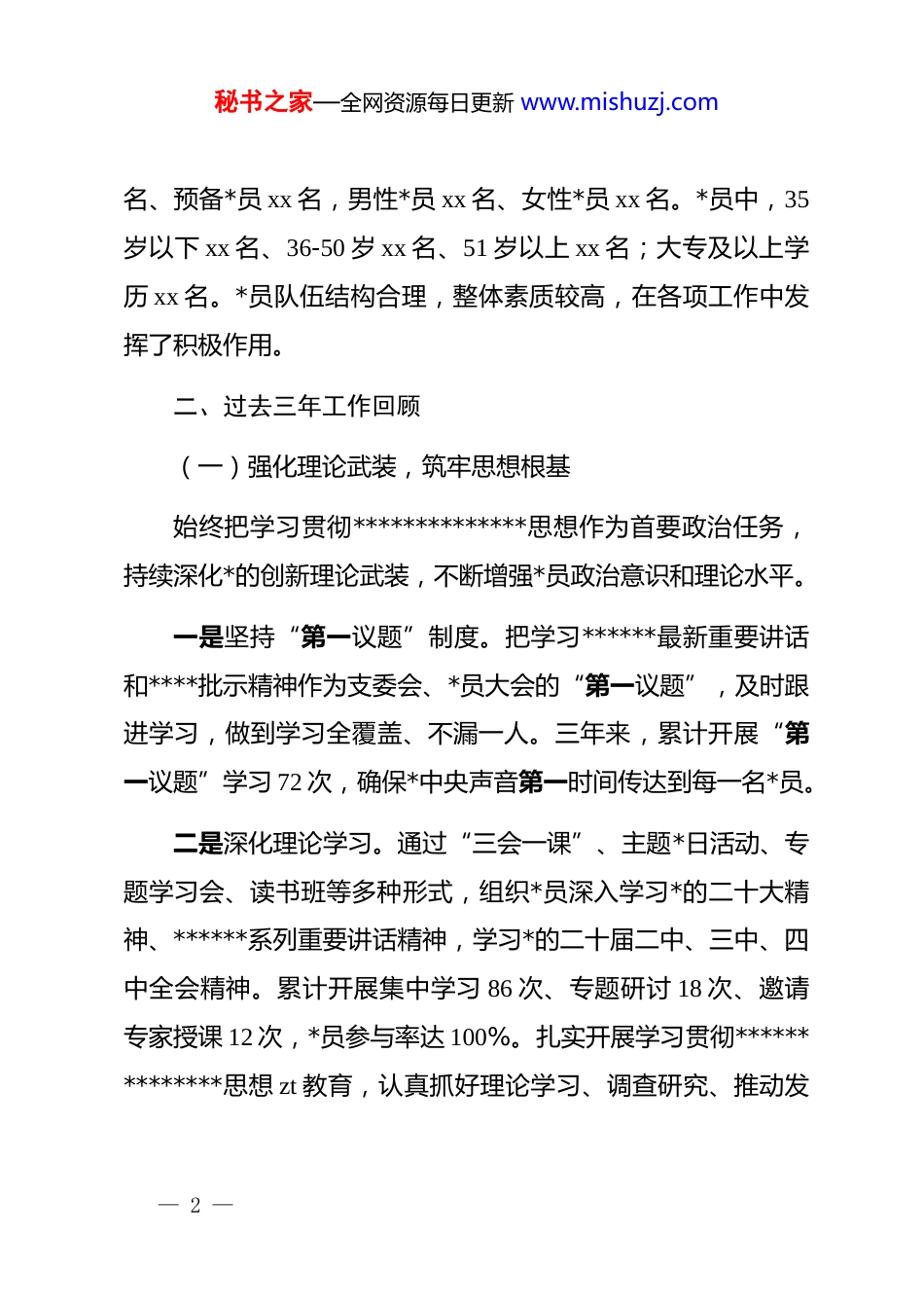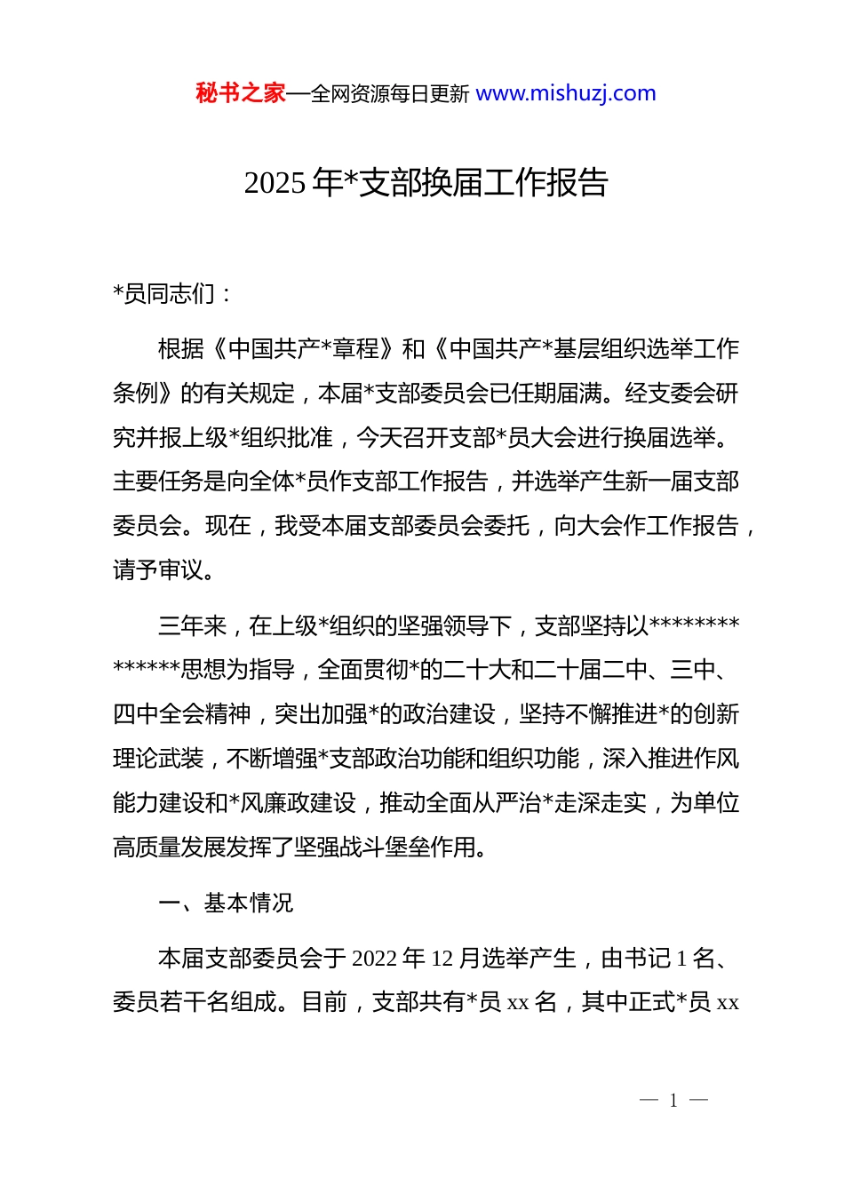 秘书之家—全网资源每日更新 www.mishuzj.com2025 年*支部换届工作报告*员同志们:根据《中国共产*章程》和《中国共产*基层组织选举工作条例》的有关规定,本届*支部委员会已任期届满。经支委会研究并报上级*组织批准,今天召开支部*员大会进行换届选举。主要任务是向全体*员作支部工作报告,并选举产生新一届支部委员会。现在,我受本届支部委员会委托,向大会作工作报告,请予审议。三年来,在上级*组织的坚强领导下,支部坚持以**************思想为指导,全面贯彻*的二十大和二十届二中、三中、四中全会精神,突出加强*的政治建设,坚持不懈推进*的创新理论武装,不断增强*支部政治功能和组织功能,深入推进作风能力建设和*风廉政建设,推动全面从严治*走深走实,为单位高质量发展发挥了坚强战斗堡垒作用。一、基本情况本届支部委员会于 2022 年 12 月选举产生,由书记 1 名、委员若干名组成。目前,支部共有*员 xx 名,其中正式*员 xx— 1 —秘书之家—全网资源每日更新 www.mishuzj.com名、预备*员 xx 名,男性*员 xx 名、女性*员 xx 名。*员中,35岁以下 xx 名、36-50 岁 xx 名、51 岁以上 xx 名;大专及以上学历 xx 名。*员队伍结构合理,整体素质较高,在各项工作中发挥了积极作用。二、过去三年工作回顾(一)强化理论武装,筑牢思想根基始终把学习贯彻**************思想作为首要政治任务,持续深化*的创新理论武装,不断增强*员政治意识和理论水平。一是坚持“第一议题”制度。把学习******最新重要讲话和****批示精神作为支委会、*员大会的“第一议题”,及时跟进学习,做到学习全覆盖、不漏一人。三年来,累计开展“第一议题”学习 72 次,确保*中央声音第一时间传达到每一名*员。二是深化理论学习。通过“三会一课”、主题*日活动、专题学习会、读书班等多种形式,组织*员深入学习*的二十大精神、******系列重要讲话精神,学习*的二十届二中、三中、四中全会精神。累计开展集中学习 86 次、专题研讨 18 次、邀请专家授课 12 次,*员参与率达 100%。扎实开展学习贯彻**************思想 zt 教育,认真抓好理论学习、调查研究、推动发— 2 —秘书之家—全网资源每日更新 www.mishuzj.com展、检视整改等各项任务,取得扎实成效。三是创新学习方式。建立“线上+线下”学习机制,利用学习强国、dj 云平台等载体,开展灵活多样的学习活动。组织*员赴红色教育基地开展现场教学 6 次,观看专题片和警示教育片 15 部,举办知识竞赛 3 次,增强学习的吸引力和实效性。四是深入开展贯彻中央八项规定精神学习教育。按照上级*组织部署,2025 年 3 月至 7 月认真组织开展深入贯彻中央八项规定精神学习教育,通过专题学习、查摆问题、集中整治等方式,系统总结*的十八大以来深入贯彻中央八项规定精神的成效和经验,全面查找在作风建设方面存在的问题,有针对性地完善相关制度规定,推动作风建设常态化长效化,学习教育取得实实在在成效。(二)加强组织建设,夯实战斗堡垒坚持把支部建设作为最重要的基本建设,不断提升支部组织力、凝聚力和战斗力。一是严格*的组织生活。认真落实“三会一课”、组织生活会、民主评议*员、谈心谈话等制度,确保*的组织生活经常化、规范化、制度化。三年来,召开支委会 36 次、*员大会 36 次、— 3 —秘书之家—全网资源每日更新 www.mishuzj.com*小组会 108 次,讲*课 42 次,组织生活会 6 次,民主评议*员 3次。每次组织生活都做到主题明确、内容充实、程序规范、效果良好。二是规范支部标准化建设。按照*支部标准化建设要求,进一步完善支部组织设置、队伍建设、活动开展、制度保障等方面工作。建立健全支部工作台账,规范*费收缴、使用和管理,做到账目清晰、管理规范。支部工作有章可循、有据可查,在上级*组织的多次检查中均得到高度评价。三是严肃*内政治生活。认真召开支部组织生活会和民主评议*员会议,广泛征求意见、深入查摆问题、认真开展批评和自我批评,达到了统一思想、增进团结、相互监督、共同提高的目的。组织生活会坚持问题导向,不走过场、不搞形式,真...