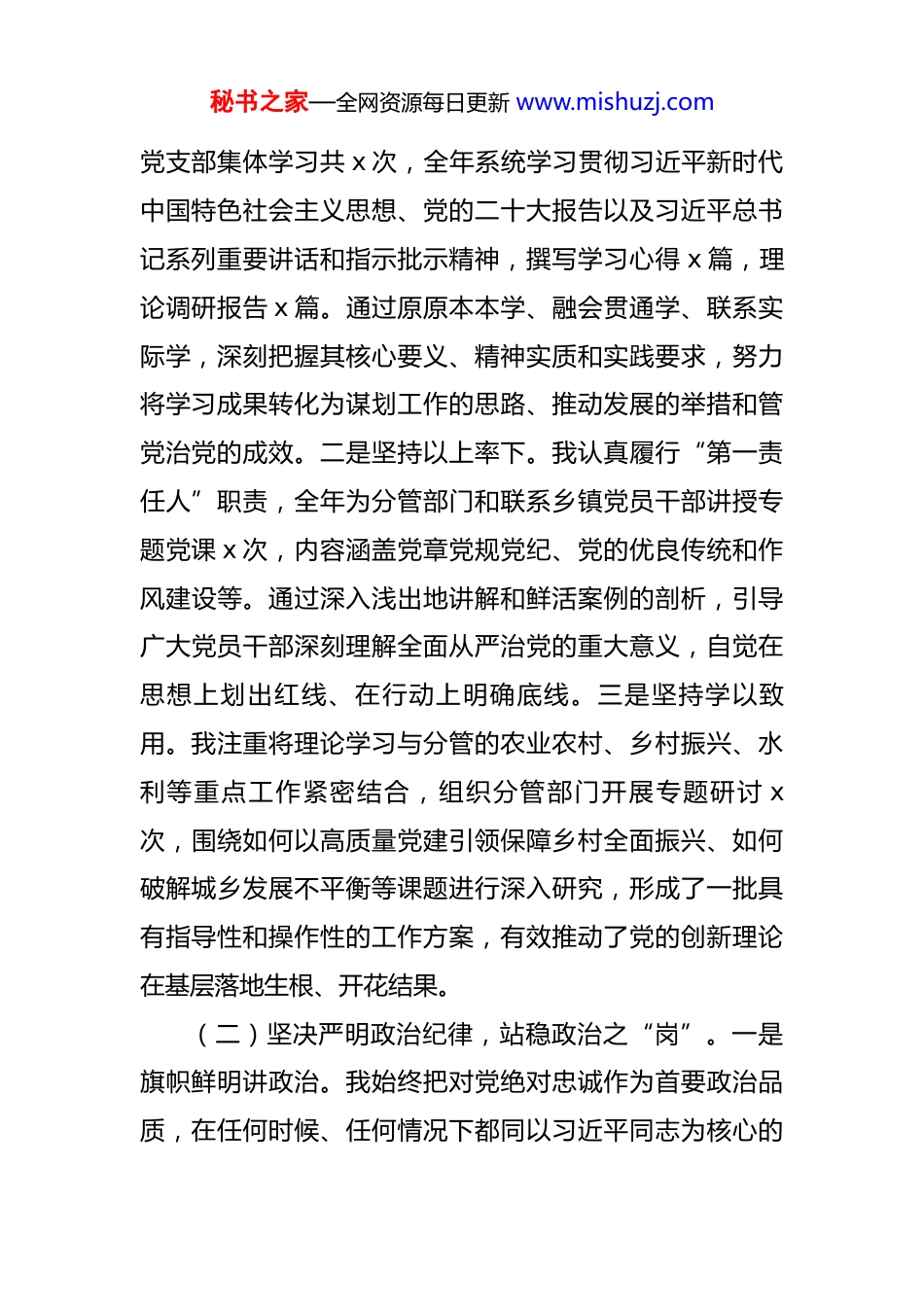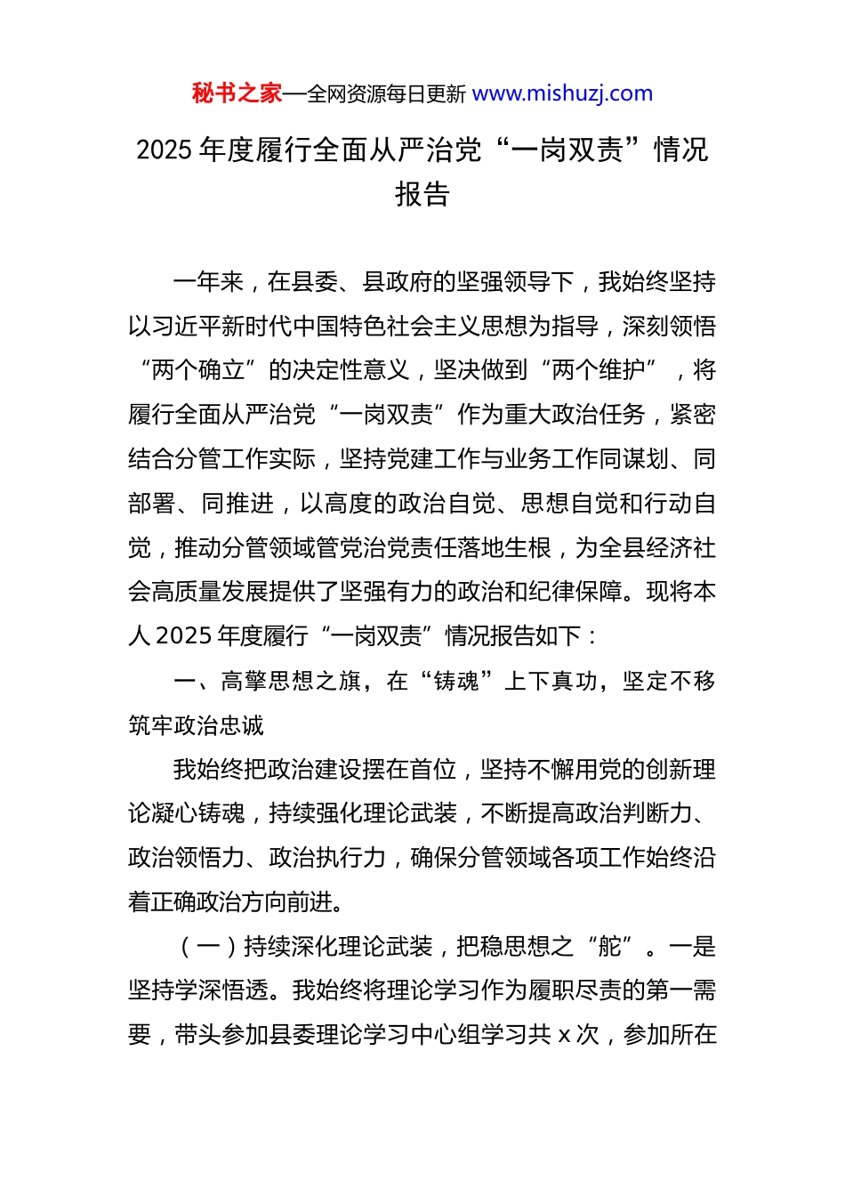 秘书之家—全网资源每日更新 www.mishuzj.com2025 年度履行全面从严治党“一岗双责”情况报告 一年来,在县委、县政府的坚强领导下,我始终坚持以习近平新时代中国特色社会主义思想为指导,深刻领悟“两个确立”的决定性意义,坚决做到“两个维护”,将履行全面从严治党“一岗双责”作为重大政治任务,紧密结合分管工作实际,坚持党建工作与业务工作同谋划、同部署、同推进,以高度的政治自觉、思想自觉和行动自觉,推动分管领域管党治党责任落地生根,为全县经济社会高质量发展提供了坚强有力的政治和纪律保障。现将本人 2025 年度履行“一岗双责”情况报告如下:一、高擎思想之旗,在“铸魂”上下真功,坚定不移筑牢政治忠诚我始终把政治建设摆在首位,坚持不懈用党的创新理论凝心铸魂,持续强化理论武装,不断提高政治判断力、政治领悟力、政治执行力,确保分管领域各项工作始终沿着正确政治方向前进。(一)持续深化理论武装,把稳思想之“舵”。一是坚持学深悟透。我始终将理论学习作为履职尽责的第一需要,带头参加县委理论学习中心组学习共 x 次,参加所在秘书之家—全网资源每日更新 www.mishuzj.com党支部集体学习共 x 次,全年系统学习贯彻习近平新时代中国特色社会主义思想、党的二十大报告以及习近平总书记系列重要讲话和指示批示精神,撰写学习心得 x 篇,理论调研报告 x 篇。通过原原本本学、融会贯通学、联系实际学,深刻把握其核心要义、精神实质和实践要求,努力将学习成果转化为谋划工作的思路、推动发展的举措和管党治党的成效。二是坚持以上率下。我认真履行“第一责任人”职责,全年为分管部门和联系乡镇党员干部讲授专题党课 x 次,内容涵盖党章党规党纪、党的优良传统和作风建设等。通过深入浅出地讲解和鲜活案例的剖析,引导广大党员干部深刻理解全面从严治党的重大意义,自觉在思想上划出红线、在行动上明确底线。三是坚持学以致用。我注重将理论学习与分管的农业农村、乡村振兴、水利等重点工作紧密结合,组织分管部门开展专题研讨 x次,围绕如何以高质量党建引领保障乡村全面振兴、如何破解城乡发展不平衡等课题进行深入研究,形成了一批具有指导性和操作性的工作方案,有效推动了党的创新理论在基层落地生根、开花结果。(二)坚决严明政治纪律,站稳政治之“岗”。一是旗帜鲜明讲政治。我始终把对党绝对忠诚作为首要政治品质,在任何时候、任何情况下都同以习近平同志为核心的秘书之家—全网资源每日更新 www.mishuzj.com党中央保持高度一致。对于中央、省委、市委和县委的各项决策部署,我坚决做到第一时间传达学习、第一时间研究部署、第一时间督促落实,确保政令畅通、令行禁止。全年共主持召开 x 次分管领域专题会议,研究贯彻落实上级重大决策部署的具体措施,确保各项工作不偏向、不变通、不走样。二是严肃党内政治生活。我严格执行民主集中制,坚持“三重一大”事项集体研究、集体决策,凡是分管领域的重大项目安排、大额资金使用等,均提交政府常务会议或专题会议集体研究决定。同时,我以普通党员身份积极参加所在党支部的组织生活会,带头开展批评和自我批评,主动查摆自身在思想、工作、作风等方面存在的问题,虚心接受同志们的批评意见,营造了严肃认真、团结和谐的党内政治生活氛围。(三)全力抓好意识形态,筑牢思想之“防”。一是压实工作责任。我深刻认识到意识形态工作的极端重要性,严格落实意识形态工作责任制,定期分析研判分管领域的意识形态风险。全年主持召开分管领域意识形态工作分析研判会 x 次,听取 x 个重点单位的专题汇报,针对发现的苗头性、倾向性问题,及时提出 x 条整改措施,并跟踪督办,确保阵地可管可控。二是加强阵地管理。我指导分管部门加强对网络平台、宣传阵地、文化活动的管理,秘书之家—全网资源每日更新 www.mishuzj.com坚决抵制和反对各种错误思潮和言论。围绕乡村文化振兴,指导开展“送文化下乡”活动 x 场,弘扬社会主义核心价值观,传播社会正能量,牢牢掌握了意识形态工作领导权和主动权。二、紧扣中心大局,在“履责”上动真格,驰而不息压实主体责任我始终牢记...
