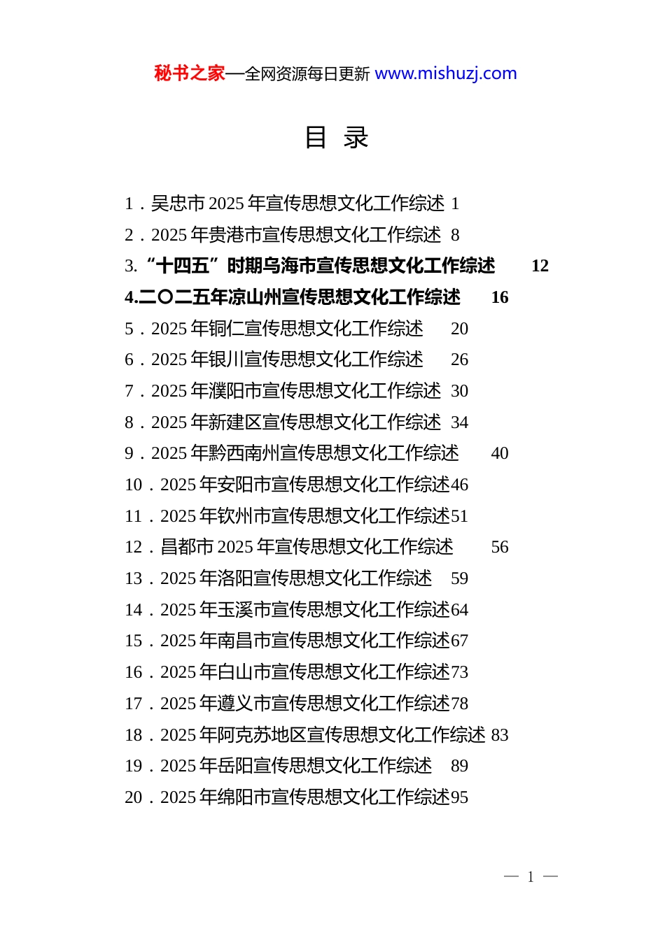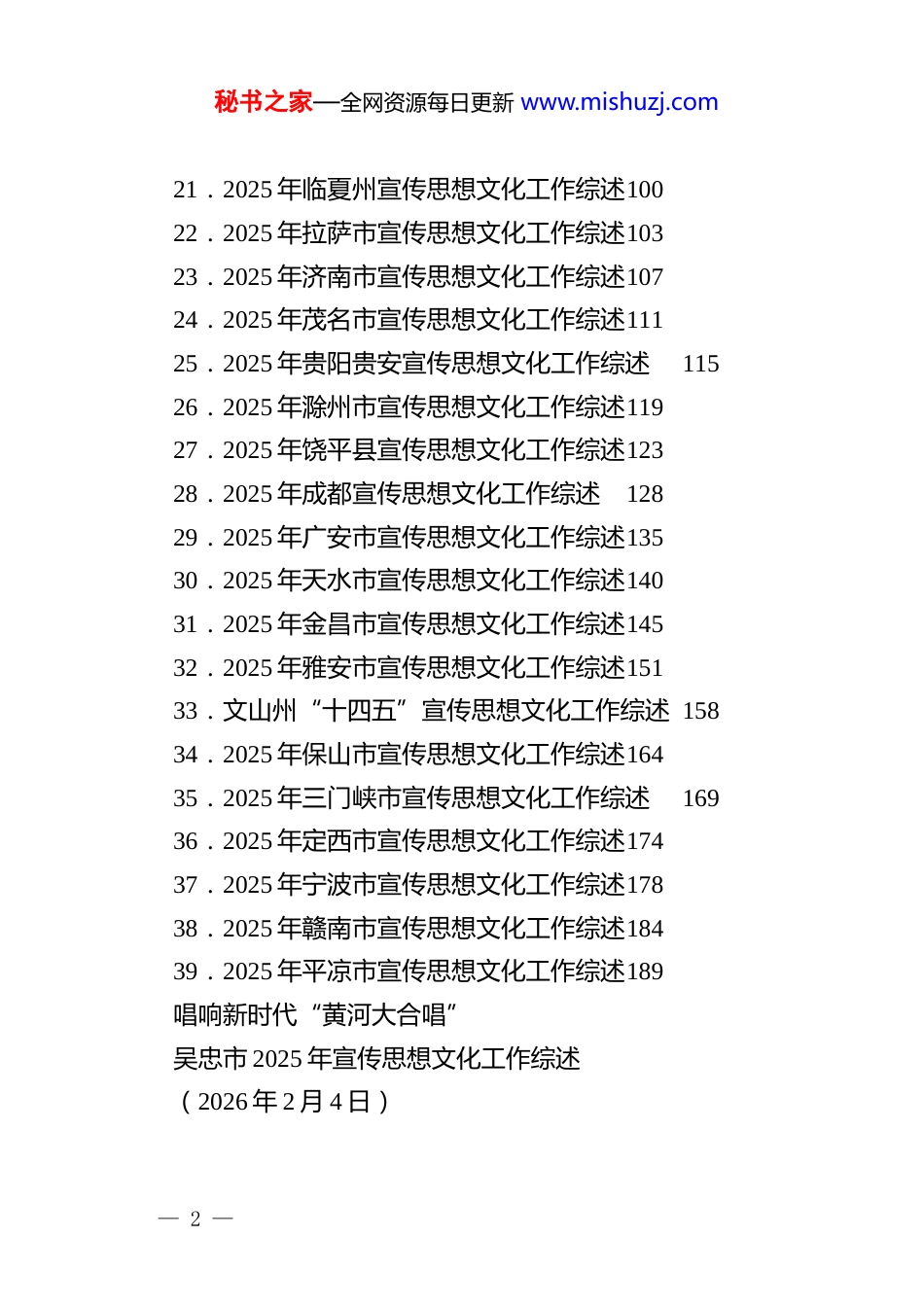秘书之家—全网资源每日更新 www.mishuzj.com目 录1.吴忠市 2025 年宣传思想文化工作综述 12.2025 年贵港市宣传思想文化工作综述 83.“十四五”时期乌海市宣传思想文化工作综述124.二〇二五年凉山州宣传思想文化工作综述165.2025 年铜仁宣传思想文化工作综述206.2025 年银川宣传思想文化工作综述267.2025 年濮阳市宣传思想文化工作综述 308.2025 年新建区宣传思想文化工作综述 349.2025 年黔西南州宣传思想文化工作综述4010.2025 年安阳市宣传思想文化工作综述4611.2025 年钦州市宣传思想文化工作综述5112.昌都市 2025 年宣传思想文化工作综述5613.2025 年洛阳宣传思想文化工作综述5914.2025 年玉溪市宣传思想文化工作综述6415.2025 年南昌市宣传思想文化工作综述6716.2025 年白山市宣传思想文化工作综述7317.2025 年遵义市宣传思想文化工作综述7818.2025 年阿克苏地区宣传思想文化工作综述 8319.2025 年岳阳宣传思想文化工作综述8920.2025 年绵阳市宣传思想文化工作综述95— 1 —秘书之家—全网资源每日更新 www.mishuzj.com21.2025 年临夏州宣传思想文化工作综述10022.2025 年拉萨市宣传思想文化工作综述10323.2025 年济南市宣传思想文化工作综述10724.2025 年茂名市宣传思想文化工作综述11125.2025 年贵阳贵安宣传思想文化工作综述11526.2025 年滁州市宣传思想文化工作综述11927.2025 年饶平县宣传思想文化工作综述12328.2025 年成都宣传思想文化工作综述12829.2025 年广安市宣传思想文化工作综述13530.2025 年天水市宣传思想文化工作综述14031.2025 年金昌市宣传思想文化工作综述14532.2025 年雅安市宣传思想文化工作综述15133.文山州“十四五”宣传思想文化工作综述 15834.2025 年保山市宣传思想文化工作综述16435.2025 年三门峡市宣传思想文化工作综述16936.2025 年定西市宣传思想文化工作综述17437.2025 年宁波市宣传思想文化工作综述17838.2025 年赣南市宣传思想文化工作综述18439.2025 年平凉市宣传思想文化工作综述189唱响新时代“黄河大合唱”吴忠市 2025 年宣传思想文化工作综述(2026 年 2 月 4 日)— 2 —秘书之家—全网资源每日更新 www.mishuzj.com大河奔涌千重浪,山川焕颜绘新卷。山的怀抱和水的臂弯孕育了吴忠独特的人文历史。从涓涓而起至奔腾入海,滔滔黄河见证着吴忠经济社会高质量发展的历史进程,也见证着全市宣传思想文化战线的精彩实践。回首过去一年,吴忠市的宣传思想文化工作既有宏大的时代主题引领,又有细致入微的实践浸润,齐心奏响了新时代的“黄河大合唱”,恢弘之音声震山河,气贯长虹,振奋人心。第三届沿黄九省区民歌会、第二届西北花儿歌会,把黄河流域的山河气韵与人间烟火唱得荡气回肠,既丰富了群众精神生活,也为黄河文化的创新表达提供了鲜活样本。吴忠农文旅体商推介活动覆盖全国 29 个城市,签约投资 65.4 亿元,拓宽农文旅体商融合发展的“朋友圈”;第五届吴忠早茶美食文化节联动 68 场惠民演出,以明星演唱会、电音节、文艺汇演等多元形式激活节庆经济,擦亮“游在宁夏吃在吴忠”品牌;创新开展“感恩母亲河——行走的思政课”,将生态保护融入实践教育,打造可推广的思政样板。打造“四季”村晚品牌,盐池县北塘新村“春节”村晚、青铜峡市韦桥村“夏季”村晚等 3 个村晚入选全国“四季村晚”示范展示点;……理论武装走深走实、主流舆论强劲有力、宣传教育有力有— 3 —秘书之家—全网资源每日更新 www.mishuzj.com效、文明创建成果丰硕、文艺精品好戏连台、文化产业活力迸发、意识形态向上向好这曲和鸣,唱响了全市上下的奋进心声,汇聚起逐梦前行的磅礴伟力。这一年,全市宣传思想文化战线高擎习近平新时代中国特色社会主义思想伟大旗帜,深入学习践行习近平文化思想和习近平总书记考察宁夏重要讲话精神,围绕中心大局,勇担文化使命,深耕人文沃土,以守正之基涵养浩然正气,以创新之笔绘就时代华章,为奋力谱写中国式现代化吴忠篇章提供了坚强的思想保证、强大的精神动力和丰润的文化滋养。一、高举思想旗帜...