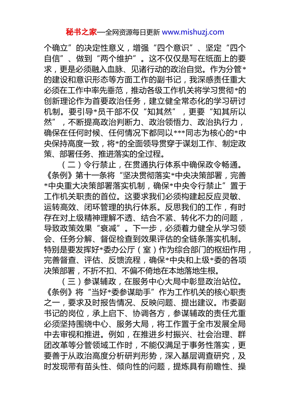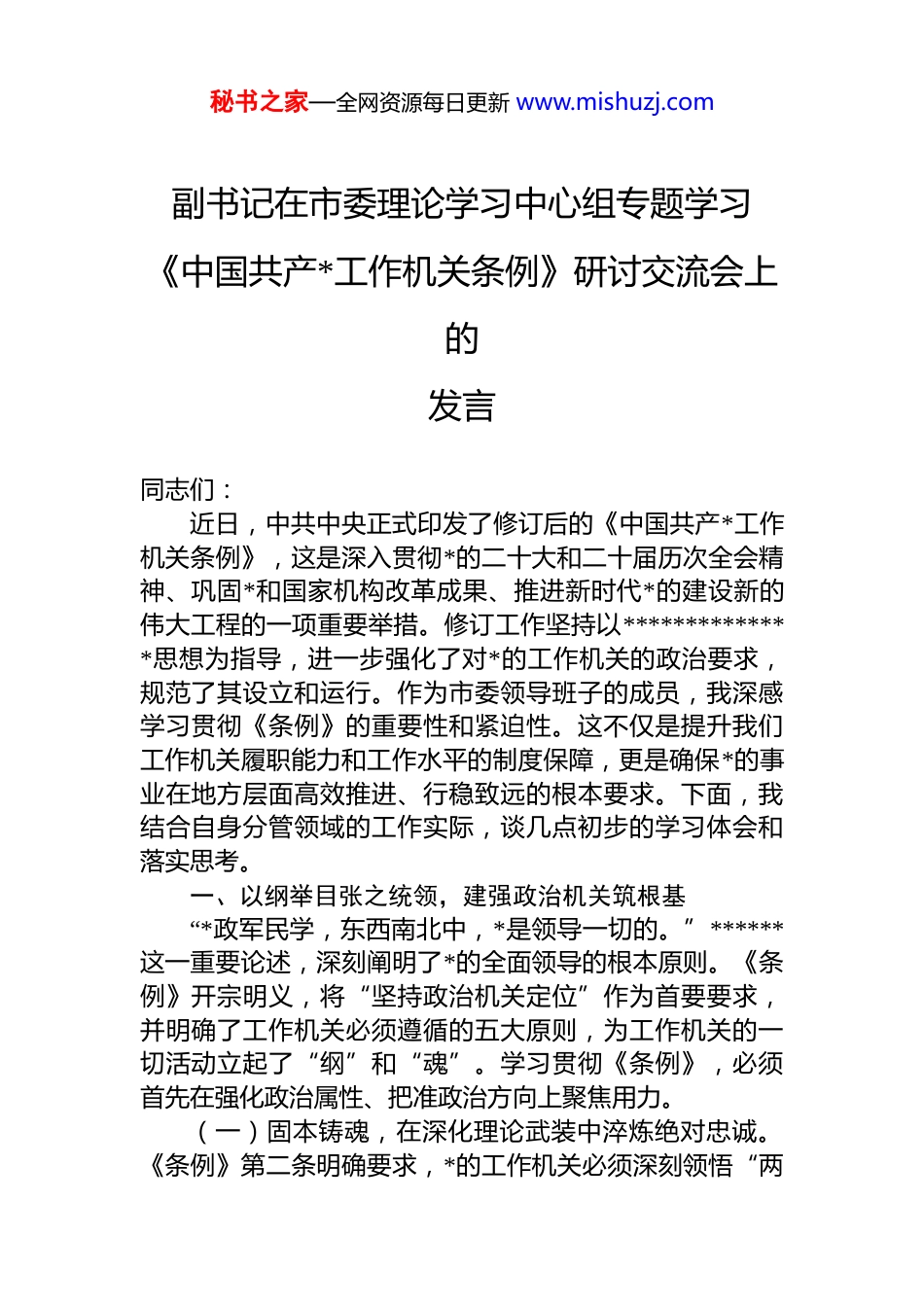 秘书之家—全网资源每日更新 www.mishuzj.com副书记在市委理论学习中心组专题学习《中国共产*工作机关条例》研讨交流会上的发言同志们:近日,中共中央正式印发了修订后的《中国共产*工作机关条例》,这是深入贯彻*的二十大和二十届历次全会精神、巩固*和国家机构改革成果、推进新时代*的建设新的伟大工程的一项重要举措。修订工作坚持以**************思想为指导,进一步强化了对*的工作机关的政治要求,规范了其设立和运行。作为市委领导班子的成员,我深感学习贯彻《条例》的重要性和紧迫性。这不仅是提升我们工作机关履职能力和工作水平的制度保障,更是确保*的事业在地方层面高效推进、行稳致远的根本要求。下面,我结合自身分管领域的工作实际,谈几点初步的学习体会和落实思考。一、以纲举目张之统领,建强政治机关筑根基“*政军民学,东西南北中,*是领导一切的。”******这一重要论述,深刻阐明了*的全面领导的根本原则。《条例》开宗明义,将“坚持政治机关定位”作为首要要求,并明确了工作机关必须遵循的五大原则,为工作机关的一切活动立起了“纲”和“魂”。学习贯彻《条例》,必须首先在强化政治属性、把准政治方向上聚焦用力。(一)固本铸魂,在深化理论武装中淬炼绝对忠诚。《条例》第二条明确要求,*的工作机关必须深刻领悟“两秘书之家—全网资源每日更新 www.mishuzj.com个确立”的决定性意义,增强“四个意识”、坚定“四个自信”、做到“两个维护”。这不仅仅是写在纸面上的要求,更是必须融入血脉、见诸行动的政治自觉。作为分管*的建设和意识形态等方面工作的副书记,我深感责任重大必须在工作中率先垂范,推动各级工作机关将学习贯彻*的创新理论作为首要政治任务,建立健全常态化的学习研讨机制。要引导*员干部不仅“知其然”,更要“知其所以然”,不断提高政治判断力、政治领悟力、政治执行力,确保在任何时候、任何情况下都同以***同志为核心的*中央保持高度一致,将*的全面领导贯穿于谋划工作、制定政策、部署任务、推进落实的全过程。(二)令行禁止,在贯通执行体系中确保政令畅通。《条例》第十一条将“坚决贯彻落实*中央决策部署,完善*中央重大决策部署落实机制,确保*中央令行禁止”置于工作机关职责的首位。这要求我们必须构建起反应灵敏、运转高效、闭环管理的执行体系。反思我们的工作,有时存在对上级精神理解不透、结合不紧、转化不力的问题,导致政策效果“衰减”。下一步,必须着力健全从学习领会、任务分解、督促检查到效果评估的全链条落实机制。特别是要发挥好*委办公厅(室)作为综合部门的枢纽作用,完善督查、评估、反馈流程,确保*中央和上级*委的各项决策部署,不折不扣、不偏不倚地在本地落地生根。(三)参谋辅政,在服务中心大局中彰显政治站位。《条例》将“当好*委参谋助手”作为工作机关的核心职责之一,要求及时报告情况、反映问题、提出建议。市委副书记的岗位,承上启下、协调各方,参谋辅政的责任尤重必须坚持围绕中心、服务大局,将工作置于全市发展全局中去审视和推进。例如,在推进乡村振兴、社会治理、群团改革等分管领域工作时,不能仅满足于事务性落实,更要善于从政治高度分析研判形势,深入基层调查研究,及时发现带有苗头性、倾向性的问题,提炼具有前瞻性、操秘书之家—全网资源每日更新 www.mishuzj.com作性的建议,为市委科学决策提供高质量参考,真正做到“身在兵位、胸为帅谋”。二、以同舟共济之协同,优化体制机制提效能“坚持优化协同高效”,是深化*和国家机构改革的重要原则,也是《条例》对*的工作机关设立和运行提出的明确要求。工作机关体系如同一艘航船,各部门只有协同配合同向发力,才能破浪前行。学习贯彻《条例》,必须在完善体制机制、促进协同高效上持续深化。(一)架构优化,在明晰权责边界中促进规范有序。《条例》对工作机关的设立、职责、领导机构、内设机构等作出了系统规范,强调“职责明确、权责一致”,并实行总量控制和限额管理。这为解决实际工作中可能存在的机构重叠、职责交叉、权责脱节等问题提供了根本遵循。我们要以学习贯彻《条例》为契机,协同机构编制管理部门...