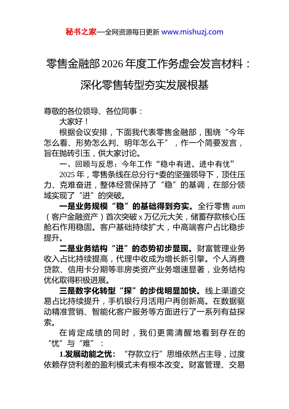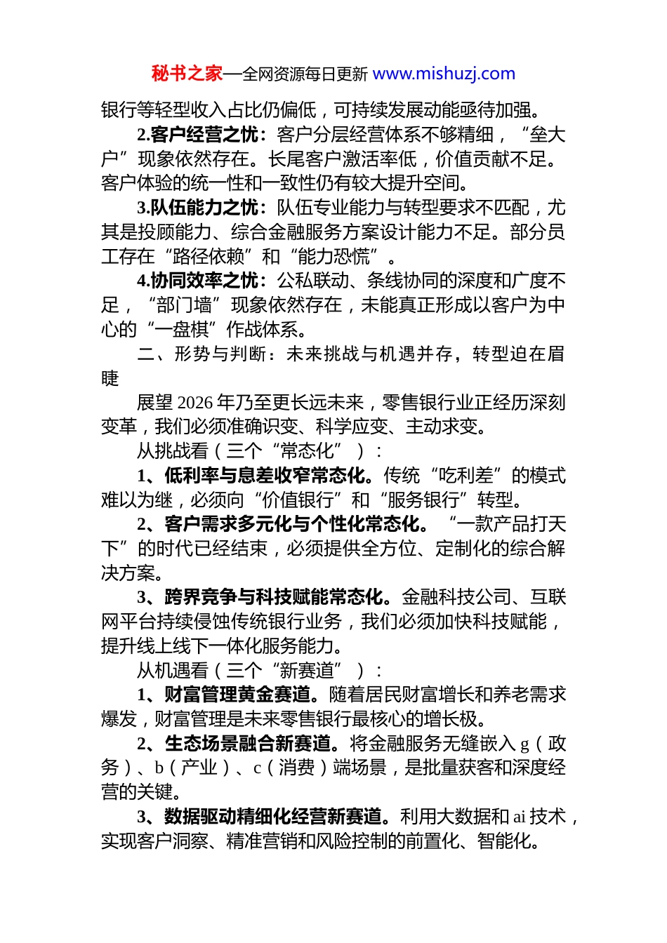 秘书之家—全网资源每日更新 www.mishuzj.com零售金融部 2026 年度工作务虚会发言材料:深化零售转型夯实发展根基尊敬的各位领导、各位同事:大家好!根据会议安排,下面我代表零售金融部,围绕“今年怎么看、形势怎么判、明年怎么干”,作一个简要发言,旨在抛砖引玉,供大家讨论。一、回顾与反思:今年工作“稳中有进,进中有忧”2025 年,零售条线在总分行*委的坚强领导下,顶住压力、克难奋进,整体经营保持了“稳”的基调,在部分领域实现了“进”的突破。一是业务规模“稳”的基础得到夯实。全行零售 aum(客户金融资产)首次突破 x 万亿元大关,储蓄存款核心压舱石作用稳固。客户基础持续扩大,中高端客户占比稳步提升。二是业务结构“进”的态势初步显现。财富管理业务收入占比持续提高,代理中收成为增长新引擎。个人消费贷款、信用卡分期等非房类资产业务增速显著,业务结构优化取得积极进展。三是数字化转型“探”的步伐明显加快。线上渠道交易占比持续提升,手机银行月活用户再创新高。在数据驱动精准营销、智能化客户服务等方面进行了一系列有益探索。在肯定成绩的同时,我们更需清醒地看到存在的“忧”与“难”:1.发展动能之忧:“存款立行”思维依然占主导,过度依赖存贷利差的盈利模式未有根本改变。财富管理、交易秘书之家—全网资源每日更新 www.mishuzj.com银行等轻型收入占比仍偏低,可持续发展动能亟待加强。2.客户经营之忧:客户分层经营体系不够精细,“垒大户”现象依然存在。长尾客户激活率低,价值贡献不足。客户体验的统一性和一致性仍有较大提升空间。3.队伍能力之忧:队伍专业能力与转型要求不匹配,尤其是投顾能力、综合金融服务方案设计能力不足。部分员工存在“路径依赖”和“能力恐慌”。4.协同效率之忧:公私联动、条线协同的深度和广度不足,“部门墙”现象依然存在,未能真正形成以客户为中心的“一盘棋”作战体系。二、形势与判断:未来挑战与机遇并存,转型迫在眉睫展望 2026 年乃至更长远未来,零售银行业正经历深刻变革,我们必须准确识变、科学应变、主动求变。从挑战看(三个“常态化”):1、低利率与息差收窄常态化。传统“吃利差”的模式难以为继,必须向“价值银行”和“服务银行”转型。2、客户需求多元化与个性化常态化。“一款产品打天下”的时代已经结束,必须提供全方位、定制化的综合解决方案。3、跨界竞争与科技赋能常态化。金融科技公司、互联网平台持续侵蚀传统银行业务,我们必须加快科技赋能,提升线上线下一体化服务能力。从机遇看(三个“新赛道”):1、财富管理黄金赛道。随着居民财富增长和养老需求爆发,财富管理是未来零售银行最核心的增长极。2、生态场景融合新赛道。将金融服务无缝嵌入 g(政务)、b(产业)、c(消费)端场景,是批量获客和深度经营的关键。3、数据驱动精细化经营新赛道。利用大数据和 ai 技术,实现客户洞察、精准营销和风险控制的前置化、智能化。秘书之家—全网资源每日更新 www.mishuzj.com我们的基本判断是:零售银行业的竞争,已经从“规模竞争”转向“结构竞争”,从“产品竞争”转向“生态竞争”,从“单点竞争”转向“体系竞争”。转型不是选择题,而是生存题。三、思考与建议:明年工作要“聚焦核心,深化改革”基于以上分析和判断,对于 2026 年零售业务发展,我们提出“一个中心,两大基石,三项突破”的初步构想,供领导同事们探讨。(一)坚守“一个中心”:坚定不移地“以客户为中心”这不是一句口号,而是需要彻底重塑我们的组织架构业务流程、考核方式和 it 系统。建议明年启动“客户体验提升”专项工程,建立全行统一的客户视图和体验监测体系真正将客户满意度作为衡量我们工作的最终标准。(二)夯实“两大基石”:资产组织能力与风险经营能力1.资产组织能力:从“被动负债”向“主动资产管理”转变。核心是做大 aum,优化 aum 结构,提升财富管理收入贡献。要构建“存款-理财-保险-基金-信托”的全谱系产品货架和资产配置能力。2.风险经营能力:从“被动防控”向“主动经营风险”转变。利用科技手段实现风险的精准识别、量化定价和动态管理,特别...