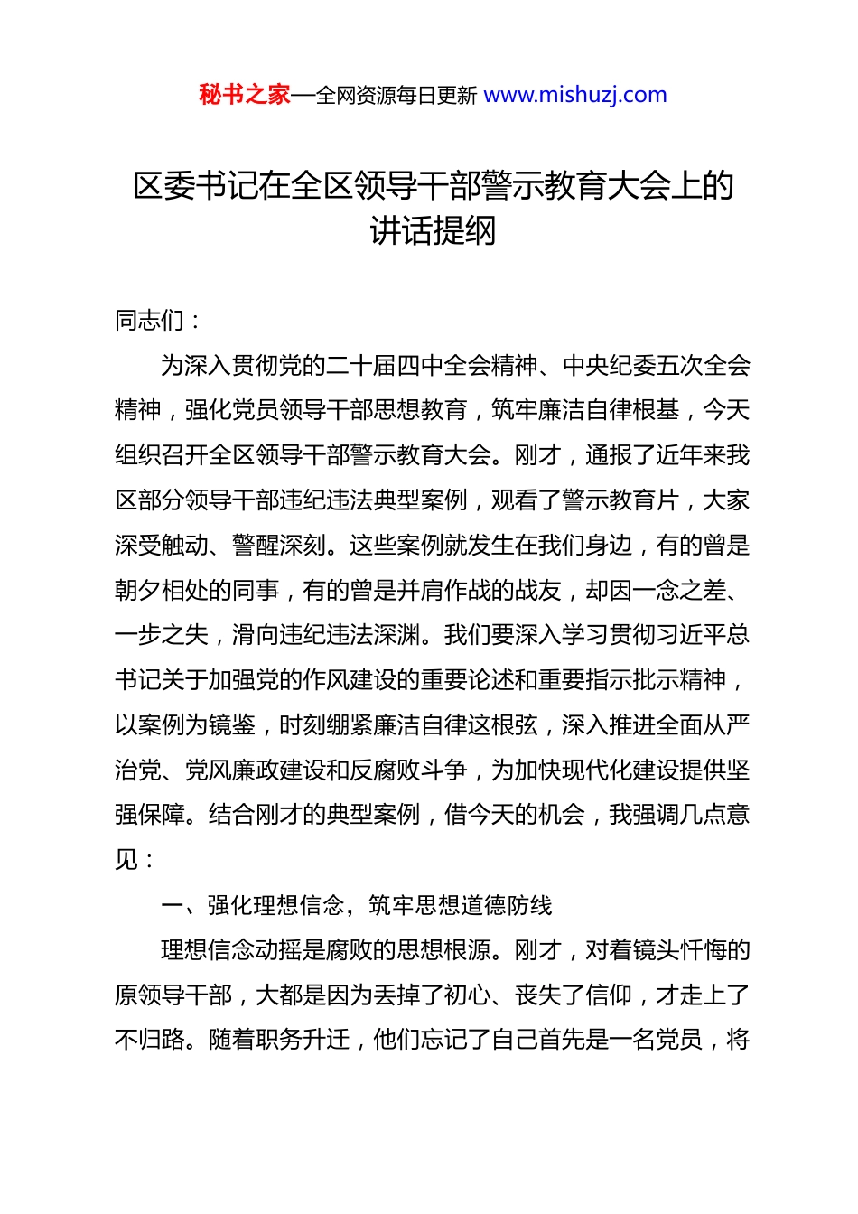 秘书之家—全网资源每日更新 www.mishuzj.com区委书记在全区领导干部警示教育大会上的讲话提纲 同志们:为深入贯彻党的二十届四中全会精神、中央纪委五次全会精神,强化党员领导干部思想教育,筑牢廉洁自律根基,今天组织召开全区领导干部警示教育大会。刚才,通报了近年来我区部分领导干部违纪违法典型案例,观看了警示教育片,大家深受触动、警醒深刻。这些案例就发生在我们身边,有的曾是朝夕相处的同事,有的曾是并肩作战的战友,却因一念之差、一步之失,滑向违纪违法深渊。我们要深入学习贯彻习近平总书记关于加强党的作风建设的重要论述和重要指示批示精神,以案例为镜鉴,时刻绷紧廉洁自律这根弦,深入推进全面从严治党、党风廉政建设和反腐败斗争,为加快现代化建设提供坚强保障。结合刚才的典型案例,借今天的机会,我强调几点意见:一、强化理想信念,筑牢思想道德防线理想信念动摇是腐败的思想根源。刚才,对着镜头忏悔的原领导干部,大都是因为丢掉了初心、丧失了信仰,才走上了不归路。随着职务升迁,他们忘记了自己首先是一名党员,将秘书之家—全网资源每日更新 www.mishuzj.com党章党规抛在脑后,把人民赋予的权力当作谋取私利的工具,最终身败名裂、追悔莫及。同志们,理想信念不是抽象的口号,而是具体的实践;不是一时的表态,而是一生的坚守。必须坚持学思用贯通、知信行统一,从思想深处拧紧“总开关”,真正把坚定理想信念作为终身课题,常修常炼、常悟常进。如何强化理想信念,这里我提三点要求:首先,加强理论学习是基本方法。理论上清醒,政治上才能坚定。要扎实掌握马克思主义立场、观点、方法,切实提升马克思主义理论水平和运用能力。要深入学习贯彻习近平新时代中国特色社会主义思想,坚持学而信、学而思、学而行,把学习成果转化为不可撼动的理想信念,转化为正确的世界观、人生观、价值观。其次,坚持党性锤炼是根本途径。作为党员干部,要自觉加强党性修养、党性锻炼。要始终牢记,形成坚定理想信念,既不是一蹴而就的,也不是一劳永逸的,而是要在斗争实践中不断砥砺、经受考验,只有见诸行动才有说服力,必须把党性锻炼融入日常、抓在经常,做到在大是大非面前旗帜鲜明,在风浪考验面前无所畏惧,在各种诱惑面前立场坚定。要知行合一、言行一致,以坚强党性和实际行动为实现共产主义远大理想不懈奋斗。最后,筑牢宗旨意识是根本途径。“权为民所系,利为民所谋”。党员干部是人民的公仆,手中的权力是用来为人民秘书之家—全网资源每日更新 www.mishuzj.com谋幸福的,而不是谋取个人私利的工具。要用心用情用力解决好就业、教育、医疗、养老、住房等民生领域突出问题,一件事情接着一件事情办,一年接着一年干,努力让人民群众的获得感成色更足、幸福感更可持续、安全感更有保障,不断厚植党执政的群众基础。二、强化主体责任,抓实党风廉政建设只有牢固树立守土有责的担当意识,在真抓常抓上下功夫在严抓细抓上见真章,在敢抓善抓上求实效,切实把党风廉政建设责任扛在肩上、抓在手上、落实到行动上。要坚持一级抓一级、层层抓落实,党委(党组)书记要履行好第一责任人职责,班子成员要严格落实“一岗双责”,做到管业务必须管廉政、抓工作必须抓作风。对责任不落实、措施不到位、问题不整改的,要严肃追责问责,真正让失责必问、问责必严成为常态。如何落实党风廉政建设主体责任,这里我认为要落实好四个方面的责任:一是落实组织领导责任。牢固树立“抓好党风廉政建设是本职、不抓就是失职、抓不好就是渎职”的思想,靠前指挥、主动上手,做到重要工作亲自部署、重大问题亲自过问、重点环节亲自协调、重要案件亲自督办,真正种好党风廉政建设“责任田”。关注分管领域最新动态,做到抓早抓小、秘书之家—全网资源每日更新 www.mishuzj.com防微杜渐,把纪律规矩挺在前面;要注重用身边事教育身边人,常态化开展警示教育,对苗头性倾向性问题及时提醒、批评、纠正,防止小毛病演变成大问题。二是落实教育监管责任。加强对分管部门和单位党员干部从严进行教育管理监督,经常性咬耳扯袖、红脸出汗,对苗头性、倾向性问题,早发现、早提醒...