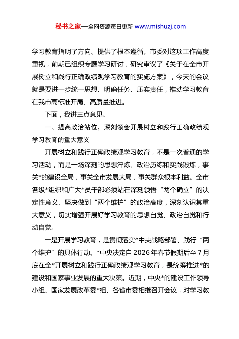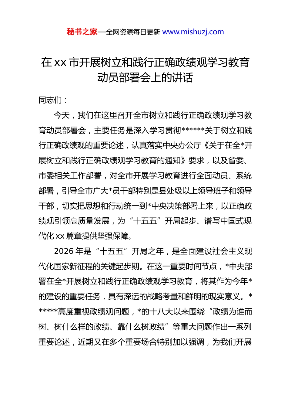 秘书之家—全网资源每日更新 www.mishuzj.com在 xx 市开展树立和践行正确政绩观学习教育动员部署会上的讲话同志们:今天,我们在这里召开全市树立和践行正确政绩观学习教育动员部署会,主要任务是深入学习贯彻******关于树立和践行正确政绩观的重要论述,认真落实中央办公厅《关于在全*开展树立和践行正确政绩观学习教育的通知》要求,以及省委、市委相关工作部署,对全市开展学习教育进行全面动员、系统部署,引导全市广大*员干部特别是县处级以上领导班子和领导干部,切实把思想和行动统一到*中央决策部署上来,以正确政绩观引领高质量发展,为“十五五”开局起步、谱写中国式现代化 xx 篇章提供坚强保障。2026 年是“十五五”开局之年,是全面建设社会主义现代化国家新征程的关键起步期。在这一重要时间节点,*中央部署在全*开展树立和践行正确政绩观学习教育,将其作为今年*的建设的重要任务,具有深远的战略考量和鲜明的现实意义。******高度重视政绩观问题,*的十八大以来围绕“政绩为谁而树、树什么样的政绩、靠什么树政绩”等重大问题作出一系列重要论述,近期又在多个重要场合特别加以强调,为我们开展秘书之家—全网资源每日更新 www.mishuzj.com学习教育指明了方向、提供了根本遵循。市委对这项工作高度重视,前期已组织专题学习研讨,研究审议了《关于在全市开展树立和践行正确政绩观学习教育的实施方案》,今天的会议就是要进一步统一思想、明确任务、压实责任,推动学习教育在我市高标准开局、高质量推进。下面,我讲三点意见。一、提高政治站位,深刻领会开展树立和践行正确政绩观学习教育的重大意义开展树立和践行正确政绩观学习教育,不是一次普通的学习活动,而是一场深刻的思想淬炼、政治历练和实践锻炼,事关*的建设全局,事关全市发展大局,事关群众根本利益。全市各级*组织和广大*员干部必须站在深刻领悟“两个确立”的决定性意义、坚决做到“两个维护”的政治高度,深刻认识其重大意义,切实增强开展好学习教育的思想自觉、政治自觉和行动自觉。一是开展学习教育,是贯彻落实*中央战略部署、践行“两个维护”的具体行动。*中央决定自 2026 年春节假期后至 7 月底在全*开展树立和践行正确政绩观学习教育,是统筹推进*的建设和国家事业发展的重大决策。近期,中央*的建设工作领导小组、国家发展改革委*组、各省市委相继召开会议,对学习教秘书之家—全网资源每日更新 www.mishuzj.com育作出具体部署,充分体现了*中央抓这项工作的坚定决心。我们必须坚决对标对表,把开展学习教育作为坚定拥护“两个确立”、坚决做到“两个维护”的实际行动,不折不扣落实好*中央和省委的各项要求,确保学习教育始终沿着正确政治方向推进。二是开展学习教育,是推动 xx 高质量发展、实现“十五五”良好开局的迫切需要。当前,我市正处于转型升级、爬坡过坎的关键阶段,“十五五”规划编制实施全面启动,各项重点工作开局起步。越是任务艰巨、责任重大,越需要树立正确的政绩观,越需要以实干实绩破解发展难题。从前期调研和日常工作来看,我市绝大多数*员干部能够坚持正确政绩观,真抓实干、担当作为,推动全市经济社会发展取得了显著成效。但也必须清醒看到,少数干部仍存在政绩观偏差,有的急功近利、急于求成,热衷于做“表面文章”“形象工程”;有的重显绩、轻潜绩,对打基础、利长远的工作重视不够;有的脱离实际、违背规律,盲目决策、乱铺摊子,这些问题不仅影响工作推进,更会阻碍高质量发展。开展学习教育,就是要引导广大干部校准政绩观偏差,把心思用在干事业上,把精力投到抓落实中,以实实在在的工作成效推动“十五五”开好局、起好步。秘书之家—全网资源每日更新 www.mishuzj.com三是开展学习教育,是践行*的根本宗旨、夯实*的执政根基的重要举措。政绩观连着群众观,政绩好不好,群众最有发言权。******强调,“为民造福是最大的政绩”。近年来,我们始终坚持以人民为中心的发展思想,聚焦群众急难愁盼问题,扎实推进老旧小区改造、就业增收、教育医疗提质等民生实事,群众的获得感、幸福感、安全感不断提升。但部分干部仍存在宗旨意识不强、...