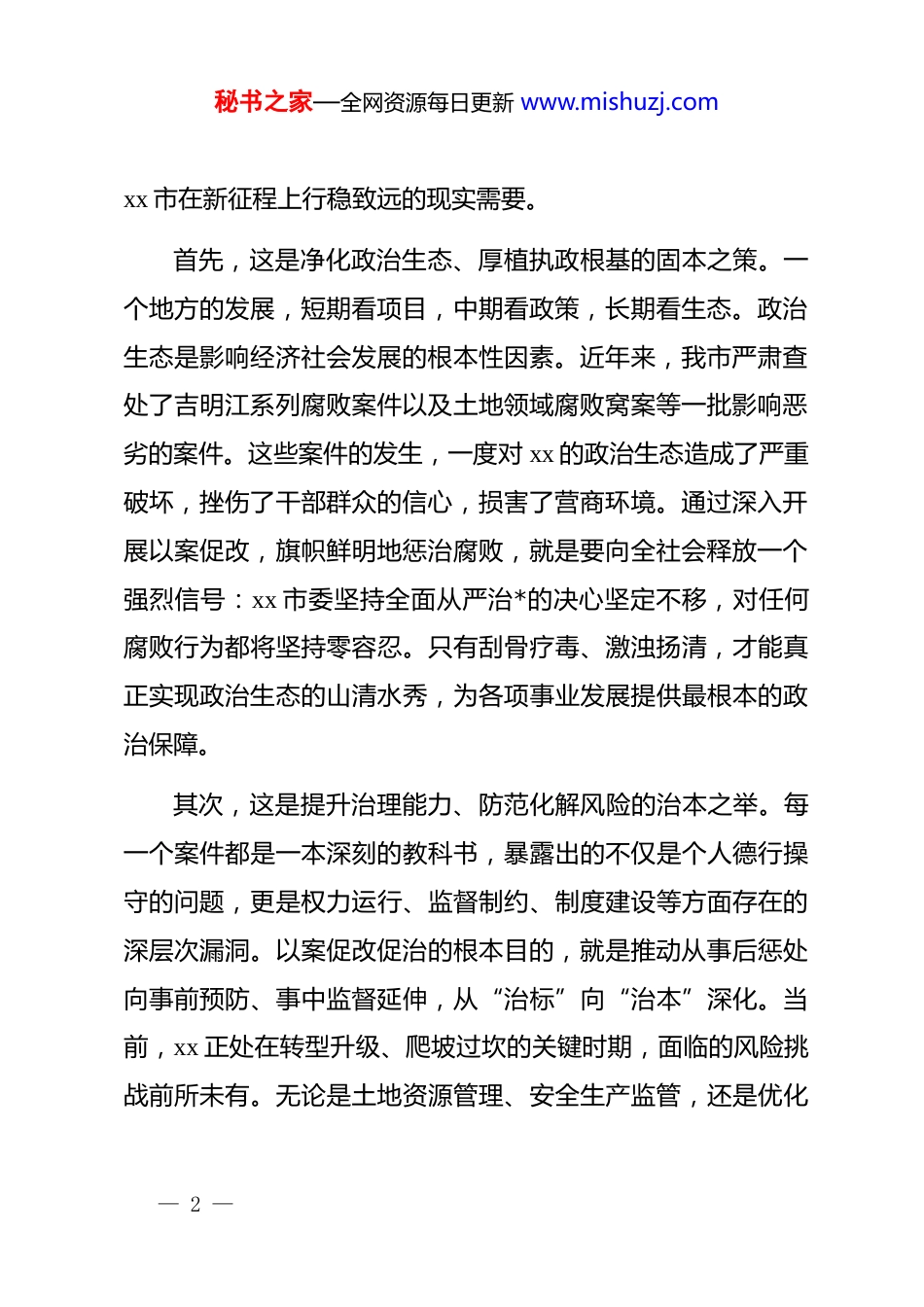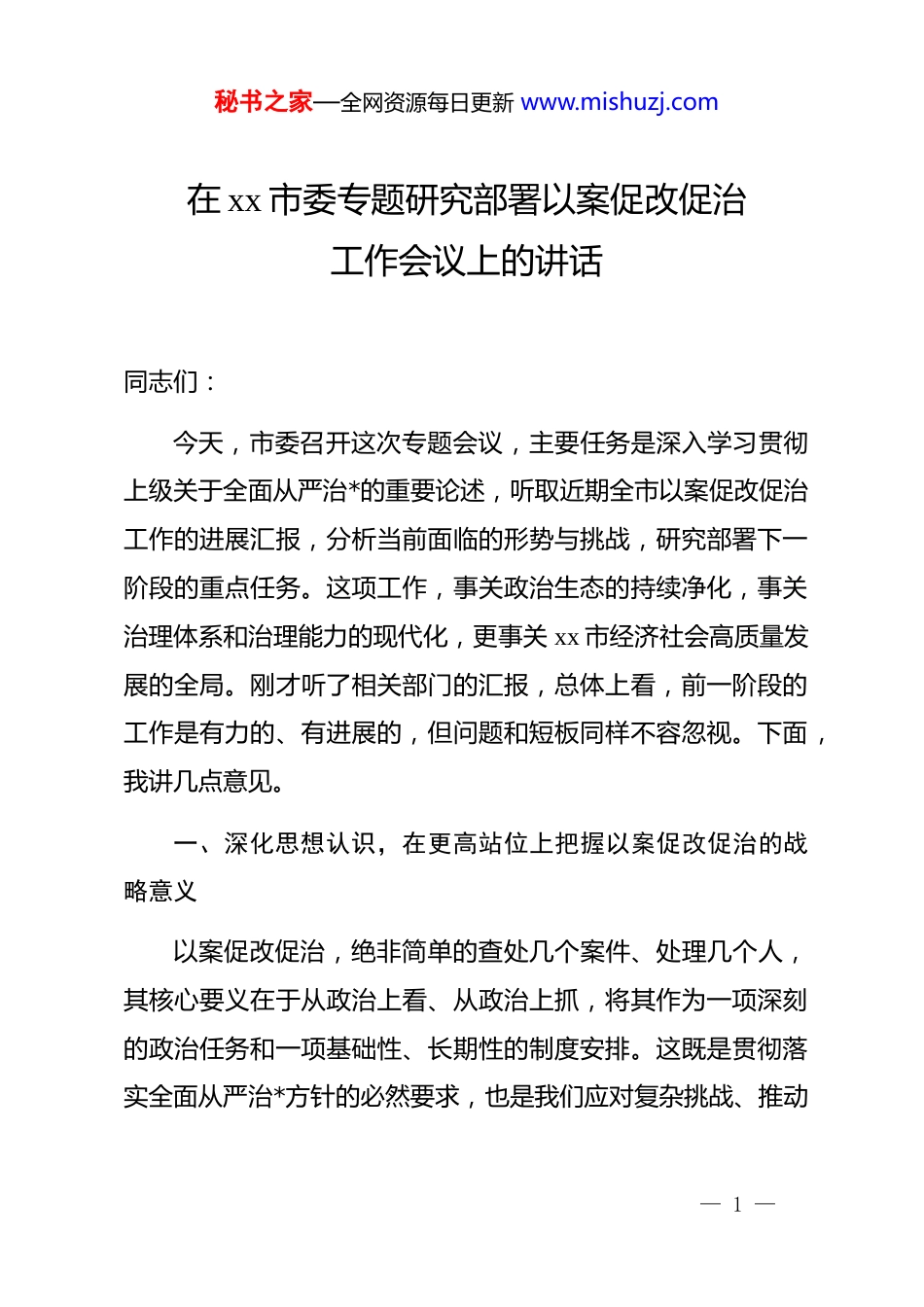 秘书之家—全网资源每日更新 www.mishuzj.com在 xx 市委专题研究部署以案促改促治工作会议上的讲话同志们:今天,市委召开这次专题会议,主要任务是深入学习贯彻上级关于全面从严治*的重要论述,听取近期全市以案促改促治工作的进展汇报,分析当前面临的形势与挑战,研究部署下一阶段的重点任务。这项工作,事关政治生态的持续净化,事关治理体系和治理能力的现代化,更事关 xx 市经济社会高质量发展的全局。刚才听了相关部门的汇报,总体上看,前一阶段的工作是有力的、有进展的,但问题和短板同样不容忽视。下面,我讲几点意见。一、深化思想认识,在更高站位上把握以案促改促治的战略意义以案促改促治,绝非简单的查处几个案件、处理几个人,其核心要义在于从政治上看、从政治上抓,将其作为一项深刻的政治任务和一项基础性、长期性的制度安排。这既是贯彻落实全面从严治*方针的必然要求,也是我们应对复杂挑战、推动— 1 —秘书之家—全网资源每日更新 www.mishuzj.comxx 市在新征程上行稳致远的现实需要。首先,这是净化政治生态、厚植执政根基的固本之策。一个地方的发展,短期看项目,中期看政策,长期看生态。政治生态是影响经济社会发展的根本性因素。近年来,我市严肃查处了吉明江系列腐败案件以及土地领域腐败窝案等一批影响恶劣的案件。这些案件的发生,一度对 xx 的政治生态造成了严重破坏,挫伤了干部群众的信心,损害了营商环境。通过深入开展以案促改,旗帜鲜明地惩治腐败,就是要向全社会释放一个强烈信号:xx 市委坚持全面从严治*的决心坚定不移,对任何腐败行为都将坚持零容忍。只有刮骨疗毒、激浊扬清,才能真正实现政治生态的山清水秀,为各项事业发展提供最根本的政治保障。其次,这是提升治理能力、防范化解风险的治本之举。每一个案件都是一本深刻的教科书,暴露出的不仅是个人德行操守的问题,更是权力运行、监督制约、制度建设等方面存在的深层次漏洞。以案促改促治的根本目的,就是推动从事后惩处向事前预防、事中监督延伸,从“治标”向“治本”深化。当前,xx 正处在转型升级、爬坡过坎的关键时期,面临的风险挑战前所未有。无论是土地资源管理、安全生产监管,还是优化— 2 —秘书之家—全网资源每日更新 www.mishuzj.com营商环境,任何一个环节的治理短板都可能演变为发展的“绊脚石”甚至是“引爆点”。必须坚持系统观念,通过解剖一个案例,解决一类问题,完善一方治理,做到查处一案、警示一片、治理一域,切实把制度的笼子扎得更紧更牢,全面提升防范化解重大风险的能力。最后,这是凝聚发展合力、推动高质量发展的赋能之要。发展的动力源于风清气正的环境和干部担当作为的精气神。以案促改促治,就是要通过惩治腐败、弘扬正气,破除影响发展的“潜规则”,消除阻碍创新的“中梗阻”,从而构建亲清统一的新型政商关系。当权力在阳光下运行,当市场竞争公平有序,当干部队伍清正廉洁,各类市场主体的活力和创造力才能被充分激发。实践证明,将整改成果转化为治理效能,进而转化为推动高质量发展的强大动力,是实现标本兼治的必由之路。进入“十五五”规划的开局之年,全市经济要实现年均增长7.5%左右的目标,没有优良的作风和环境作保障,一切都是空谈。二、坚持问题导向,以更严标准审视以案促改促治的短板弱项在肯定成绩的同时,必须清醒地看到,我市的以案促改促— 3 —秘书之家—全网资源每日更新 www.mishuzj.com治工作与上级的要求和群众的期盼相比,还存在一些不容忽视的问题。有的问题还比较突出,必须引起高度警觉。一是责任传导存在“上热下冷”现象。从调研情况看,市委层面高度重视,反复强调、持续部署。但压力传导到一些部门和基层单位时,出现了衰减。有的单位把开警示教育会、传达文件等同于以案促改的全部,满足于“开了会、发了文”,但在深挖根源、建章立制等关键环节上用心用力不够。这种“空转”现象,导致整改工作浮于表面,难以触及根本。二是“后半篇文章”做得不够深不够实。一些单位在案件查处后,满足于就事论事,对案件暴露出的共性问题和深层次矛盾缺乏系统性研判。整改措施往往针对具体人、具...