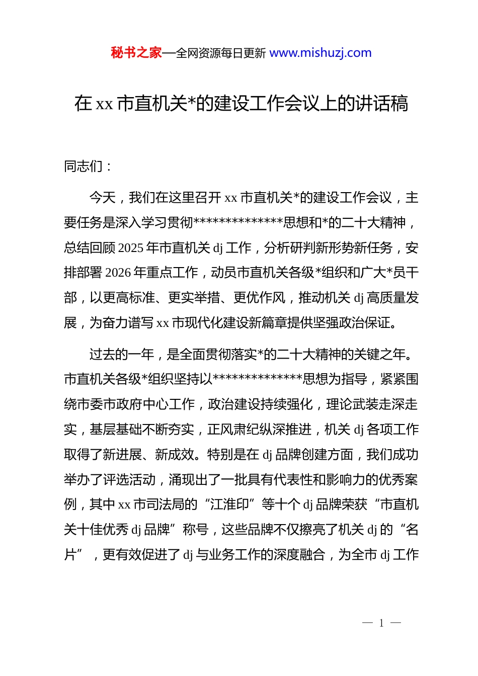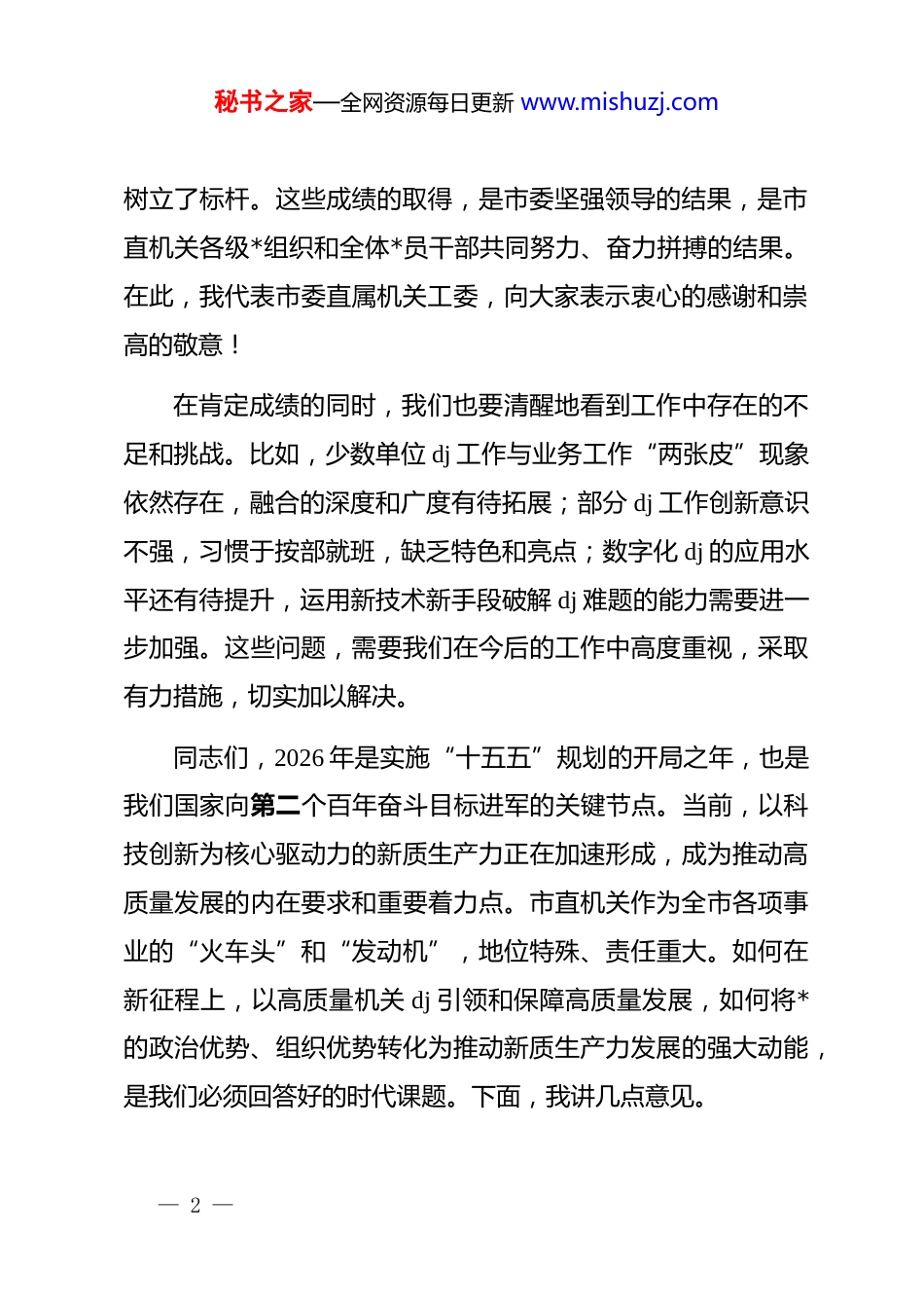 秘书之家—全网资源每日更新 www.mishuzj.com在 xx 市直机关*的建设工作会议上的讲话稿同志们:今天,我们在这里召开 xx 市直机关*的建设工作会议,主要任务是深入学习贯彻**************思想和*的二十大精神,总结回顾 2025 年市直机关 dj 工作,分析研判新形势新任务,安排部署 2026 年重点工作,动员市直机关各级*组织和广大*员干部,以更高标准、更实举措、更优作风,推动机关 dj 高质量发展,为奋力谱写 xx 市现代化建设新篇章提供坚强政治保证。过去的一年,是全面贯彻落实*的二十大精神的关键之年。市直机关各级*组织坚持以**************思想为指导,紧紧围绕市委市政府中心工作,政治建设持续强化,理论武装走深走实,基层基础不断夯实,正风肃纪纵深推进,机关 dj 各项工作取得了新进展、新成效。特别是在 dj 品牌创建方面,我们成功举办了评选活动,涌现出了一批具有代表性和影响力的优秀案例,其中 xx 市司法局的“江淮印”等十个 dj 品牌荣获“市直机关十佳优秀 dj 品牌”称号,这些品牌不仅擦亮了机关 dj 的“名片”,更有效促进了 dj 与业务工作的深度融合,为全市 dj 工作— 1 —秘书之家—全网资源每日更新 www.mishuzj.com树立了标杆。这些成绩的取得,是市委坚强领导的结果,是市直机关各级*组织和全体*员干部共同努力、奋力拼搏的结果。在此,我代表市委直属机关工委,向大家表示衷心的感谢和崇高的敬意!在肯定成绩的同时,我们也要清醒地看到工作中存在的不足和挑战。比如,少数单位 dj 工作与业务工作“两张皮”现象依然存在,融合的深度和广度有待拓展;部分 dj 工作创新意识不强,习惯于按部就班,缺乏特色和亮点;数字化 dj 的应用水平还有待提升,运用新技术新手段破解 dj 难题的能力需要进一步加强。这些问题,需要我们在今后的工作中高度重视,采取有力措施,切实加以解决。同志们,2026 年是实施“十五五”规划的开局之年,也是我们国家向第二个百年奋斗目标进军的关键节点。当前,以科技创新为核心驱动力的新质生产力正在加速形成,成为推动高质量发展的内在要求和重要着力点。市直机关作为全市各项事业的“火车头”和“发动机”,地位特殊、责任重大。如何在新征程上,以高质量机关 dj 引领和保障高质量发展,如何将*的政治优势、组织优势转化为推动新质生产力发展的强大动能,是我们必须回答好的时代课题。下面,我讲几点意见。— 2 —秘书之家—全网资源每日更新 www.mishuzj.com一、聚焦政治引领筑牢高质量发展的思想根基机关首先是政治机关,政治属性是第一属性。市直机关的一切工作,都必须旗帜鲜明讲政治,确保始终沿着正确的方向前进。一要持续强化理论武装。坚持把学习贯彻**************思想作为首要政治任务,巩固拓展 zt 教育成果。要深刻认识到,新质生产力这一重大理论创新,是***经济思想的最新成果,我们必须先学一步、深学一层。各级*组织要通过理论学习中心组、“三会一课”、主题*日等形式,组织*员干部原原本本学、联系实际学,深刻理解新质生产力的核心要义、丰富内涵和实践要求。要引导广大*员干部自觉做*的创新理论的坚定信仰者和忠实实践者,不断提高政治判断力、政治领悟力、政治执行力,以理论上的清醒保证政治上的坚定。二要坚决做到“两个维护”。要把对*绝对忠诚作为根本政治要求,深刻领悟“两个确立”的决定性意义,增强“四个意识”、坚定“四个自信”、做到“两个维护”。要严明政治纪律和政治规矩,确保*中央决策部署和省委、市委工作要求在市直机关不折不扣得到贯彻落实。要将贯彻落实的成效作为检验dj 成效的试金石,确保市委市政府的各项工作部署,特别是关— 3 —秘书之家—全网资源每日更新 www.mishuzj.com于发展新质生产力、推进高质量发展的战略举措,都能在市直机关落地生根、开花结果。三要严肃*内政治生活。高质量的*内政治生活是淬炼*性、提升政治能力的重要熔炉。要严格执行新形势下*内政治生活若干准则,提高民主生活会和组织生活会质量,用好批评和自我批评这个锐利武器,让*员干部在严肃认真的*内政治生活中“红脸出汗”、排毒治病。要...