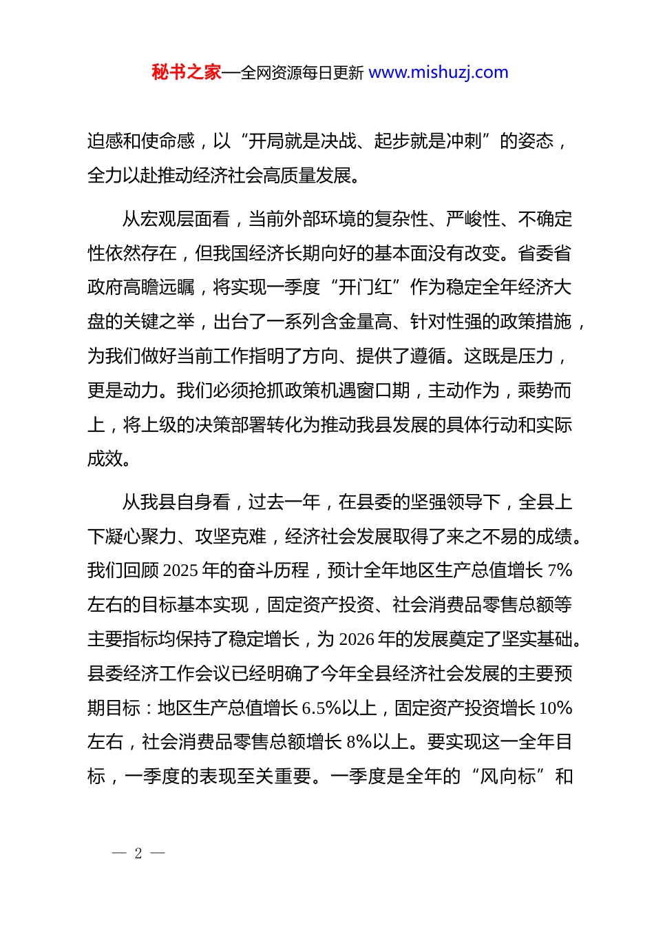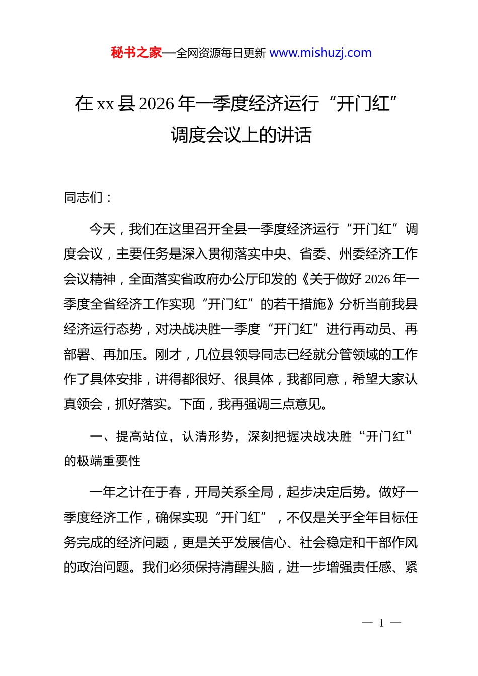 秘书之家—全网资源每日更新 www.mishuzj.com在 xx 县 2026 年一季度经济运行“开门红”调度会议上的讲话同志们:今天,我们在这里召开全县一季度经济运行“开门红”调度会议,主要任务是深入贯彻落实中央、省委、州委经济工作会议精神,全面落实省政府办公厅印发的《关于做好 2026 年一季度全省经济工作实现“开门红”的若干措施》分析当前我县经济运行态势,对决战决胜一季度“开门红”进行再动员、再部署、再加压。刚才,几位县领导同志已经就分管领域的工作作了具体安排,讲得都很好、很具体,我都同意,希望大家认真领会,抓好落实。下面,我再强调三点意见。一、提高站位,认清形势,深刻把握决战决胜“开门红”的极端重要性一年之计在于春,开局关系全局,起步决定后势。做好一季度经济工作,确保实现“开门红”,不仅是关乎全年目标任务完成的经济问题,更是关乎发展信心、社会稳定和干部作风的政治问题。我们必须保持清醒头脑,进一步增强责任感、紧— 1 —秘书之家—全网资源每日更新 www.mishuzj.com迫感和使命感,以“开局就是决战、起步就是冲刺”的姿态,全力以赴推动经济社会高质量发展。从宏观层面看,当前外部环境的复杂性、严峻性、不确定性依然存在,但我国经济长期向好的基本面没有改变。省委省政府高瞻远瞩,将实现一季度“开门红”作为稳定全年经济大盘的关键之举,出台了一系列含金量高、针对性强的政策措施,为我们做好当前工作指明了方向、提供了遵循。这既是压力,更是动力。我们必须抢抓政策机遇窗口期,主动作为,乘势而上,将上级的决策部署转化为推动我县发展的具体行动和实际成效。从我县自身看,过去一年,在县委的坚强领导下,全县上下凝心聚力、攻坚克难,经济社会发展取得了来之不易的成绩。我们回顾 2025 年的奋斗历程,预计全年地区生产总值增长 7%左右的目标基本实现,固定资产投资、社会消费品零售总额等主要指标均保持了稳定增长,为 2026 年的发展奠定了坚实基础。县委经济工作会议已经明确了今年全县经济社会发展的主要预期目标:地区生产总值增长 6.5%以上,固定资产投资增长 10%左右,社会消费品零售总额增长 8%以上。要实现这一全年目标,一季度的表现至关重要。一季度是全年的“风向标”和— 2 —秘书之家—全网资源每日更新 www.mishuzj.com“信号灯”,一季度工作抓得紧不紧、实不实,直接决定了我们在全年工作中的主动权。如果一季度开了“好头”,就能提振士气、稳定预期、赢得主动;反之,如果起步缓慢、开局不力,后续要追赶上来,就要付出加倍的努力。当前,距离一季度结束只剩下不到两个月的时间,正处于决战冲刺的关键时期。我们必须清醒地看到,工作中还存在一些不容忽视的短板和弱项。例如,部分经济指标支撑不强、项目谋划储备不足、企业发展面临要素制约、消费潜力有待进一步挖掘等问题依然突出。对此,全县各级各部门务必高度警醒,对照既定目标,逐项梳理分析,找准差距短板,以更加昂扬的斗志、更加务实的作风、更加有力的举措,全力以赴抓推进、抓落实、抓见效,坚决打赢一季度“开门红”这场硬仗。二、聚焦重点,精准发力,全力夺取“开门红”的全面胜利实现一季度“开门红”,不能停留在口号上,必须落实到具体的行动中,体现到实实在在的指标上。全县上下要牢固树立“项目为王”的理念,紧紧围绕“四新”主攻“四化”,以超常规的力度和举措,狠抓各项工作落实,确保主要经济指标增速高于全州平均水平。(一)全力以赴抓项目、扩投资,筑牢“开门红”的坚实— 3 —秘书之家—全网资源每日更新 www.mishuzj.com支撑。投资是拉动经济增长最直接、最有效的手段。我们必须始终把项目建设作为经济工作的“生命线”,形成谋划一批、储备一批、开工一批、投产一批的良性循环。一要加快在建项目进度。对已开工的续建项目,尤其是像 2025 年延续下来的易地搬迁安置区维修维护等项目,要倒排工期、挂图作战,在确保安全和质量的前提下,能快则快,尽快形成更多实物工作量。各项目责任单位要主动靠前服务,及时解决项目建设中遇到的征地拆迁、手续办理、要素保障等难题。二要推动新建项目早开工...