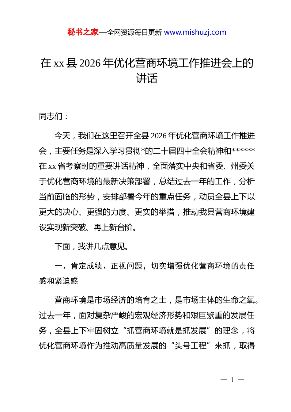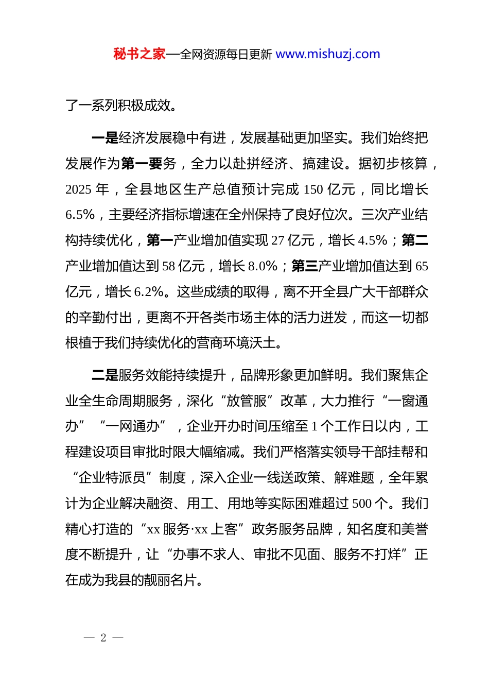 秘书之家—全网资源每日更新 www.mishuzj.com在 xx 县 2026 年优化营商环境工作推进会上的讲话同志们:今天,我们在这里召开全县 2026 年优化营商环境工作推进会,主要任务是深入学习贯彻*的二十届四中全会精神和******在 xx 省考察时的重要讲话精神,全面落实中央和省委、州委关于优化营商环境的最新决策部署,总结过去一年的工作,分析当前面临的形势,安排部署今年的重点任务,动员全县上下以更大的决心、更强的力度、更实的举措,推动我县营商环境建设实现新突破、再上新台阶。下面,我讲几点意见。一、肯定成绩、正视问题,切实增强优化营商环境的责任感和紧迫感营商环境是市场经济的培育之土,是市场主体的生命之氧。过去一年,面对复杂严峻的宏观经济形势和艰巨繁重的发展任务,全县上下牢固树立“抓营商环境就是抓发展”的理念,将优化营商环境作为推动高质量发展的“头号工程”来抓,取得— 1 —秘书之家—全网资源每日更新 www.mishuzj.com了一系列积极成效。一是经济发展稳中有进,发展基础更加坚实。我们始终把发展作为第一要务,全力以赴拼经济、搞建设。据初步核算,2025 年,全县地区生产总值预计完成 150 亿元,同比增长6.5%,主要经济指标增速在全州保持了良好位次。三次产业结构持续优化,第一产业增加值实现 27 亿元,增长 4.5%;第二产业增加值达到 58 亿元,增长 8.0%;第三产业增加值达到 65亿元,增长 6.2%。这些成绩的取得,离不开全县广大干部群众的辛勤付出,更离不开各类市场主体的活力迸发,而这一切都根植于我们持续优化的营商环境沃土。二是服务效能持续提升,品牌形象更加鲜明。我们聚焦企业全生命周期服务,深化“放管服”改革,大力推行“一窗通办”“一网通办”,企业开办时间压缩至 1 个工作日以内,工程建设项目审批时限大幅缩减。我们严格落实领导干部挂帮和“企业特派员”制度,深入企业一线送政策、解难题,全年累计为企业解决融资、用工、用地等实际困难超过 500 个。我们精心打造的“xx 服务·xx 上客”政务服务品牌,知名度和美誉度不断提升,让“办事不求人、审批不见面、服务不打烊”正在成为我县的靓丽名片。— 2 —秘书之家—全网资源每日更新 www.mishuzj.com三是市场活力有效激发,主体培育更加壮大。我们坚持把培育壮大市场主体作为稳增长、保就业的重中之重。通过全面落实减税降费、援企稳岗等政策,全年新增减税降费及退税缓费超过 2 亿元,有效减轻了企业负担。我们积极搭建银企对接平台,引导金融机构加大对实体经济特别是中小微企业的信贷支持。截至 2025 年底,全县市场主体总量突破 4.5 万户,同比增长 11%,发展的内生动力和活力显著增强。在肯定成绩的同时,我们必须清醒地看到,对标国内一流水平,对照企业和群众的期盼,我县的营商环境仍存在一些不容忽视的短板和问题。主要表现在:一是思想认识存在“温差”。少数部门和干部仍然存在“官本位”思想,服务意识不强、换位思考不够,对优化营商环境的极端重要性认识不到位,没有真正把企业的事当作自己的事。二是政策落地存在“时差”。一些惠企政策在宣传解读、兑现落实上还不够及时、不够精准,存在“上面热、下面冷”“部门强、企业弱”的现象,政策红利未能完全转化为企业的发展实利。三是服务体验存在“落差”。在“获得电力”“办理破产”“执行合同”等一些关键指标上,我们的流程还不够简化,效率还不够高。个别执法部门在监管中存在简单化、“一刀切”的问题,对企业的正— 3 —秘书之家—全网资源每日更新 www.mishuzj.com常生产经营造成了一定影响。四是要素保障存在“偏差”。土地、资金、人才等关键要素的供给与企业快速发展的需求之间还存在矛盾,制约了部分优质项目和企业的落地成长。这些问题,是阻碍我们高质量发展的“绊脚石”,是必须下大力气解决的“硬骨头”。全县各级各部门必须高度重视,拿出刮骨疗毒的勇气,采取坚决有力的措施,切实加以解决。二、统一思想、深化认识,准确把握优化营商环境的战略意义和时代内涵在新的发展阶段,优化营商环境已经不是一道“选择题”,而是一道关乎发展全局的“必...