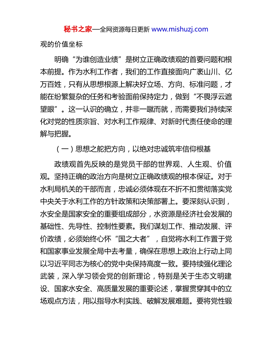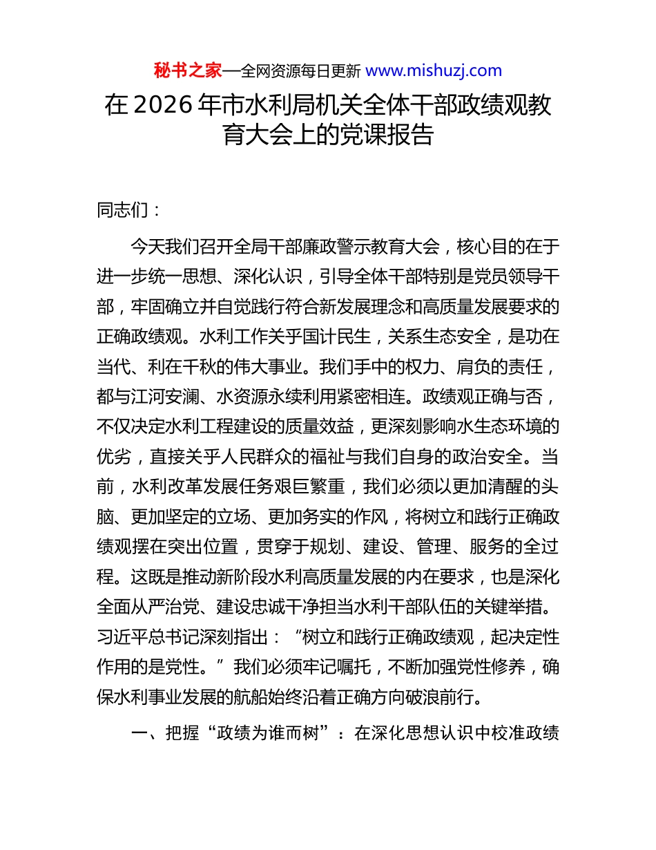 秘书之家—全网资源每日更新 www.mishuzj.com在 2026 年市水利局机关全体干部政绩观教育大会上的党课报告同志们:今天我们召开全局干部廉政警示教育大会,核心目的在于进一步统一思想、深化认识,引导全体干部特别是党员领导干部,牢固确立并自觉践行符合新发展理念和高质量发展要求的正确政绩观。水利工作关乎国计民生,关系生态安全,是功在当代、利在千秋的伟大事业。我们手中的权力、肩负的责任,都与江河安澜、水资源永续利用紧密相连。政绩观正确与否,不仅决定水利工程建设的质量效益,更深刻影响水生态环境的优劣,直接关乎人民群众的福祉与我们自身的政治安全。当前,水利改革发展任务艰巨繁重,我们必须以更加清醒的头脑、更加坚定的立场、更加务实的作风,将树立和践行正确政绩观摆在突出位置,贯穿于规划、建设、管理、服务的全过程。这既是推动新阶段水利高质量发展的内在要求,也是深化全面从严治党、建设忠诚干净担当水利干部队伍的关键举措。习近平总书记深刻指出:“树立和践行正确政绩观,起决定性作用的是党性。”我们必须牢记嘱托,不断加强党性修养,确保水利事业发展的航船始终沿着正确方向破浪前行。一、把握“政绩为谁而树”:在深化思想认识中校准政绩秘书之家—全网资源每日更新 www.mishuzj.com观的价值坐标明确“为谁创造业绩”是树立正确政绩观的首要问题和根本前提。作为水利工作者,我们的工作直接面向广袤山川、亿万百姓,只有从思想根源上解决好立场、方向、标准问题,才能在纷繁复杂的任务和考验面前保持定力,做到“不畏浮云遮望眼”。这一认识的确立,并非一蹴而就,而需要我们持续深化对党的性质宗旨、对水利工作规律、对新时代责任使命的理解与把握。(一)思想之舵把方向,以绝对忠诚筑牢信仰根基政绩观首先反映的是党员干部的世界观、人生观、价值观。坚持正确的政治方向是树立正确政绩观的根本保证。对于水利局机关的干部而言,忠诚必须体现在不折不扣贯彻落实党中央关于水利工作的方针政策和决策部署上。要深刻认识到,水安全是国家安全的重要组成部分,水资源是经济社会发展的基础性、先导性、控制性要素。我们谋划工作、推动发展、评价政绩,必须始终心怀“国之大者”,自觉将水利工作置于党和国家事业发展全局中去考量,确保在思想上政治上行动上同以习近平同志为核心的党中央保持高度一致。要持续强化理论武装,深入学习领会党的创新理论,特别是关于生态文明建设、国家水安全、高质量发展的重要论述,掌握贯穿其中的立场观点方法,用以指导水利实践、破解发展难题。要将党性锻秘书之家—全网资源每日更新 www.mishuzj.com炼作为终身课题,不断提高政治判断力、政治领悟力、政治执行力,在大是大非面前旗帜鲜明,在风浪考验面前无所畏惧,在各种诱惑面前立场坚定。习近平总书记强调:“只有党性坚强、摒弃私心杂念,才能保证政绩观不出偏差。”我们必须时刻对照检视,看自己的政绩观是否真正符合党的要求、人民的期盼,是否真正做到了对党忠诚、为党分忧、为党尽职、为民造福。(二)为民之心守初心,以赤子情怀站稳人民立场正确政绩观的本质是“为民造福”,衡量政绩的最终标准是人民群众的满意度、获得感、幸福感、安全感。水利工作与人民群众的生产生活息息相关,从饮水安全到防洪保安,从灌溉排涝到水环境改善,每一项工作都牵动着民心。必须始终坚持以人民为中心的发展思想,把实现好、维护好、发展好最广大人民根本利益作为一切水利工作的出发点和落脚点。谋划水利项目、制定水利政策、推进水利改革,首先要问需于民、问计于民,深入了解群众在水方面的“急难愁盼”问题,让水利发展成果更多更公平惠及全体人民。坚决反对那些脱离实际、劳民伤财的“形象工程”、“政绩工程”,坚决纠正那些为了个人升迁、部门利益而忽视群众诉求、损害群众利益的行为。要着力解决好人民群众最关心最直接最现实的水利问题,如农村供水保障、中小河流治理、水旱灾害防御、河湖生态复苏等,用实实在在的工作成效赢得群众的信任和支持。要畅通群秘书之家—全网资源每日更新 www.mishuzj.com众参与和监督渠道,认真倾听群众呼声,积极回应社...