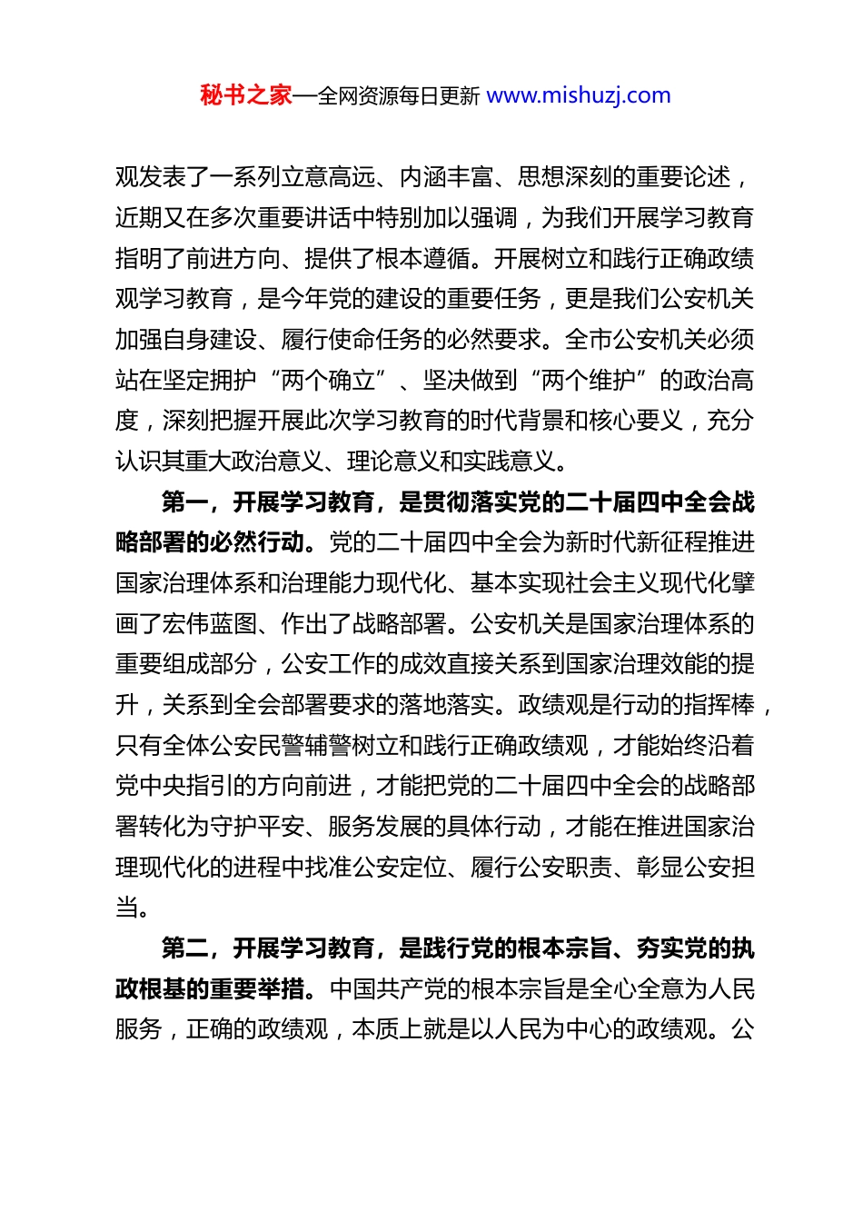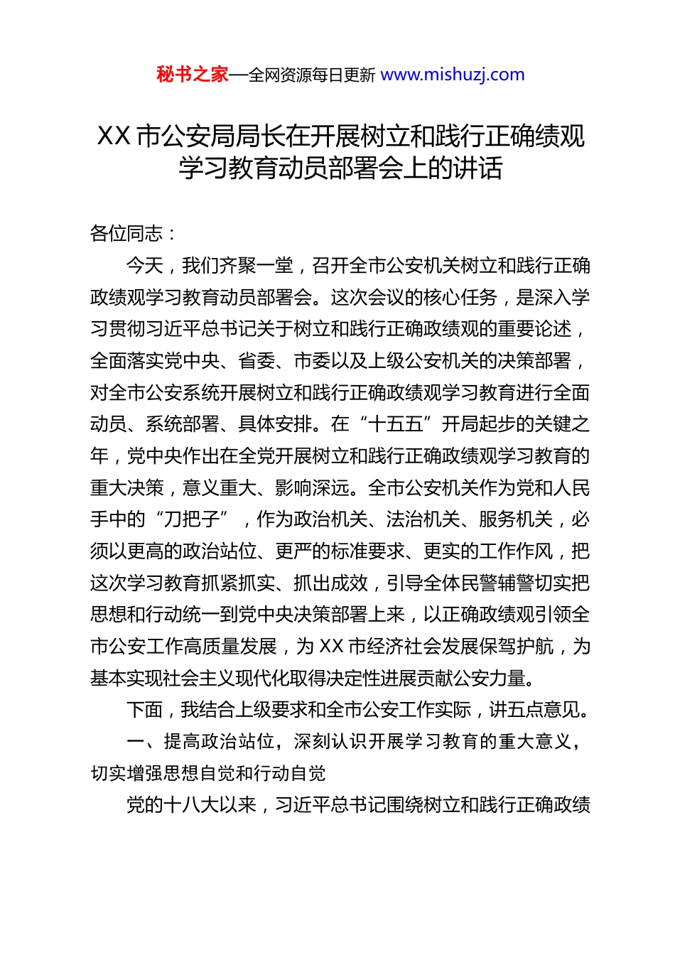 秘书之家—全网资源每日更新 www.mishuzj.comXX 市公安局局长在开展树立和践行正确绩观学习教育动员部署会上的讲话各位同志:今天,我们齐聚一堂,召开全市公安机关树立和践行正确政绩观学习教育动员部署会。这次会议的核心任务,是深入学习贯彻习近平总书记关于树立和践行正确政绩观的重要论述,全面落实党中央、省委、市委以及上级公安机关的决策部署,对全市公安系统开展树立和践行正确政绩观学习教育进行全面动员、系统部署、具体安排。在“十五五”开局起步的关键之年,党中央作出在全党开展树立和践行正确政绩观学习教育的重大决策,意义重大、影响深远。全市公安机关作为党和人民手中的“刀把子”,作为政治机关、法治机关、服务机关,必须以更高的政治站位、更严的标准要求、更实的工作作风,把这次学习教育抓紧抓实、抓出成效,引导全体民警辅警切实把思想和行动统一到党中央决策部署上来,以正确政绩观引领全市公安工作高质量发展,为 XX 市经济社会发展保驾护航,为基本实现社会主义现代化取得决定性进展贡献公安力量。下面,我结合上级要求和全市公安工作实际,讲五点意见。一、提高政治站位,深刻认识开展学习教育的重大意义,切实增强思想自觉和行动自觉党的十八大以来,习近平总书记围绕树立和践行正确政绩秘书之家—全网资源每日更新 www.mishuzj.com观发表了一系列立意高远、内涵丰富、思想深刻的重要论述,近期又在多次重要讲话中特别加以强调,为我们开展学习教育指明了前进方向、提供了根本遵循。开展树立和践行正确政绩观学习教育,是今年党的建设的重要任务,更是我们公安机关加强自身建设、履行使命任务的必然要求。全市公安机关必须站在坚定拥护“两个确立”、坚决做到“两个维护”的政治高度,深刻把握开展此次学习教育的时代背景和核心要义,充分认识其重大政治意义、理论意义和实践意义。第一,开展学习教育,是贯彻落实党的二十届四中全会战略部署的必然行动。党的二十届四中全会为新时代新征程推进国家治理体系和治理能力现代化、基本实现社会主义现代化擘画了宏伟蓝图、作出了战略部署。公安机关是国家治理体系的重要组成部分,公安工作的成效直接关系到国家治理效能的提升,关系到全会部署要求的落地落实。政绩观是行动的指挥棒,只有全体公安民警辅警树立和践行正确政绩观,才能始终沿着党中央指引的方向前进,才能把党的二十届四中全会的战略部署转化为守护平安、服务发展的具体行动,才能在推进国家治理现代化的进程中找准公安定位、履行公安职责、彰显公安担当。第二,开展学习教育,是践行党的根本宗旨、夯实党的执政根基的重要举措。中国共产党的根本宗旨是全心全意为人民服务,正确的政绩观,本质上就是以人民为中心的政绩观。公秘书之家—全网资源每日更新 www.mishuzj.com安机关植根人民、服务人民,我们的一切工作都是为了守护人民群众的生命财产安全、满足人民群众对美好生活的向往。开展此次学习教育,就是要引导全体民警辅警始终牢记“我是谁、为了谁、依靠谁”,把为民造福作为最大政绩,坚决摒弃脱离群众、漠视民生的错误倾向,用心用情解决好群众急难愁盼问题,让人民群众在每一次执法办案、每一次政务服务、每一次平安守护中都能感受到公平正义、体会到温暖关怀,不断厚植党执政的群众基础,让公安工作始终拥有最广泛、最深厚、最持久的人民支持。第三,开展学习教育,是巩固拓展党内集中学习教育成果持之以恒推进全面从严治党的有效途径。党的十八大以来,全党先后开展了一系列党内集中学习教育,推动党员干部党性修养不断提升、作风建设持续向好。公安机关作为纪律部队,全面从严治党、从严治警永远在路上。开展树立和践行正确政绩观学习教育,是对党内集中学习教育成果的巩固和拓展,更是针对当前部分党员干部可能存在的政绩观偏差问题的靶向整治。通过学习教育,我们要从党性根源上纠治错误思想、整改突出问题,坚决破除形式主义、官僚主义,推动全面从严管党治警向纵深发展,打造忠诚干净担当的公安铁军,确保公安队伍绝对忠诚、绝对纯洁、绝对可靠。第四,开展学习教育,是激励实干担当、推动全市公安工作高质量发展...