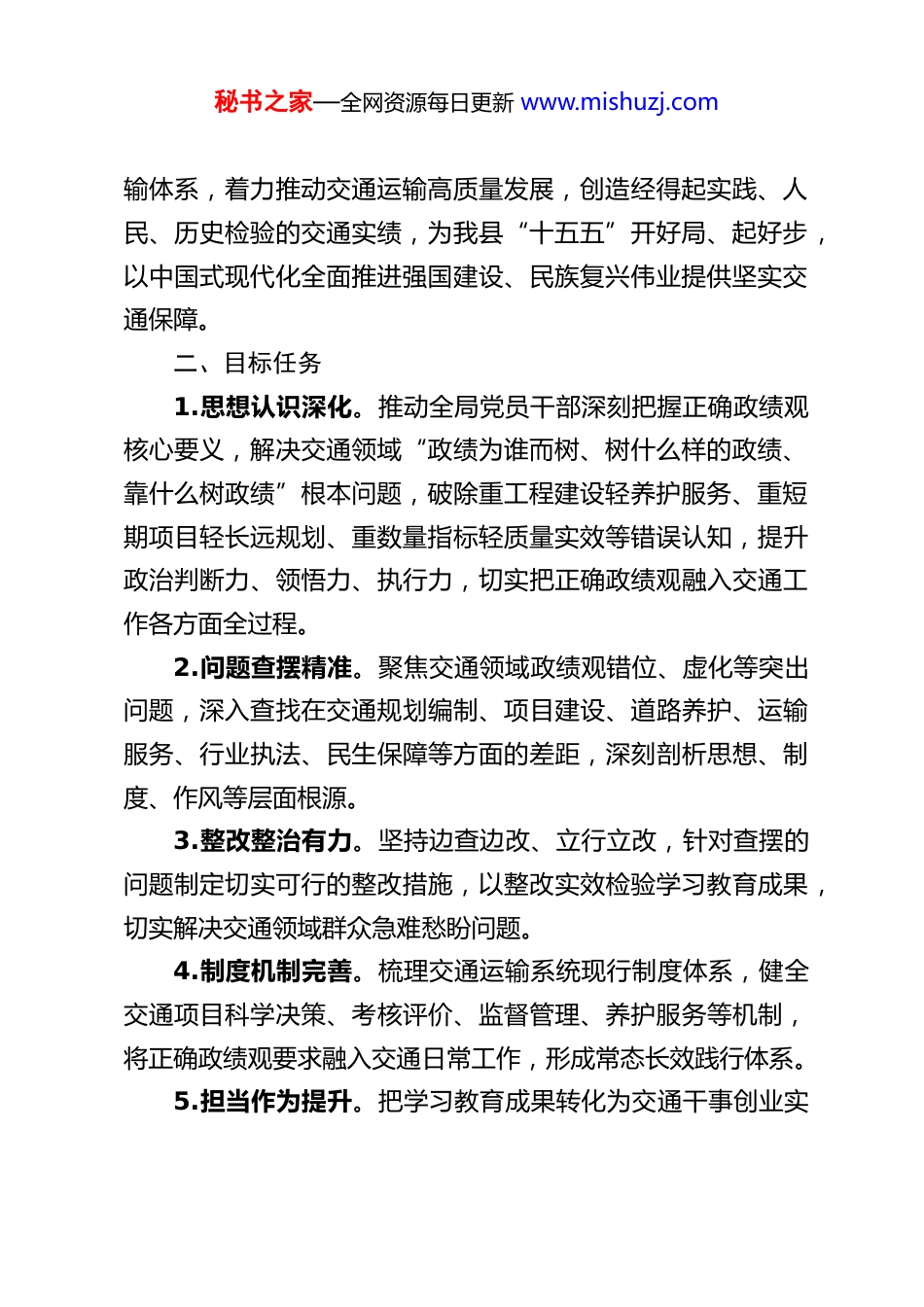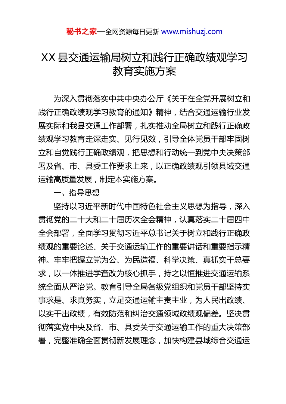 秘书之家—全网资源每日更新 www.mishuzj.comXX 县交通运输局树立和践行正确政绩观学习教育实施方案为深入贯彻落实中共中央办公厅《关于在全党开展树立和践行正确政绩观学习教育的通知》精神,结合交通运输行业发展实际和我县交通工作部署,扎实推动全局树立和践行正确政绩观学习教育走深走实、见行见效,引导全体党员干部牢固树立和自觉践行正确政绩观,把思想和行动统一到党中央决策部署及省、市、县委工作要求上来,以正确政绩观引领县域交通运输高质量发展,制定本实施方案。一、指导思想坚持以习近平新时代中国特色社会主义思想为指导,深入贯彻党的二十大和二十届历次全会精神,认真落实二十届四中全会部署,全面学习贯彻习近平总书记关于树立和践行正确政绩观的重要论述、关于交通运输工作的重要讲话和重要指示精神。牢牢把握立党为公、为民造福、科学决策、真抓实干总要求,以一体推进学查改为核心抓手,持之以恒推进交通运输系统全面从严治党。教育引导全局各级党组织和党员干部坚持实事求是、求真务实,立足交通运输主责主业,为人民出政绩、以实干出政绩,有效防范和纠治交通领域政绩观偏差。坚决贯彻落实党中央及省、市、县委关于交通运输工作的重大决策部署,完整准确全面贯彻新发展理念,加快构建县域综合交通运秘书之家—全网资源每日更新 www.mishuzj.com输体系,着力推动交通运输高质量发展,创造经得起实践、人民、历史检验的交通实绩,为我县“十五五”开好局、起好步,以中国式现代化全面推进强国建设、民族复兴伟业提供坚实交通保障。二、目标任务1.思想认识深化。推动全局党员干部深刻把握正确政绩观核心要义,解决交通领域“政绩为谁而树、树什么样的政绩、靠什么树政绩”根本问题,破除重工程建设轻养护服务、重短期项目轻长远规划、重数量指标轻质量实效等错误认知,提升政治判断力、领悟力、执行力,切实把正确政绩观融入交通工作各方面全过程。2.问题查摆精准。聚焦交通领域政绩观错位、虚化等突出问题,深入查找在交通规划编制、项目建设、道路养护、运输服务、行业执法、民生保障等方面的差距,深刻剖析思想、制度、作风等层面根源。3.整改整治有力。坚持边查边改、立行立改,针对查摆的问题制定切实可行的整改措施,以整改实效检验学习教育成果,切实解决交通领域群众急难愁盼问题。4.制度机制完善。梳理交通运输系统现行制度体系,健全交通项目科学决策、考核评价、监督管理、养护服务等机制,将正确政绩观要求融入交通日常工作,形成常态长效践行体系。5.担当作为提升。把学习教育成果转化为交通干事创业实秘书之家—全网资源每日更新 www.mishuzj.com际行动,激励全局党员干部立足岗位真抓实干,在农村公路建设、城乡客运优化、物流体系完善、行业安全监管等工作中主动担当,营造崇尚实干、为民造福的交通行业浓厚氛围。三、基本原则1.聚焦主题、简约务实。紧扣正确政绩观核心和交通运输主责主业,不搞形式主义、表面文章,突出问题导向、实践导向、效果导向,确保学习教育与交通工作深度融合、高效管用。2.一体推进、同步发力。不分批次、不划阶段,将学习研讨、查摆问题、整改整治、建章立制、开门教育贯穿学习教育全程,有机融合、相互促进,推动各环节落地见效。3.突出重点、全员覆盖。以局领导班子和领导干部特别是“一把手”、各股室及下属单位负责人为重点,覆盖全局全体党员干部,做到领导带头、以上率下,层层传导压力、层层抓好落实。4.开门教育、群众参与。坚持民生为大,把群众出行需求作为交通工作的出发点和落脚点,查摆问题听群众意见,整改整治受群众监督,成效让群众评判,让群众切实感受交通领域学习教育新变化、新成效。5.统筹结合、协同发力。将学习教育与中央巡视整改、中央八项规定精神整改、我县“十五五”交通运输发展规划实施、交通项目生态环保督察整改、农村公路提质改造、交通执法规范化建设等工作深度融合,一体推进、协同发力,提升工作整秘书之家—全网资源每日更新 www.mishuzj.com体效能。四、时间安排本次学习教育于 2026 年春节假期后全面启动,7 月底基本结束,全程压茬推进、有序落实,不搞阶段划...