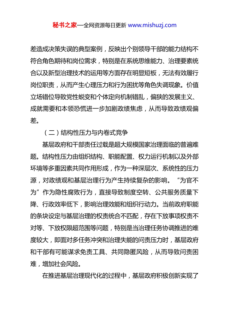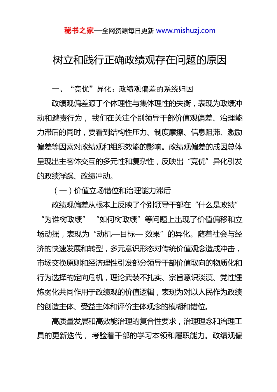 秘书之家—全网资源每日更新 www.mishuzj.com树立和践行正确政绩观存在问题的原因一、“竞优”异化:政绩观偏差的系统归因政绩观偏差源于个体理性与集体理性的失衡,表现为政绩冲动和避责行为, 我们在关注个别领导干部价值观偏差、治理能力滞后的同时,要看到结构性压力、制度摩擦、信息阻滞、激励偏差等因素对政绩观和组织效能的影响。政绩观偏差的成因总体呈现出主客体交互的多元性和复杂性,反映出“竞优”异化引发的政绩浮躁、政绩冲动。(一)价值立场错位和治理能力滞后政绩观偏差从根本上反映了个别领导干部在“什么是政绩”“为谁树政绩” “如何树政绩”等问题上出现了价值偏移和立场动摇,表现为“动机—目标— 效果”的异化。随着社会与经济的快速发展和转型,多元意识形态对传统价值观念造成冲击,市场交换原则和经济理性引发部分领导干部价值取向的物质化和行为选择的定向危机,理论武装不扎实、宗旨意识淡漠、党性锤炼弱化共同作用于政绩观的价值逻辑,表现为对以人民作为政绩的创造主体、受益主体和评价主体观念的模糊和错位。高质量发展和高效能治理的复合性要求,治理理念和治理工具的更新迭代, 考验着干部的学习本领和履职能力。政绩观偏秘书之家—全网资源每日更新 www.mishuzj.com差造成决策失误的典型案例,反映出个别领导干部的能力结构不符合角色期待和岗位需求,特别是在系统思维能力、治理要素统合以及新型治理技术的运用等方面存在明显短板,无法有效履行岗位职责,从而产生心理压力和行为困扰等角色失调现象。价值立场错位导致党性蜕变和个体定向机制错乱,偏狭的发展主义、成就需要和本领恐慌进一步加剧政绩焦虑,从而导致政绩观偏差。(二)结构性压力与内卷式竞争基层政府和干部责任过载是超大规模国家治理面临的普遍难题。结构性压力由组织结构、职能配置、权力运行机制以及外部环境等多重因素共同作用形成,作为一种深层次、系统性的压力源,对政绩观和基层治理行为产生持续复杂的影响。“为官不为”作为隐性腐败行为,直接导致制度空转、公共服务质量下降、行政效率低下,影响治理效能和组织行动力。当前政府职能的条块设定与基层治理的权责统合不匹配,存在下放事项权责不对等、下放权限超范围等问题,特别是当治理任务协调推进的难度较大,即面对多任务冲突和治理失能的问责压力时,基层政府和干部有可能谋求免责工具、共同隐匿风险,从而导致问责困难,增加社会风险。在推进基层治理现代化的过程中,基层政府积极创新实现了秘书之家—全网资源每日更新 www.mishuzj.com从自主探索向制度先行、从工作亮点向竞争标准的转变,但也必须高度警惕创新泛化为内卷式竞争的倾向。基层政府为争取政策资源和政绩表现,进行无序竞争和过度消耗,会造成行政行动与行政目标、治理资源投入与治理效能的分离。“苦干” 面纱下的“伪忙碌”源于“如何创造政绩”的定位偏差,内卷式竞争表面上是基层干部政绩观偏差与作风不实,实则是基层行政生态的退化与隐疾。 从典型案例中可以看到,个别地方政府为吸引投资或追求政绩指标,会采取降低监管标准、放松监管要求、压缩公共服务成本等手段,以期短期内提升本地经济指标或完成特定任务。这突出表现为环境保护标准降低、劳动权益保护弱化、公共服务质量下降,即“逐底比赛”现象,严重影响公共利益的实现。(三)政绩考评失当与激励偏差党的二十大报告指出,要完善干部考核评价体系,引导干部树立和践行正确政绩观。综合政绩考核制度不仅对领导干部的政治素质和治理能力提出了更高要求,同时也需要对治理目标分解、资源优化配置和政府职能调整等方面进行系统革新。首先,推动高质量发展的考核评价体系亟待健全。约束性指标、指导性指标、结果类指标和规则类指标的制度刚性不同,越往基层,附着在规则类指标上的“一票否决”项就秘书之家—全网资源每日更新 www.mishuzj.com越多,任期考核和项目式推进带来的“交卷”压力会促使领导干部倾向于选择短期见效的项目,忽视长期规划和可持续发展。其次,考核指标设计的制度刚性在一定程度上形塑干部的价值取向。在基层治理实践中,考核评估的失当行为会导致激...