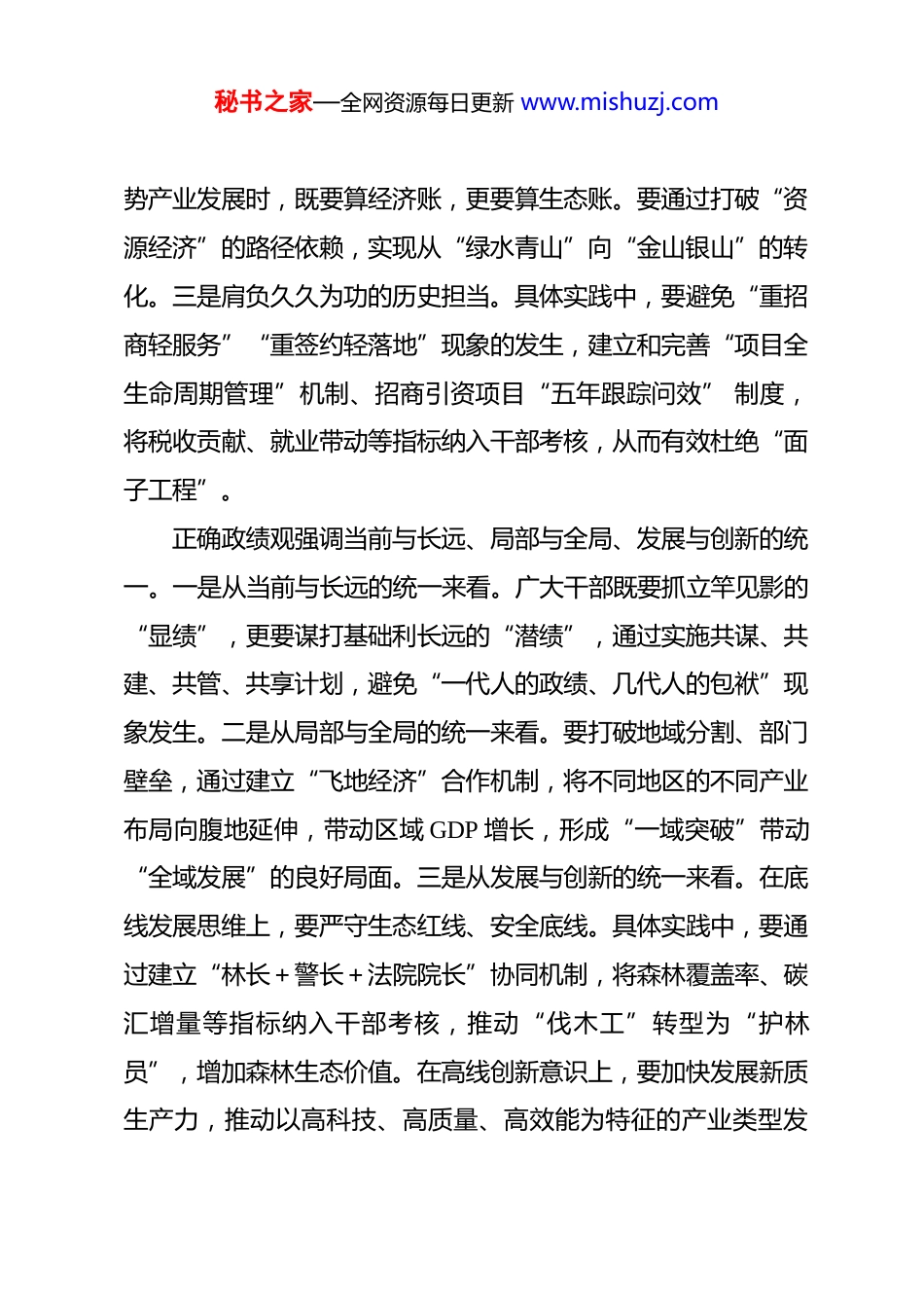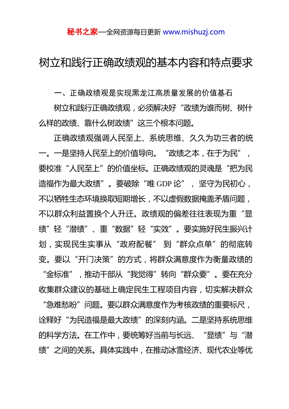 秘书之家—全网资源每日更新 www.mishuzj.com树立和践行正确政绩观的基本内容和特点要求一、正确政绩观是实现黑龙江高质量发展的价值基石树立和践行正确政绩观,必须解决好“政绩为谁而树、树什么样的政绩、靠什么树政绩”这三个根本问题。正确政绩观强调人民至上、系统思维、久久为功三者的统一。一是坚持人民至上的价值导向。“政绩之本,在于为民”,要校准“人民至上”的价值坐标。正确政绩观的灵魂是“把为民造福作为最大政绩”。要破除“唯 GDP 论”, 坚守为民初心,不以牺牲生态环境换取短期增长,不以虚假数据掩盖矛盾问题,不以群众利益置换个人升迁。政绩观的偏差往往表现为重“显绩”轻“潜绩”、重“数据”轻“实效”。要实施好民生振兴计划,实现民生实事从“政府配餐” 到“群众点单”的彻底转变。要以“开门决策”的方式,将群众满意度作为衡量政绩的“金标准”,推动干部从“我觉得”转向“群众要”。要在充分收集群众建议的基础上确定民生工程项目内容,切实解决群众“急难愁盼”问题。要以群众满意度作为考核政绩的重要标尺,诠释好“为民造福是最大政绩”的深刻内涵。二是坚持系统思维的科学方法。在工作中,要统筹好当前与长远、“显绩”与“潜绩”之间的关系。具体实践中,在推动冰雪经济、现代农业等优秘书之家—全网资源每日更新 www.mishuzj.com势产业发展时,既要算经济账,更要算生态账。要通过打破“资源经济”的路径依赖,实现从“绿水青山”向“金山银山”的转化。三是肩负久久为功的历史担当。具体实践中,要避免“重招商轻服务”“重签约轻落地”现象的发生,建立和完善“项目全生命周期管理”机制、招商引资项目“五年跟踪问效” 制度,将税收贡献、就业带动等指标纳入干部考核,从而有效杜绝“面子工程”。正确政绩观强调当前与长远、局部与全局、发展与创新的统一。一是从当前与长远的统一来看。广大干部既要抓立竿见影的“显绩”,更要谋打基础利长远的“潜绩”,通过实施共谋、共建、共管、共享计划,避免“一代人的政绩、几代人的包袱”现象发生。二是从局部与全局的统一来看。要打破地域分割、部门壁垒,通过建立“飞地经济”合作机制,将不同地区的不同产业布局向腹地延伸,带动区域 GDP 增长,形成“一域突破”带动“全域发展”的良好局面。三是从发展与创新的统一来看。在底线发展思维上,要严守生态红线、安全底线。具体实践中,要通过建立“林长+警长+法院院长”协同机制,将森林覆盖率、碳汇增量等指标纳入干部考核,推动“伐木工”转型为“护林员”,增加森林生态价值。在高线创新意识上,要加快发展新质生产力,推动以高科技、高质量、高效能为特征的产业类型发秘书之家—全网资源每日更新 www.mishuzj.com展。二、新时代新征程,共产党人应当树立和践行怎样的政绩观?当前,政绩观错位有哪些突出表现?朴强:新时代新征程,广大党员干部要深学细悟习近平新时代中国特色社会主义思想,牢固树立和践行正确政绩观,努力创造经得起实践、人民、历史检验的实绩。一是要回答好“政绩为谁而树”。习近平总书记强调,“中国共产党把为民办事、为民造福作为最重要的政绩,把为老百姓办了多少好事实事作为检验政绩的重要标准。”人民是我们党执政最深厚的基础和最大底气,打江山、守江山,守的是人民的心。党员干部要始终站稳人民立场,聚焦人民群众的急难愁盼,用心用情解决人民群众最关心、最直接、最现实的利益问题,采取更多惠民生、暖民心举措,努力把事关人民群众切身利益的大事小情都办在百姓心坎上,不断增强人民群众的获得感、幸福感、安全感。二是要明确“树什么样的政绩”。习近平总书记强调,“既要做让老百姓看得见、摸得着、得实惠的实事,也要做为后人作铺垫、打基础、利长远的好事,既要做显功,也要做潜功,不计较个人功名,追求人民群众的好口碑、历史沉淀之后真正的评价。”党员干部树立和践行正确政绩观,必须坚持实践观点、群秘书之家—全网资源每日更新 www.mishuzj.com众观点、历史观点,始终把人民放在心中最高位置。要立足当前,着眼长远,既解决好眼前的问题,又为未来的发展打下坚实基础;要坚持高...