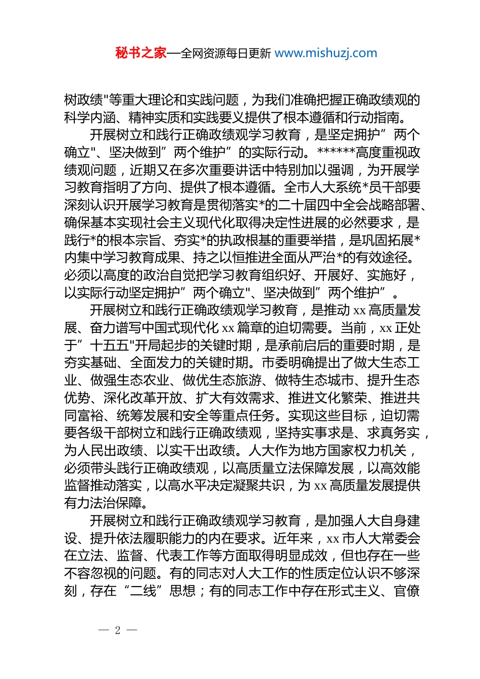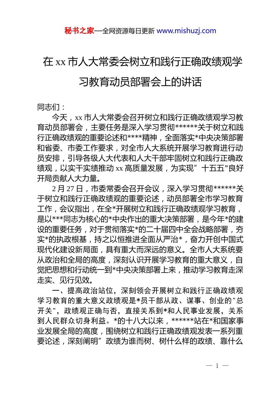 秘书之家—全网资源每日更新 www.mishuzj.com在 xx 市人大常委会树立和践行正确政绩观学习教育动员部署会上的讲话同志们:今天,xx 市人大常委会召开树立和践行正确政绩观学习教育动员部署会,主要任务是深入学习贯彻******关于树立和践行正确政绩观的重要论述和****精神,全面落实*中央决策部署和省委、市委工作要求,对全市人大系统开展学习教育进行动员安排,引导各级人大代表和人大干部牢固树立和践行正确政绩观,以实干实绩推动 xx 高质量发展,为实现”十五五"良好开局贡献人大力量。2 月 27 日,市委常委会召开会议,深入学习贯彻******关于树立和践行正确政绩观的重要论述,动员部署全市学习教育工作,会议指出,在全*开展树立和践行正确政绩观学习教育,是以***同志为核心的*中央作出的重大决策部署,是今年*的建设的重要任务,对于贯彻落实*的二十届四中全会战略部署,夯实*的执政根基,持之以恒推进全面从严治*,奋力开创中国式现代化建设新局面,具有重大而深远的意义。全市人大系统要从政治和全局的高度,深刻认识开展学习教育的重大意义,自觉把思想和行动统一到*中央决策部署上来,推动学习教育走深走实、见行见效。一、提高政治站位,深刻领会开展树立和践行正确政绩观学习教育的重大意义政绩观是*员干部从政、谋事、创业的"总开关",政绩观正确与否,直接关系到*和人民事业发展,关系到人民群众切身利益。*的十八大以来,******站在*和国家事业发展全局的高度,围绕树立和践行正确政绩观发表一系列重要论述,深刻阐明”政绩为谁而树、树什么样的政绩、靠什么— 1 —秘书之家—全网资源每日更新 www.mishuzj.com树政绩"等重大理论和实践问题,为我们准确把握正确政绩观的科学内涵、精神实质和实践要义提供了根本遵循和行动指南。开展树立和践行正确政绩观学习教育,是坚定拥护”两个确立"、坚决做到”两个维护”的实际行动。******高度重视政绩观问题,近期又在多次重要讲话中特别加以强调,为开展学习教育指明了方向、提供了根本遵循。全市人大系统*员干部要深刻认识开展学习教育是贯彻落实*的二十届四中全会战略部署、确保基本实现社会主义现代化取得决定性进展的必然要求,是践行*的根本宗旨、夯实*的执政根基的重要举措,是巩固拓展*内集中学习教育成果、持之以恒推进全面从严治*的有效途径。必须以高度的政治自觉把学习教育组织好、开展好、实施好,以实际行动坚定拥护”两个确立"、坚决做到”两个维护”。开展树立和践行正确政绩观学习教育,是推动 xx 高质量发展、奋力谱写中国式现代化 xx 篇章的迫切需要。当前,xx 正处于”十五五"开局起步的关键时期,是承前启后的重要时期,是夯实基础、全面发力的关键时期。市委明确提出了做大生态工业、做强生态农业、做优生态旅游、做特生态城市、提升生态优势、深化改革开放、扩大有效需求、推进文化繁荣、推进共同富裕、统筹发展和安全等重点任务。实现这些目标,迫切需要各级干部树立和践行正确政绩观,坚持实事求是、求真务实,为人民出政绩、以实干出政绩。人大作为地方国家权力机关,必须带头践行正确政绩观,以高质量立法保障发展,以高效能监督推动落实,以高水平决定凝聚共识,为 xx 高质量发展提供有力法治保障。开展树立和践行正确政绩观学习教育,是加强人大自身建设、提升依法履职能力的内在要求。近年来,xx 市人大常委会在立法、监督、代表工作等方面取得明显成效,但也存在一些不容忽视的问题。有的同志对人大工作的性质定位认识不够深刻,存在“二线”思想;有的同志工作中存在形式主义、官僚— 2 —秘书之家—全网资源每日更新 www.mishuzj.com主义,调研不深入、监督不较真;有的同志宗旨意识树得不牢,对群众反映强烈的问题关注不够、回应不力。这些问题从根本上说,都是政绩观存在偏差的表现。必须通过学习教育,引导全市人大系统*员干部自觉增强*性修养、提高思想觉悟、树牢宗旨意识,创造经得起实践、人民、历史检验的实绩。二、把握目标要求,高质量推进树立和践行正确政绩观学习教育根据*中央部署和省委、市委要求,这次学习教育从春节假期后启动,7 月底基本结束...