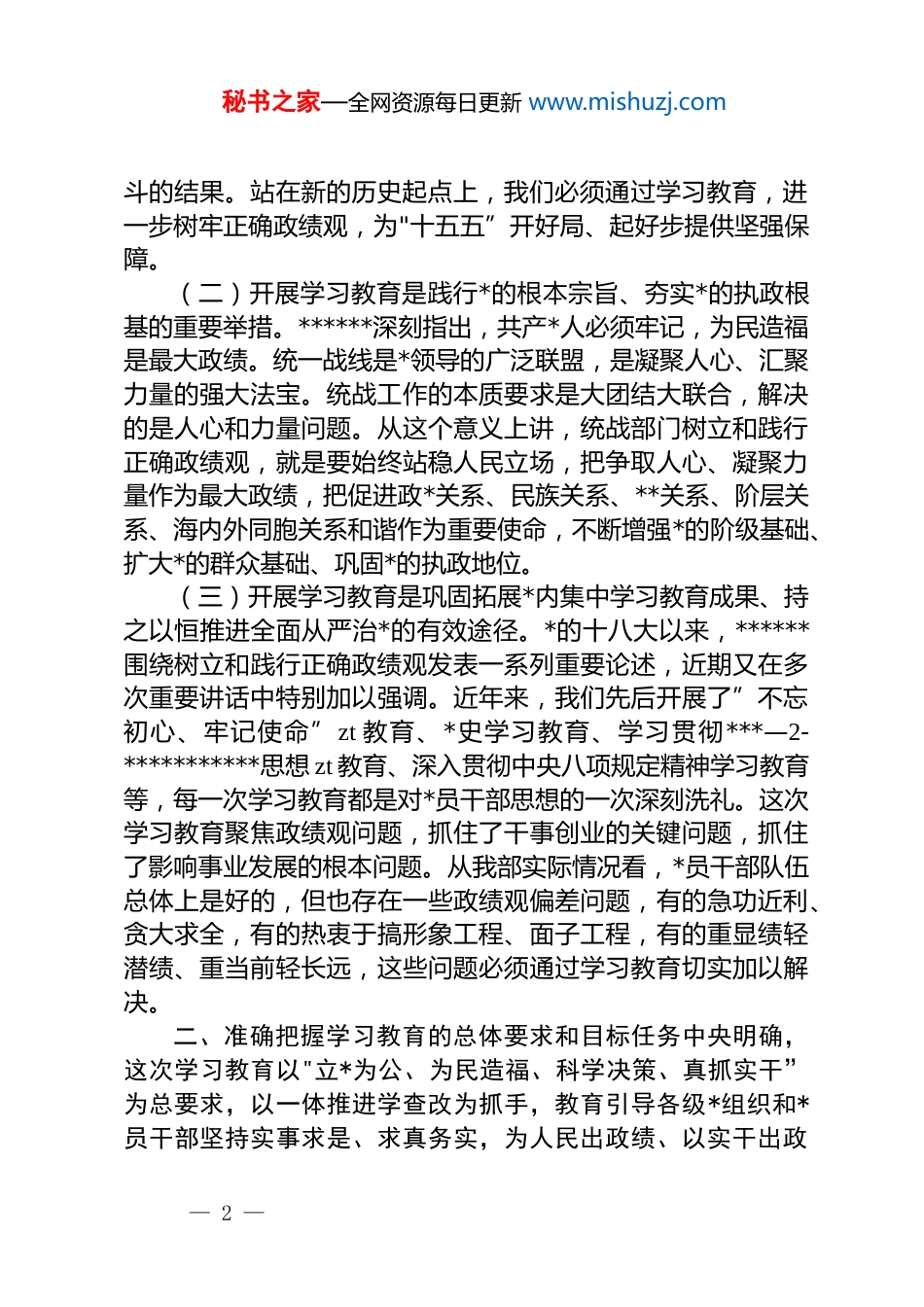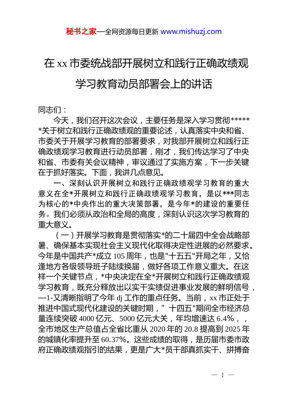 秘书之家—全网资源每日更新 www.mishuzj.com在 xx 市委统战部开展树立和践行正确政绩观学习教育动员部署会上的讲话同志们:今天,我们召开这次会议,主要任务是深入学习贯彻******关于树立和践行正确政绩观的重要论述,认真落实中央和省、市委关于开展学习教育的部署要求,对我部开展树立和践行正确政绩观学习教育进行动员部署,刚才,我们传达学习了中央和省、市委有关会议精神,审议通过了实施方案,下一步关键在于抓好落实。下面,我讲几点意见。一、深刻认识开展树立和践行正确政绩观学习教育的重大意义在全*开展树立和践行正确政绩观学习教育,是以***同志为核心的*中央作出的重大决策部署,是今年*的建设的重要任务。我们必须从政治和全局的高度,深刻认识这次学习教育的重大意义。(一)开展学习教育是贯彻落实*的二十届四中全会战略部暑、确保基本实现社会主义现代化取得决定性进展的必然要求。今年是中国共产*成立 105 周年,也是"十五五"开局之年,又恰逢地方各级领导班子陆续换届,做好各项工作意义重大。在这样一个关键节点,*中央决定在全*开展树立和践行正确政绩观学习教育,既充分释放出以实干实绩促进事业发展的鲜明信号,—1-又清晰指明了今年 dj 工作的重点任务。当前,xx 市正处于推进中国式现代化建设的关键时期,”十四五"期间全市经济总量连续突破 4000 亿元、5000 亿元大关,年均增速达 6.4%,,全市地区生产总值占全省比重从 2020 年的 20.8 提高到 2025 年的城镇化率提升至 60.37%。这些成绩的取得,是历届市委市政府正确政绩观指引的结果,更是广大*员干部真抓实干、拼搏奋— 1 —秘书之家—全网资源每日更新 www.mishuzj.com斗的结果。站在新的历史起点上,我们必须通过学习教育,进一步树牢正确政绩观,为"十五五”开好局、起好步提供坚强保障。(二)开展学习教育是践行*的根本宗旨、夯实*的执政根基的重要举措。******深刻指出,共产*人必须牢记,为民造福是最大政绩。统一战线是*领导的广泛联盟,是凝聚人心、汇聚力量的强大法宝。统战工作的本质要求是大团结大联合,解决的是人心和力量问题。从这个意义上讲,统战部门树立和践行正确政绩观,就是要始终站稳人民立场,把争取人心、凝聚力量作为最大政绩,把促进政*关系、民族关系、**关系、阶层关系、海内外同胞关系和谐作为重要使命,不断增强*的阶级基础、扩大*的群众基础、巩固*的执政地位。(三)开展学习教育是巩固拓展*内集中学习教育成果、持之以恒推进全面从严治*的有效途径。*的十八大以来,******围绕树立和践行正确政绩观发表一系列重要论述,近期又在多次重要讲话中特别加以强调。近年来,我们先后开展了”不忘初心、牢记使命”zt 教育、*史学习教育、学习贯彻***—2-***********思想 zt 教育、深入贯彻中央八项规定精神学习教育等,每一次学习教育都是对*员干部思想的一次深刻洗礼。这次学习教育聚焦政绩观问题,抓住了干事创业的关键问题,抓住了影响事业发展的根本问题。从我部实际情况看,*员干部队伍总体上是好的,但也存在一些政绩观偏差问题,有的急功近利、贪大求全,有的热衷于搞形象工程、面子工程,有的重显绩轻潜绩、重当前轻长远,这些问题必须通过学习教育切实加以解决。二、准确把握学习教育的总体要求和目标任务中央明确,这次学习教育以"立*为公、为民造福、科学决策、真抓实干”为总要求,以一体推进学查改为抓手,教育引导各级*组织和*员干部坚持实事求是、求真务实,为人民出政绩、以实干出政— 2 —秘书之家—全网资源每日更新 www.mishuzj.com绩。我们要深刻理解、准确把握、全面落实这一总要求。一要在"深学"上下功夫。学习是前提,是基础。要深入学习******关于树立和践行正确政绩观的重要论述,深入学习《中共中央关于制定国民经济和社会发展第十五个五年规划的建议》,深入学习******关于本地区本部门本领域的重要讲话和****精神。要把个人自学与集中学习紧密结合起来,原原本本学、深入思考学、联系实际学,切实增强树立和践行正确政绩观的思想根基。要深化循迹溯源,用好正反面典型案例,发挥先进典型的示范引领作用和反面...