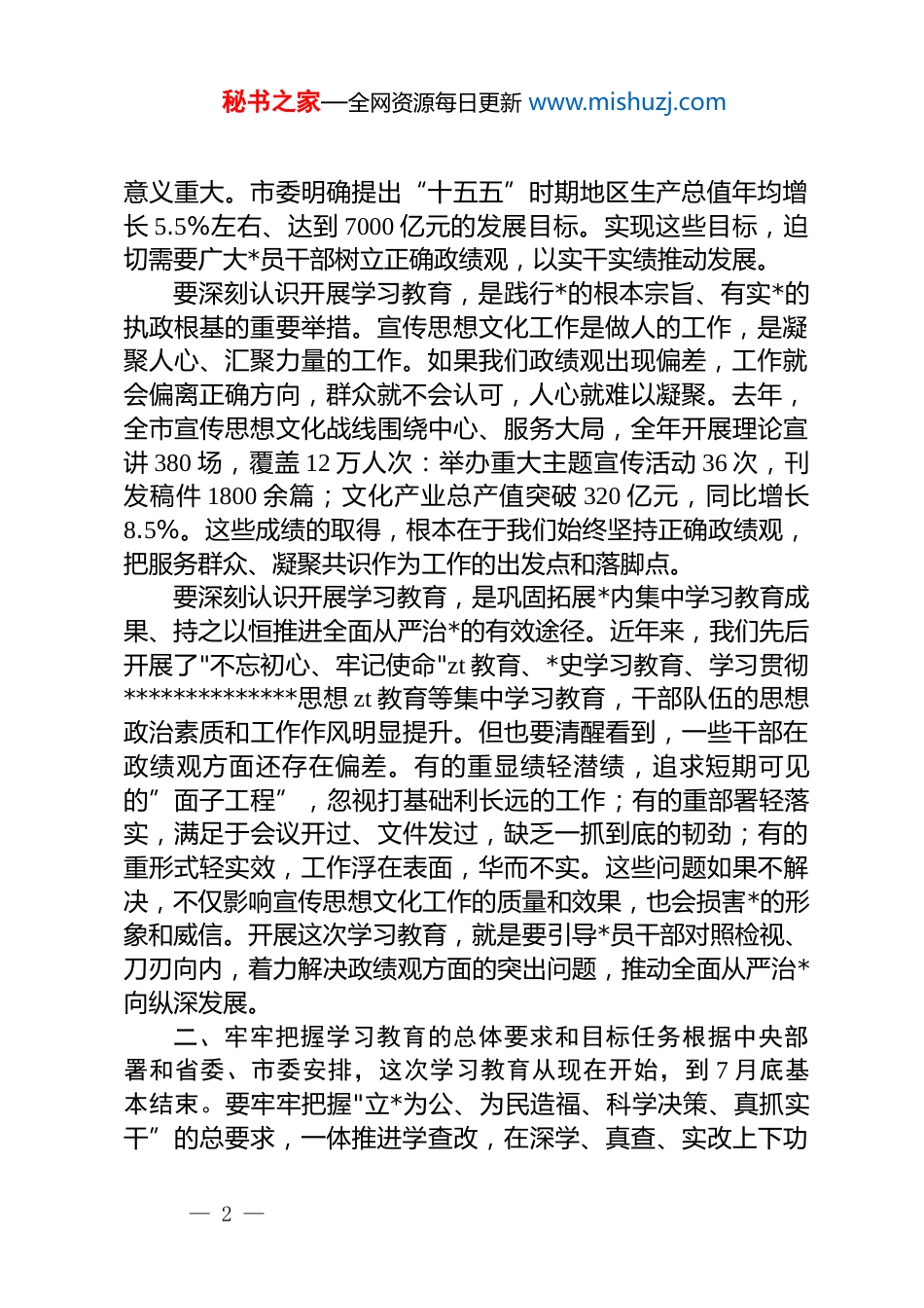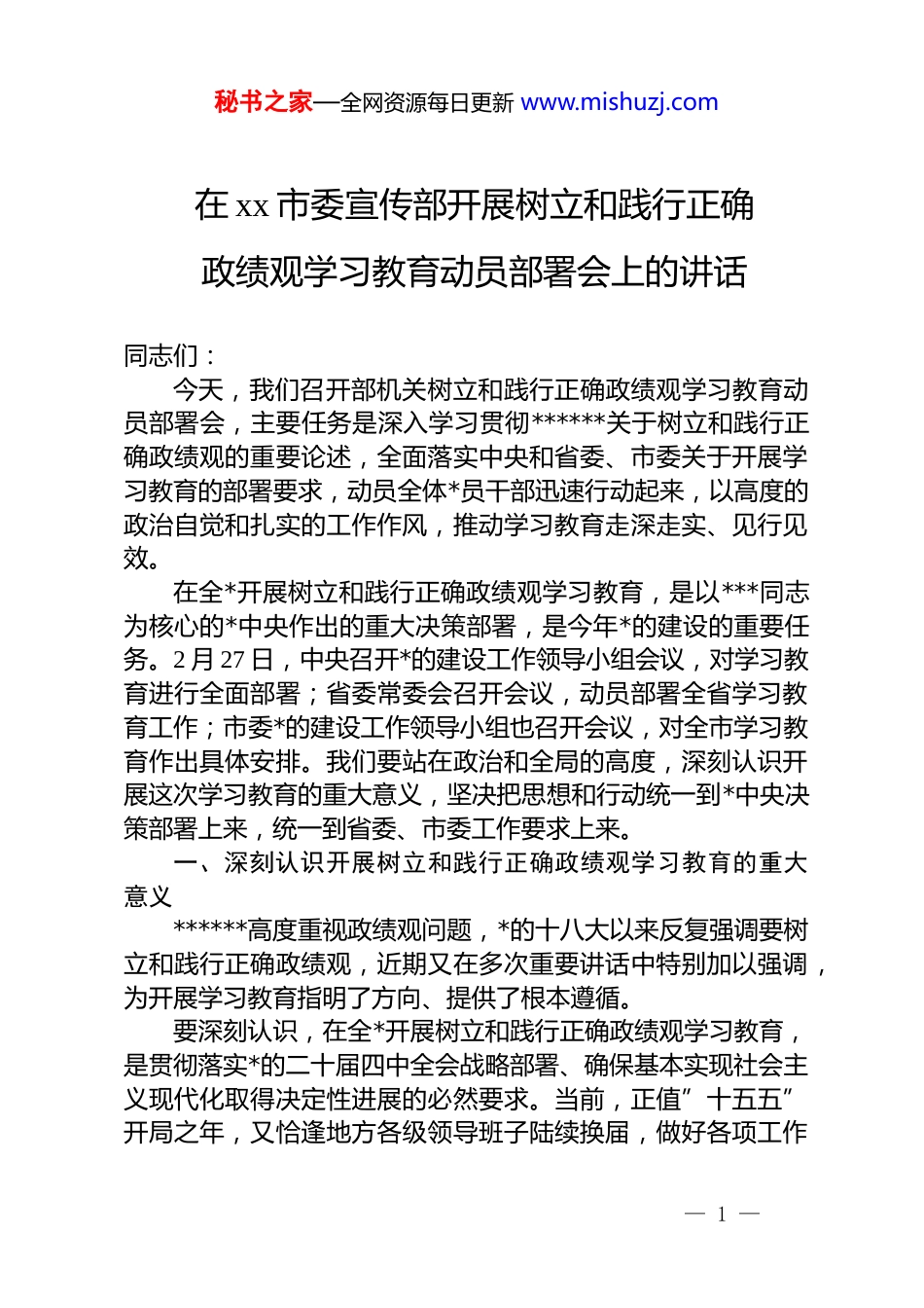 秘书之家—全网资源每日更新 www.mishuzj.com在 xx 市委宣传部开展树立和践行正确政绩观学习教育动员部署会上的讲话同志们:今天,我们召开部机关树立和践行正确政绩观学习教育动员部署会,主要任务是深入学习贯彻******关于树立和践行正确政绩观的重要论述,全面落实中央和省委、市委关于开展学习教育的部署要求,动员全体*员干部迅速行动起来,以高度的政治自觉和扎实的工作作风,推动学习教育走深走实、见行见效。在全*开展树立和践行正确政绩观学习教育,是以***同志为核心的*中央作出的重大决策部署,是今年*的建设的重要任务。2 月 27 日,中央召开*的建设工作领导小组会议,对学习教育进行全面部署;省委常委会召开会议,动员部署全省学习教育工作;市委*的建设工作领导小组也召开会议,对全市学习教育作出具体安排。我们要站在政治和全局的高度,深刻认识开展这次学习教育的重大意义,坚决把思想和行动统一到*中央决策部署上来,统一到省委、市委工作要求上来。一、深刻认识开展树立和践行正确政绩观学习教育的重大意义******高度重视政绩观问题,*的十八大以来反复强调要树立和践行正确政绩观,近期又在多次重要讲话中特别加以强调,为开展学习教育指明了方向、提供了根本遵循。要深刻认识,在全*开展树立和践行正确政绩观学习教育,是贯彻落实*的二十届四中全会战略部署、确保基本实现社会主义现代化取得决定性进展的必然要求。当前,正值”十五五”开局之年,又恰逢地方各级领导班子陆续换届,做好各项工作— 1 —秘书之家—全网资源每日更新 www.mishuzj.com意义重大。市委明确提出“十五五”时期地区生产总值年均增长 5.5%左右、达到 7000 亿元的发展目标。实现这些目标,迫切需要广大*员干部树立正确政绩观,以实干实绩推动发展。要深刻认识开展学习教育,是践行*的根本宗旨、有实*的执政根基的重要举措。宣传思想文化工作是做人的工作,是凝聚人心、汇聚力量的工作。如果我们政绩观出现偏差,工作就会偏离正确方向,群众就不会认可,人心就难以凝聚。去年,全市宣传思想文化战线围绕中心、服务大局,全年开展理论宣讲 380 场,覆盖 12 万人次:举办重大主题宣传活动 36 次,刊发稿件 1800 余篇;文化产业总产值突破 320 亿元,同比增长8.5%。这些成绩的取得,根本在于我们始终坚持正确政绩观,把服务群众、凝聚共识作为工作的出发点和落脚点。要深刻认识开展学习教育,是巩固拓展*内集中学习教育成果、持之以恒推进全面从严治*的有效途径。近年来,我们先后开展了"不忘初心、牢记使命"zt 教育、*史学习教育、学习贯彻**************思想 zt 教育等集中学习教育,干部队伍的思想政治素质和工作作风明显提升。但也要清醒看到,一些干部在政绩观方面还存在偏差。有的重显绩轻潜绩,追求短期可见的”面子工程”,忽视打基础利长远的工作;有的重部署轻落实,满足于会议开过、文件发过,缺乏一抓到底的韧劲;有的重形式轻实效,工作浮在表面,华而不实。这些问题如果不解决,不仅影响宣传思想文化工作的质量和效果,也会损害*的形象和威信。开展这次学习教育,就是要引导*员干部对照检视、刀刃向内,着力解决政绩观方面的突出问题,推动全面从严治*向纵深发展。二、牢牢把握学习教育的总体要求和目标任务根据中央部署和省委、市委安排,这次学习教育从现在开始,到 7 月底基本结束。要牢牢把握"立*为公、为民造福、科学决策、真抓实干”的总要求,一体推进学查改,在深学、真查、实改上下功— 2 —秘书之家—全网资源每日更新 www.mishuzj.com夫见成效。第一,在深学上下功夫,筑牢思想根基。学习是开展好学习教育的前提和基础。要深入学习******关于树立和践行正确政绩观的重要论述,深入学习《中共中央关于制定国民经济和社会发展第十五个五年规划的建议》,深入学习******关于宣传思想文化工作的重要讲话和****精神,把个人自学与集中学习紧密结合起来,引导*员干部深入领会什么是正确政绩观、怎样树立和践行正确政绩观,进一步强化立*为公、为民造福理念。要弘扬理论联系实际的学风,把学习与做好本职工作结合起来,与解决实际问题结...
