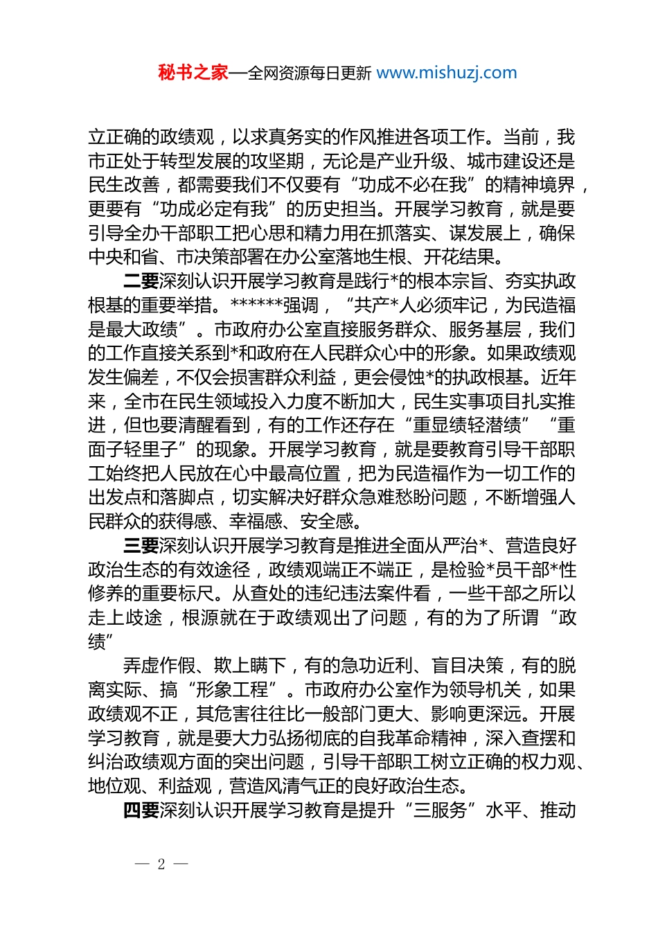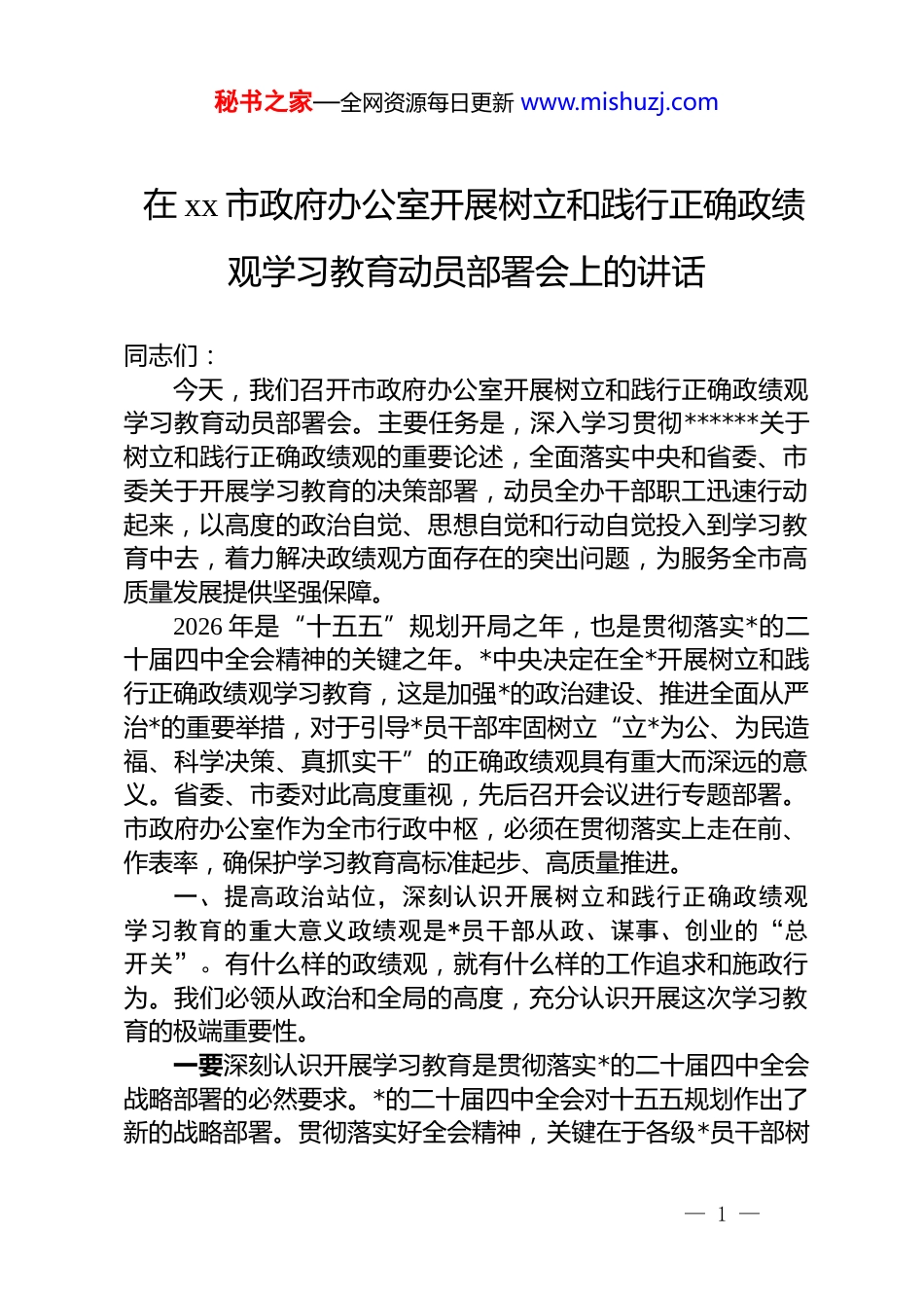 秘书之家—全网资源每日更新 www.mishuzj.com在 xx 市政府办公室开展树立和践行正确政绩观学习教育动员部署会上的讲话同志们:今天,我们召开市政府办公室开展树立和践行正确政绩观学习教育动员部署会。主要任务是,深入学习贯彻******关于树立和践行正确政绩观的重要论述,全面落实中央和省委、市委关于开展学习教育的决策部署,动员全办干部职工迅速行动起来,以高度的政治自觉、思想自觉和行动自觉投入到学习教育中去,着力解决政绩观方面存在的突出问题,为服务全市高质量发展提供坚强保障。2026 年是“十五五”规划开局之年,也是贯彻落实*的二十届四中全会精神的关键之年。*中央决定在全*开展树立和践行正确政绩观学习教育,这是加强*的政治建设、推进全面从严治*的重要举措,对于引导*员干部牢固树立“立*为公、为民造福、科学决策、真抓实干”的正确政绩观具有重大而深远的意义。省委、市委对此高度重视,先后召开会议进行专题部署。市政府办公室作为全市行政中枢,必须在贯彻落实上走在前、作表率,确保护学习教育高标准起步、高质量推进。一、提高政治站位,深刻认识开展树立和践行正确政绩观学习教育的重大意义政绩观是*员干部从政、谋事、创业的“总开关”。有什么样的政绩观,就有什么样的工作追求和施政行为。我们必领从政治和全局的高度,充分认识开展这次学习教育的极端重要性。一要深刻认识开展学习教育是贯彻落实*的二十届四中全会战略部署的必然要求。*的二十届四中全会对十五五规划作出了新的战略部署。贯彻落实好全会精神,关键在于各级*员干部树— 1 —秘书之家—全网资源每日更新 www.mishuzj.com立正确的政绩观,以求真务实的作风推进各项工作。当前,我市正处于转型发展的攻坚期,无论是产业升级、城市建设还是民生改善,都需要我们不仅要有“功成不必在我”的精神境界,更要有“功成必定有我”的历史担当。开展学习教育,就是要引导全办干部职工把心思和精力用在抓落实、谋发展上,确保中央和省、市决策部署在办公室落地生根、开花结果。二要深刻认识开展学习教育是践行*的根本宗旨、夯实执政根基的重要举措。******强调,“共产*人必须牢记,为民造福是最大政绩”。市政府办公室直接服务群众、服务基层,我们的工作直接关系到*和政府在人民群众心中的形象。如果政绩观发生偏差,不仅会损害群众利益,更会侵蚀*的执政根基。近年来,全市在民生领域投入力度不断加大,民生实事项目扎实推进,但也要清醒看到,有的工作还存在“重显绩轻潜绩”“重面子轻里子”的现象。开展学习教育,就是要教育引导干部职工始终把人民放在心中最高位置,把为民造福作为一切工作的出发点和落脚点,切实解决好群众急难愁盼问题,不断增强人民群众的获得感、幸福感、安全感。三要深刻认识开展学习教育是推进全面从严治*、营造良好政治生态的有效途径,政绩观端正不端正,是检验*员干部*性修养的重要标尺。从查处的违纪违法案件看,一些干部之所以走上歧途,根源就在于政绩观出了问题,有的为了所谓“政绩”弄虚作假、欺上瞒下,有的急功近利、盲目决策,有的脱离实际、搞“形象工程”。市政府办公室作为领导机关,如果政绩观不正,其危害往往比一般部门更大、影响更深远。开展学习教育,就是要大力弘扬彻底的自我革命精神,深入查摆和纠治政绩观方面的突出问题,引导干部职工树立正确的权力观、地位观、利益观,营造风清气正的良好政治生态。四要深刻认识开展学习教育是提升“三服务”水平、推动— 2 —秘书之家—全网资源每日更新 www.mishuzj.com高质量发展的坚强保障。办公室的工作千头万绪,核心是服务领导、服务基层、服务群众。在新的形势任务面前,我们的工作标准、能力素质与高质量发展的要求相比,还存在一定差距。有的同志在工作中存在“过得去”思想,标准不高、要求不严;有的习惯于按部就班、循规蹈矩,缺乏创新意识和担当精神。这些问题,从根本上说都是政绩观不正确的外在表现,开展学习教育,就是要引导干部职工把工作标准调到最高、把精神状态调到最佳,以实实在在的工作业绩检验学习教育成效,推动办公室各项工作再上新合阶。二、聚焦主题主线,...
