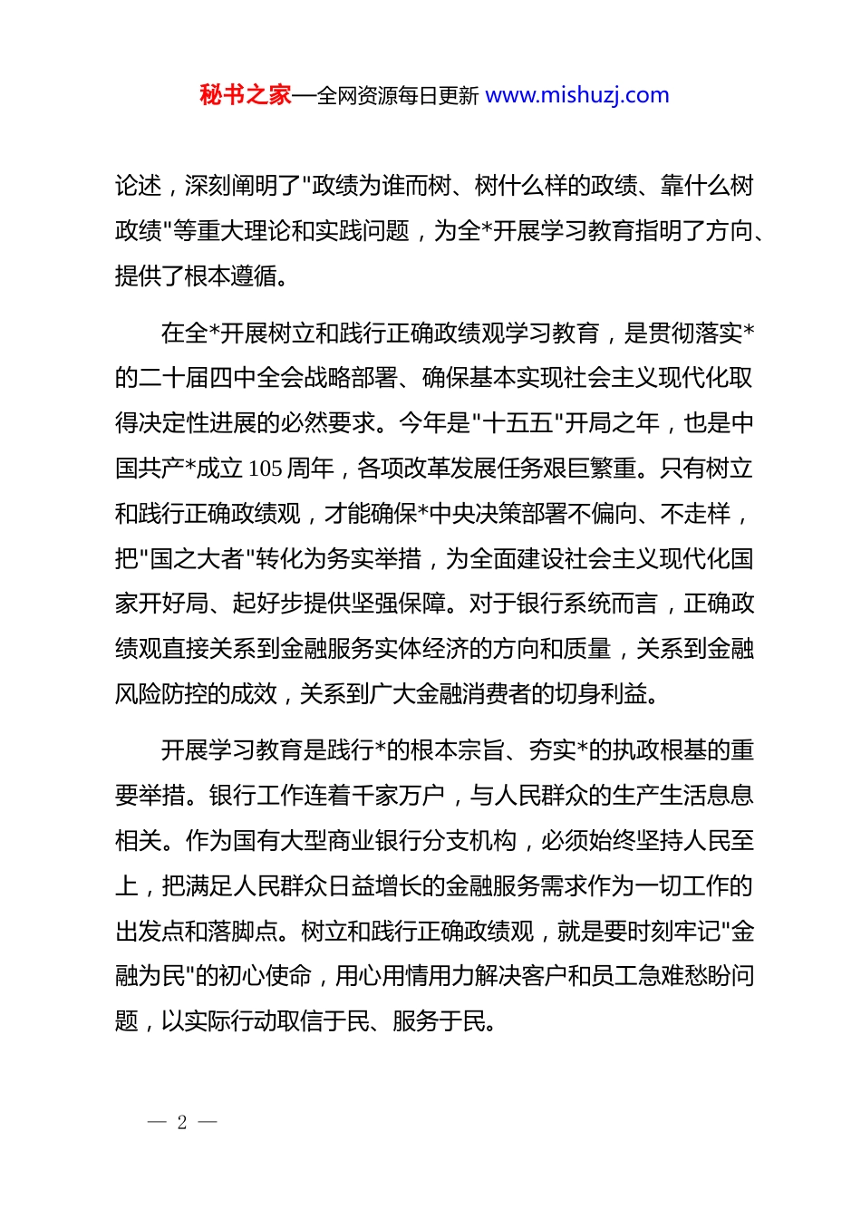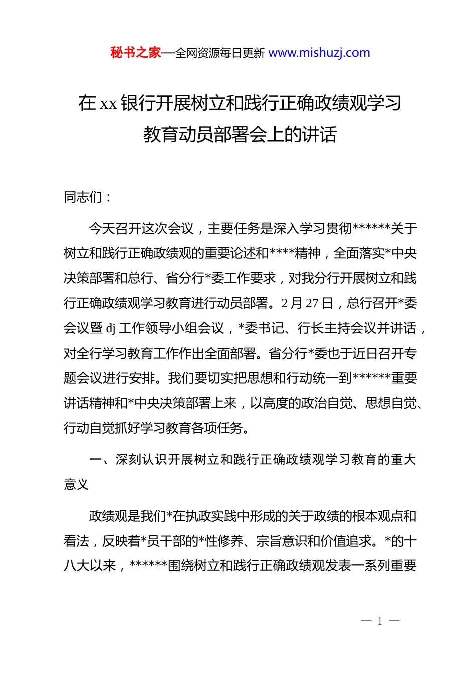 秘书之家—全网资源每日更新 www.mishuzj.com在 xx 银行开展树立和践行正确政绩观学习教育动员部署会上的讲话同志们:今天召开这次会议,主要任务是深入学习贯彻******关于树立和践行正确政绩观的重要论述和****精神,全面落实*中央决策部署和总行、省分行*委工作要求,对我分行开展树立和践行正确政绩观学习教育进行动员部署。2 月 27 日,总行召开*委会议暨 dj 工作领导小组会议,*委书记、行长主持会议并讲话,对全行学习教育工作作出全面部署。省分行*委也于近日召开专题会议进行安排。我们要切实把思想和行动统一到******重要讲话精神和*中央决策部署上来,以高度的政治自觉、思想自觉、行动自觉抓好学习教育各项任务。一、深刻认识开展树立和践行正确政绩观学习教育的重大意义政绩观是我们*在执政实践中形成的关于政绩的根本观点和看法,反映着*员干部的*性修养、宗旨意识和价值追求。*的十八大以来,******围绕树立和践行正确政绩观发表一系列重要— 1 —秘书之家—全网资源每日更新 www.mishuzj.com论述,深刻阐明了"政绩为谁而树、树什么样的政绩、靠什么树政绩"等重大理论和实践问题,为全*开展学习教育指明了方向、提供了根本遵循。在全*开展树立和践行正确政绩观学习教育,是贯彻落实*的二十届四中全会战略部署、确保基本实现社会主义现代化取得决定性进展的必然要求。今年是"十五五"开局之年,也是中国共产*成立 105 周年,各项改革发展任务艰巨繁重。只有树立和践行正确政绩观,才能确保*中央决策部署不偏向、不走样,把"国之大者"转化为务实举措,为全面建设社会主义现代化国家开好局、起好步提供坚强保障。对于银行系统而言,正确政绩观直接关系到金融服务实体经济的方向和质量,关系到金融风险防控的成效,关系到广大金融消费者的切身利益。开展学习教育是践行*的根本宗旨、夯实*的执政根基的重要举措。银行工作连着千家万户,与人民群众的生产生活息息相关。作为国有大型商业银行分支机构,必须始终坚持人民至上,把满足人民群众日益增长的金融服务需求作为一切工作的出发点和落脚点。树立和践行正确政绩观,就是要时刻牢记"金融为民"的初心使命,用心用情用力解决客户和员工急难愁盼问题,以实际行动取信于民、服务于民。— 2 —秘书之家—全网资源每日更新 www.mishuzj.com开展学习教育是巩固拓展*内集中学习教育成果、持之以恒推进全面从严治*的有效途径。近年来,全*先后开展了*的群众路线教育实践活动、"三严三实"专题教育、"两学一做"学习教育、"不忘初心、牢记使命"zt 教育、*史学习教育、学习贯彻**************思想 zt 教育等一系列集中教育,取得了显著成效。这次学习教育是对*内集中学习教育成果的巩固深化,是推动全面从严治*向纵深发展的重要抓手。通过学习教育,引导广大*员干部进一步增强*性修养、提高思想觉悟、树牢宗旨意识,营造风清气正的良好政治生态。开展学习教育是推动高质量发展、提升金融服务能力的内在要求。当前,银行业面临经济增速放缓、净息差持续收窄、资产质量承压等挑战,更需要以正确政绩观引领高质量发展。近年来,我分行认真贯彻总行、省分行*委决策部署,各项业务取得长足进步,但同时也要清醒看到,在经营发展过程中还存在一些与正确政绩观要求不相符合的问题和现象。有的片面追求规模扩张,忽视发展质量和效益;有的急功近利,重显绩轻潜绩;有的作风漂浮,形式主义、官僚主义问题依然存在。这些问题说到底是政绩观出现了偏差。必须通过学习教育,引导广大干部员工树牢正确政绩观,完整准确全面贯彻新发展理念,— 3 —秘书之家—全网资源每日更新 www.mishuzj.com以实干实绩推动高质量发展。二、准确把握树立和践行正确政绩观学习教育的目标要求这次学习教育总要求是"立*为公、为民造福、科学决策、真抓实干",要将其贯穿学习教育全过程各方面,深刻理解、准确把握、全面落实。立*为公,就是要坚守共产*人的政治本色,始终把*的事业放在首位。对于国有银行而言,就是要坚持*的领导不动摇,把*的领导贯穿于经营管理的全过程各方面。要自觉在思想上政治上行动上同以***同志为核心的*中央保持高度一...