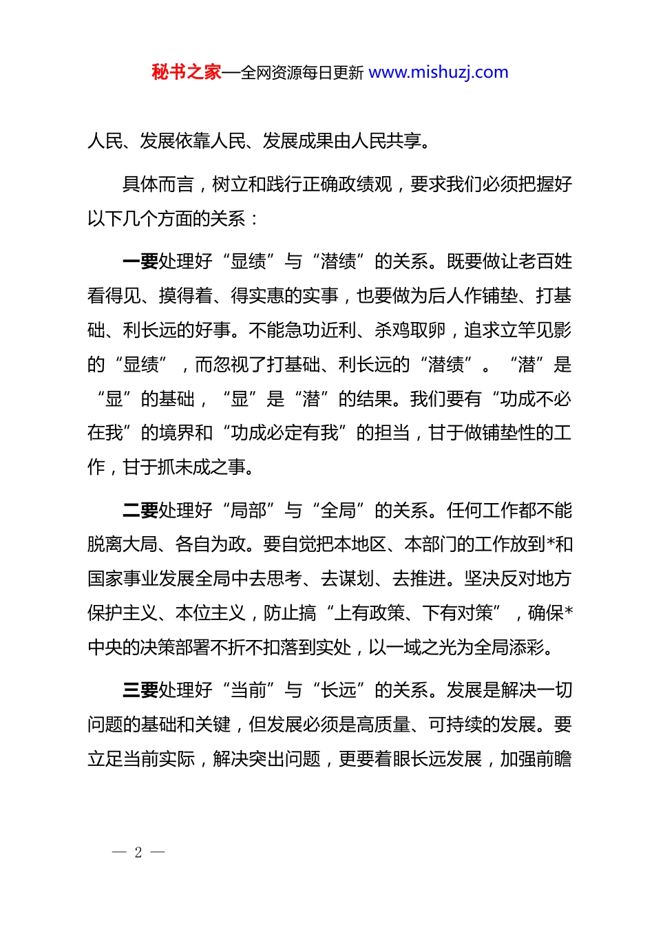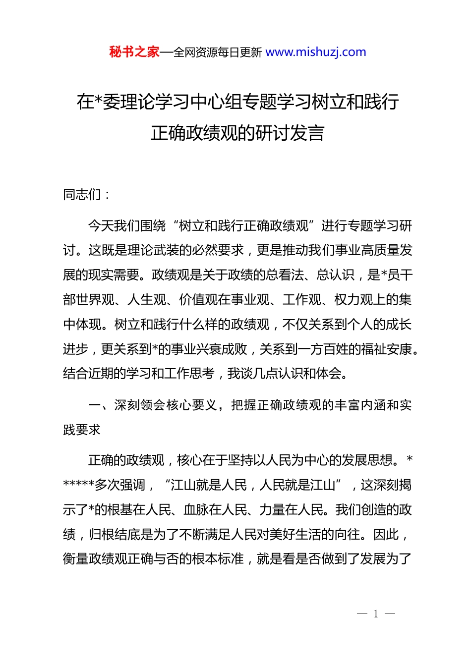秘书之家—全网资源每日更新 www.mishuzj.com在*委理论学习中心组专题学习树立和践行正确政绩观的研讨发言同志们:今天我们围绕“树立和践行正确政绩观”进行专题学习研讨。这既是理论武装的必然要求,更是推动我们事业高质量发展的现实需要。政绩观是关于政绩的总看法、总认识,是*员干部世界观、人生观、价值观在事业观、工作观、权力观上的集中体现。树立和践行什么样的政绩观,不仅关系到个人的成长进步,更关系到*的事业兴衰成败,关系到一方百姓的福祉安康。结合近期的学习和工作思考,我谈几点认识和体会。一、深刻领会核心要义,把握正确政绩观的丰富内涵和实践要求正确的政绩观,核心在于坚持以人民为中心的发展思想。******多次强调,“江山就是人民,人民就是江山”,这深刻揭示了*的根基在人民、血脉在人民、力量在人民。我们创造的政绩,归根结底是为了不断满足人民对美好生活的向往。因此,衡量政绩观正确与否的根本标准,就是看是否做到了发展为了— 1 —秘书之家—全网资源每日更新 www.mishuzj.com人民、发展依靠人民、发展成果由人民共享。具体而言,树立和践行正确政绩观,要求我们必须把握好以下几个方面的关系:一要处理好“显绩”与“潜绩”的关系。既要做让老百姓看得见、摸得着、得实惠的实事,也要做为后人作铺垫、打基础、利长远的好事。不能急功近利、杀鸡取卵,追求立竿见影的“显绩”,而忽视了打基础、利长远的“潜绩”。“潜”是“显”的基础,“显”是“潜”的结果。我们要有“功成不必在我”的境界和“功成必定有我”的担当,甘于做铺垫性的工作,甘于抓未成之事。二要处理好“局部”与“全局”的关系。任何工作都不能脱离大局、各自为政。要自觉把本地区、本部门的工作放到*和国家事业发展全局中去思考、去谋划、去推进。坚决反对地方保护主义、本位主义,防止搞“上有政策、下有对策”,确保*中央的决策部署不折不扣落到实处,以一域之光为全局添彩。三要处理好“当前”与“长远”的关系。发展是解决一切问题的基础和关键,但发展必须是高质量、可持续的发展。要立足当前实际,解决突出问题,更要着眼长远发展,加强前瞻— 2 —秘书之家—全网资源每日更新 www.mishuzj.com性思考、全局性谋划、战略性布局。不能竭泽而渔、寅吃卯粮,不能以牺牲环境、透支未来为代价换取一时的经济增长。四要处理好“速度”与“质量”的关系。在推动发展中,要保持一定的增长速度,但绝不能唯 gdp 论英雄。要完整、准确、全面贯彻新发展理念,把发展质量问题摆在更为突出的位置,着力推动创新发展、协调发展、绿色发展、开放发展、共享发展,努力实现更高质量、更有效率、更加公平、更可持续、更为安全的发展。二、坚持问题导向,深刻检视政绩观方面存在的偏差和不足对照正确政绩观的要求,我们必须清醒地认识到,在实际工作中,一些*员干部在政绩观上还存在这样那样的问题,需要我们高度重视、深刻反思、切实加以纠正。一要检视否存在“急功近利”的倾向。有的干部热衷于搞“短平快”项目,喜欢做“显山露水”的事,对周期长、见效慢的基础性工作缺乏耐心和恒心,甚至搞“形象工程”、“政绩工程”,追求表面的轰轰烈烈,不顾实际效果和群众感受。二要检视是否存在“重硬轻软”的倾向。有的干部把主要— 3 —秘书之家—全网资源每日更新 www.mishuzj.com精力放在看得见、摸得着的硬件建设上,对优化营商环境、提升治理效能、涵养文明风尚等“软实力”建设重视不够、投入不足,导致发展不平衡、不协调。三要检视是否存在“重上轻下”的倾向。有的干部只注重对上负责,看上级眼色行事,热衷于搞“亮点”、出“经验”,希望得到上级的肯定和表扬,而对群众的急难愁盼问题关心不够、解决不力,甚至脱离实际、脱离群众。四要检视是否存在“因循守旧”的倾向。有的干部思想不够解放,习惯于按部就班、墨守成规,缺乏改革创新、攻坚克难的锐气和担当,面对新形势新任务新要求,办法不多、措施不实,工作打不开局面。五要检视是否存在“统计造假”的倾向。有的干部为了追求所谓的“政绩”,在数据上动脑筋、做文章,虚报浮夸、弄虚作假,不仅误导决策,更...