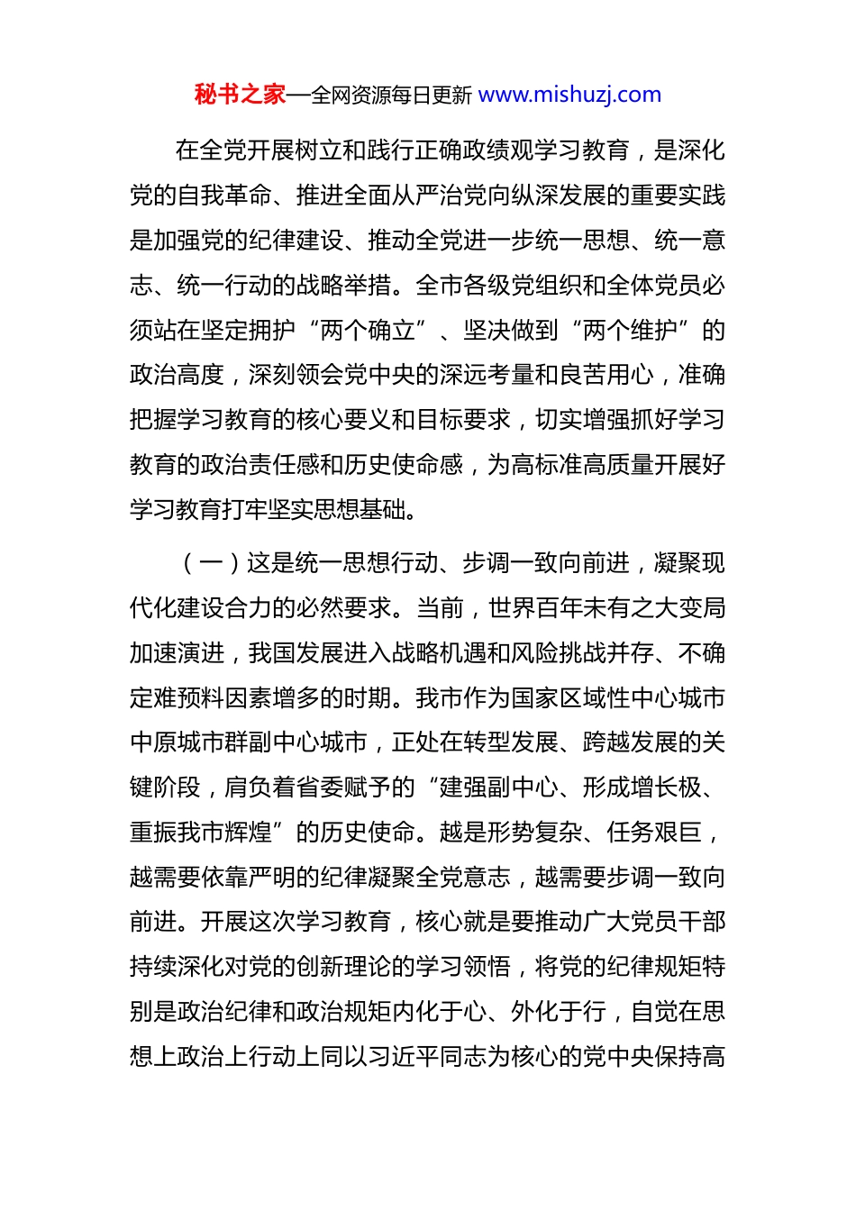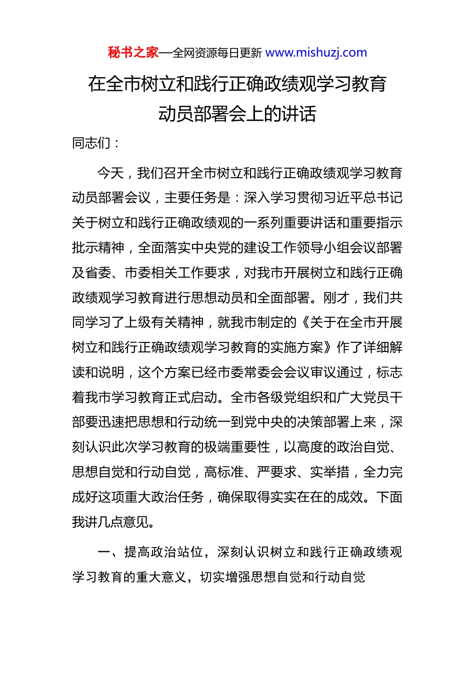 秘书之家—全网资源每日更新 www.mishuzj.com在全市树立和践行正确政绩观学习教育动员部署会上的讲话同志们:今天,我们召开全市树立和践行正确政绩观学习教育动员部署会议,主要任务是:深入学习贯彻习近平总书记关于树立和践行正确政绩观的一系列重要讲话和重要指示批示精神,全面落实中央党的建设工作领导小组会议部署及省委、市委相关工作要求,对我市开展树立和践行正确政绩观学习教育进行思想动员和全面部署。刚才,我们共同学习了上级有关精神,就我市制定的《关于在全市开展树立和践行正确政绩观学习教育的实施方案》作了详细解读和说明,这个方案已经市委常委会会议审议通过,标志着我市学习教育正式启动。全市各级党组织和广大党员干部要迅速把思想和行动统一到党中央的决策部署上来,深刻认识此次学习教育的极端重要性,以高度的政治自觉、思想自觉和行动自觉,高标准、严要求、实举措,全力完成好这项重大政治任务,确保取得实实在在的成效。下面我讲几点意见。一、提高政治站位,深刻认识树立和践行正确政绩观学习教育的重大意义,切实增强思想自觉和行动自觉秘书之家—全网资源每日更新 www.mishuzj.com在全党开展树立和践行正确政绩观学习教育,是深化党的自我革命、推进全面从严治党向纵深发展的重要实践是加强党的纪律建设、推动全党进一步统一思想、统一意志、统一行动的战略举措。全市各级党组织和全体党员必须站在坚定拥护“两个确立”、坚决做到“两个维护”的政治高度,深刻领会党中央的深远考量和良苦用心,准确把握学习教育的核心要义和目标要求,切实增强抓好学习教育的政治责任感和历史使命感,为高标准高质量开展好学习教育打牢坚实思想基础。(一)这是统一思想行动、步调一致向前进,凝聚现代化建设合力的必然要求。当前,世界百年未有之大变局加速演进,我国发展进入战略机遇和风险挑战并存、不确定难预料因素增多的时期。我市作为国家区域性中心城市中原城市群副中心城市,正处在转型发展、跨越发展的关键阶段,肩负着省委赋予的“建强副中心、形成增长极、重振我市辉煌”的历史使命。越是形势复杂、任务艰巨,越需要依靠严明的纪律凝聚全党意志,越需要步调一致向前进。开展这次学习教育,核心就是要推动广大党员干部持续深化对党的创新理论的学习领悟,将党的纪律规矩特别是政治纪律和政治规矩内化于心、外化于行,自觉在思想上政治上行动上同以习近平同志为核心的党中央保持高秘书之家—全网资源每日更新 www.mishuzj.com度一致。要通过强化纪律约束,加强自我锤炼,提升免疫能力,确保全市上下心往一处想、劲往一处使,将党中央的决策部署和省委的工作要求不折不扣地落实到我市发展的各领域、全过程,凝聚起推进中国式现代化我市实践的强大合力。我们必须清醒认识到,严明的纪律是我们党不断从胜利走向胜利的重要法宝。我市要完成历史赋予的重任,必须在全市锻造一支纪律严明、作风过硬、执行有力的干部队伍。这次学习教育,正是对全市党员干部党性、纪律、作风的一次全面“体检”和淬炼,是确保我市事业发展沿着正确方向前进的根本保证。(二)这是锤炼坚强党性、锻造过硬队伍,夯实高质量发展根基的关键举措。政绩观是党员干部世界观、人生观、价值观在履职尽责中的集中体现,是干事创业的“总开关”。政绩观正确与否,不仅直接关系到党和人民事业的兴衰成败,也关系到干部个人的健康成长。当前,我市正全力推进产业发展、城市提质、乡村振兴、文旅融合、改革开放、民生改善等重点工作,项目建设如火如荼,改革发展稳定任务艰巨繁重。越是在攻坚克难的关键时期,越要树立和践行正确的政绩观。我们要通过这次学习教育引导全市党员干部特别是领导干部,深刻回答好“为谁创造业绩、创造什么业绩、怎样创造业绩”这一根本问题,秘书之家—全网资源每日更新 www.mishuzj.com牢固树立“功成不必在我、功成必定有我”的境界和担当坚决反对急功近利、投机取巧,坚决防止搞劳民伤财的“形象工程”、“政绩工程”,多做打基础、利长远、惠民生、得民心的实事好事。要把心思和精力真正用到研究问题、破解难题、推动发展、服务群众上,努力创造经得起...