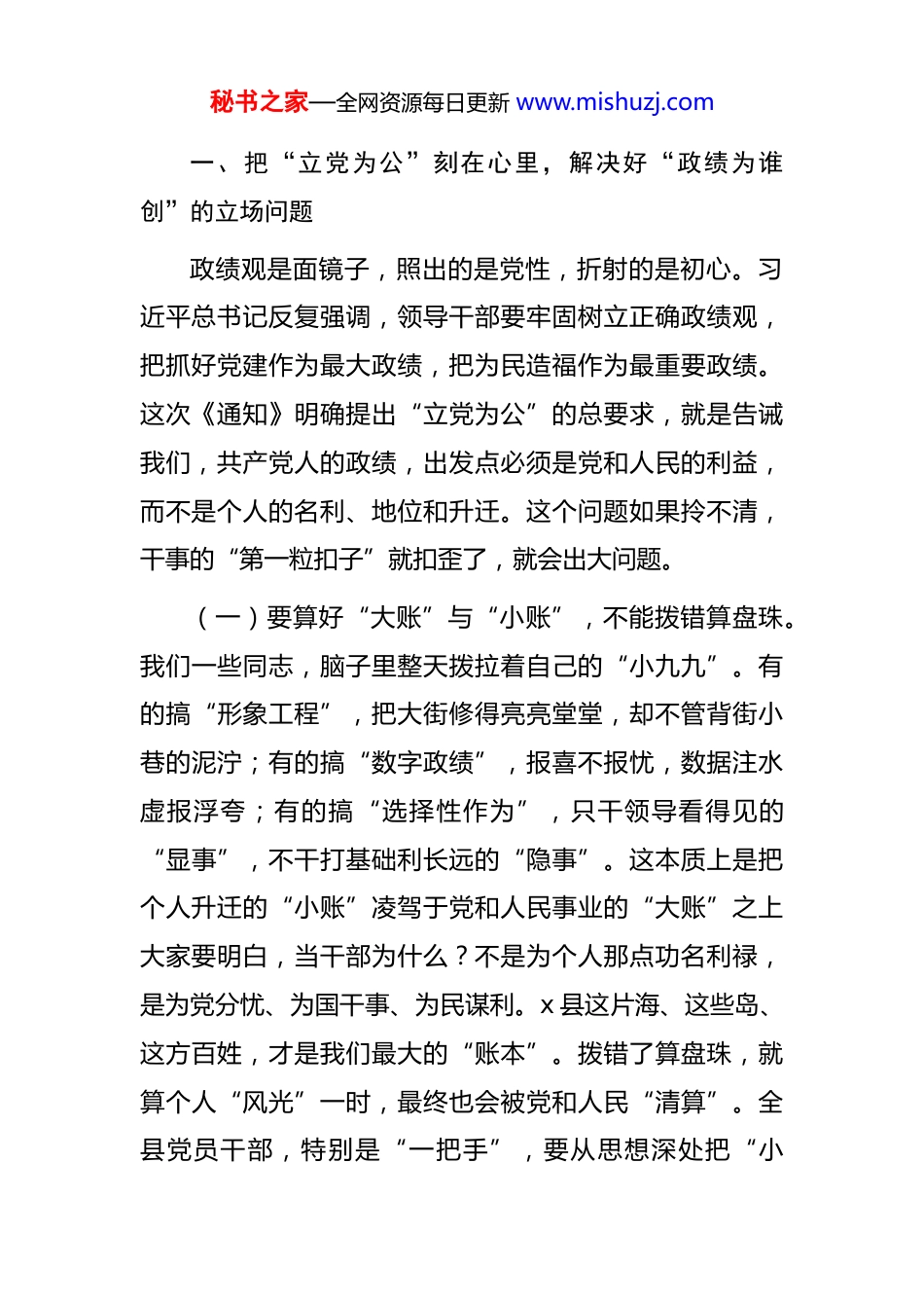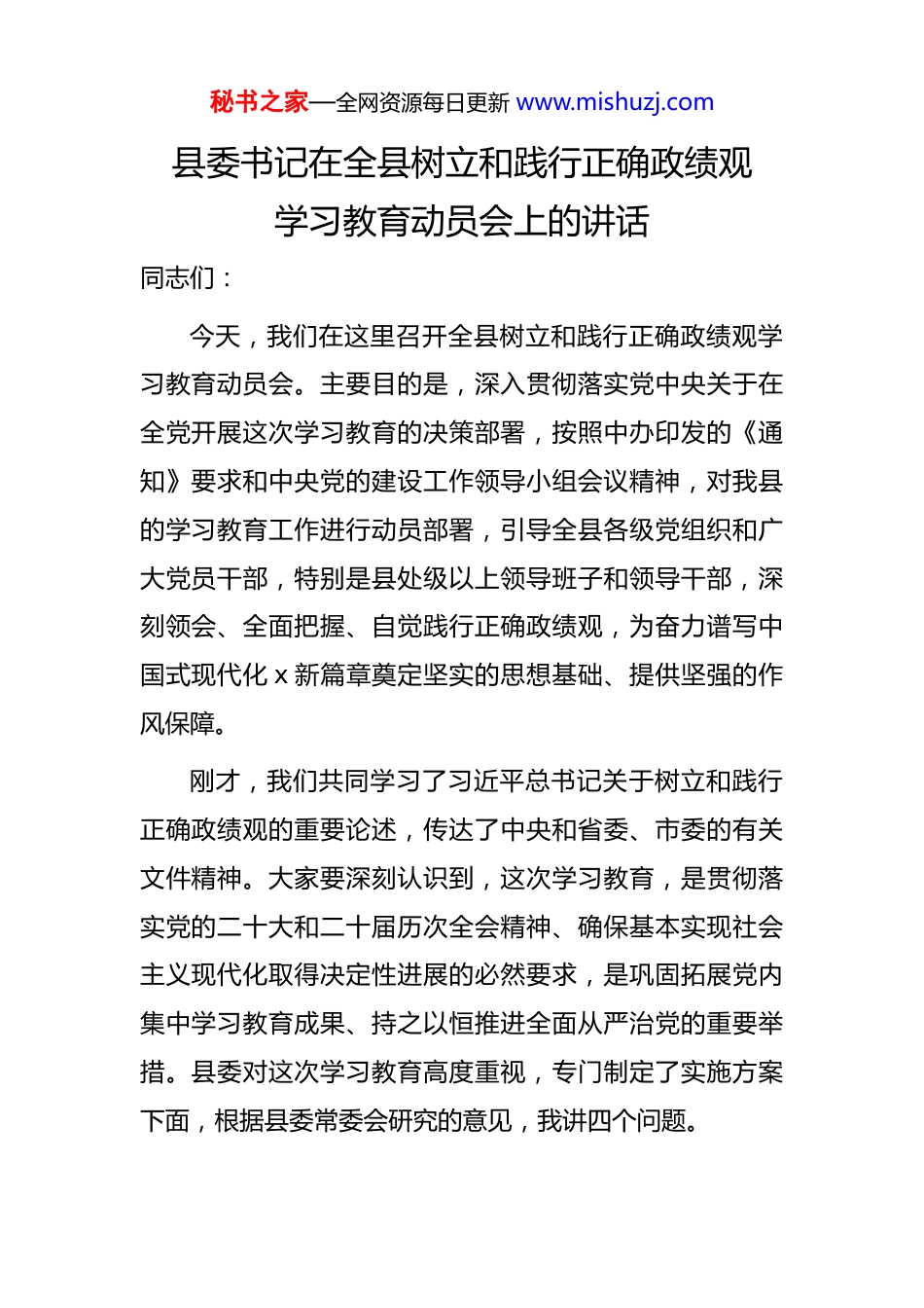 秘书之家—全网资源每日更新 www.mishuzj.com县委书记在全县树立和践行正确政绩观学习教育动员会上的讲话同志们:今天,我们在这里召开全县树立和践行正确政绩观学习教育动员会。主要目的是,深入贯彻落实党中央关于在全党开展这次学习教育的决策部署,按照中办印发的《通知》要求和中央党的建设工作领导小组会议精神,对我县的学习教育工作进行动员部署,引导全县各级党组织和广大党员干部,特别是县处级以上领导班子和领导干部,深刻领会、全面把握、自觉践行正确政绩观,为奋力谱写中国式现代化 x 新篇章奠定坚实的思想基础、提供坚强的作风保障。刚才,我们共同学习了习近平总书记关于树立和践行正确政绩观的重要论述,传达了中央和省委、市委的有关文件精神。大家要深刻认识到,这次学习教育,是贯彻落实党的二十大和二十届历次全会精神、确保基本实现社会主义现代化取得决定性进展的必然要求,是巩固拓展党内集中学习教育成果、持之以恒推进全面从严治党的重要举措。县委对这次学习教育高度重视,专门制定了实施方案下面,根据县委常委会研究的意见,我讲四个问题。秘书之家—全网资源每日更新 www.mishuzj.com一、把“立党为公”刻在心里,解决好“政绩为谁创”的立场问题政绩观是面镜子,照出的是党性,折射的是初心。习近平总书记反复强调,领导干部要牢固树立正确政绩观,把抓好党建作为最大政绩,把为民造福作为最重要政绩。这次《通知》明确提出“立党为公”的总要求,就是告诫我们,共产党人的政绩,出发点必须是党和人民的利益,而不是个人的名利、地位和升迁。这个问题如果拎不清,干事的“第一粒扣子”就扣歪了,就会出大问题。(一)要算好“大账”与“小账”,不能拨错算盘珠。我们一些同志,脑子里整天拨拉着自己的“小九九”。有的搞“形象工程”,把大街修得亮亮堂堂,却不管背街小巷的泥泞;有的搞“数字政绩”,报喜不报忧,数据注水虚报浮夸;有的搞“选择性作为”,只干领导看得见的“显事”,不干打基础利长远的“隐事”。这本质上是把个人升迁的“小账”凌驾于党和人民事业的“大账”之上大家要明白,当干部为什么?不是为个人那点功名利禄,是为党分忧、为国干事、为民谋利。x 县这片海、这些岛、这方百姓,才是我们最大的“账本”。拨错了算盘珠,就算个人“风光”一时,最终也会被党和人民“清算”。全县党员干部,特别是“一把手”,要从思想深处把“小秘书之家—全网资源每日更新 www.mishuzj.com我”融入“大我”,把对党忠诚、为党分忧、为党尽职作为根本政治担当,想问题、作决策、办事情,首先要看是否符合党和国家的利益,是否符合 x 发展的长远利益,是否符合最广大人民群众的根本利益。(二)要跑好“接力”与“冲刺”,不能只烧“三把火”。新官上任,有的同志急于烧“三把火”,急于踢“头三脚”,恨不得一夜之间就换个新天地。这种心情可以理解,但如果不加分析、不搞调研,把前任的规划推倒重来,另起炉灶“翻烧饼”,这不仅是资源的巨大浪费,更是政绩观扭曲的表现。x 的发展是一场“接力赛”,不是百米“冲刺”。我们每一任领导干部,都是接过历史接力棒的一棒。这一棒,既要跑出这一棒的速度,更要稳稳地交到下一棒手中。中央反复强调,要一张蓝图绘到底,一任接着一任干。我们要有“功成不必在我”的胸怀和“功成必定有我”的担当。只要是对 x 长远发展有利、对海岛百姓有益的事情,哪怕不是我们这任提出的,不是我们这任启动的,也要一抓到底、抓出成效。绝不能为了凸显自己,就搞“翻烧饼”式的折腾,那样折腾的是事业,折腾的是民心。我们要像接力赛一样,既要跑好自己这一棒,更要确保交接棒顺畅,共同跑出 x 发展的“加速度”。( 三 ) 要 追 求 “ 口 碑 ” 与 “ 奖 杯 ” , 不 能 只 看秘书之家—全网资源每日更新 www.mishuzj.com“GDP”。干部的政绩,最终写在人民群众的心坎里。金杯银杯不如老百姓的口碑,金奖银奖不如老百姓的夸奖。过去那种“唯 GDP 论英雄”的考核导向已经发生了根本性转变。我们 x 是海岛县,海洋生态是我们的底色,渔业生产是我们的命脉,民生改善是我们...