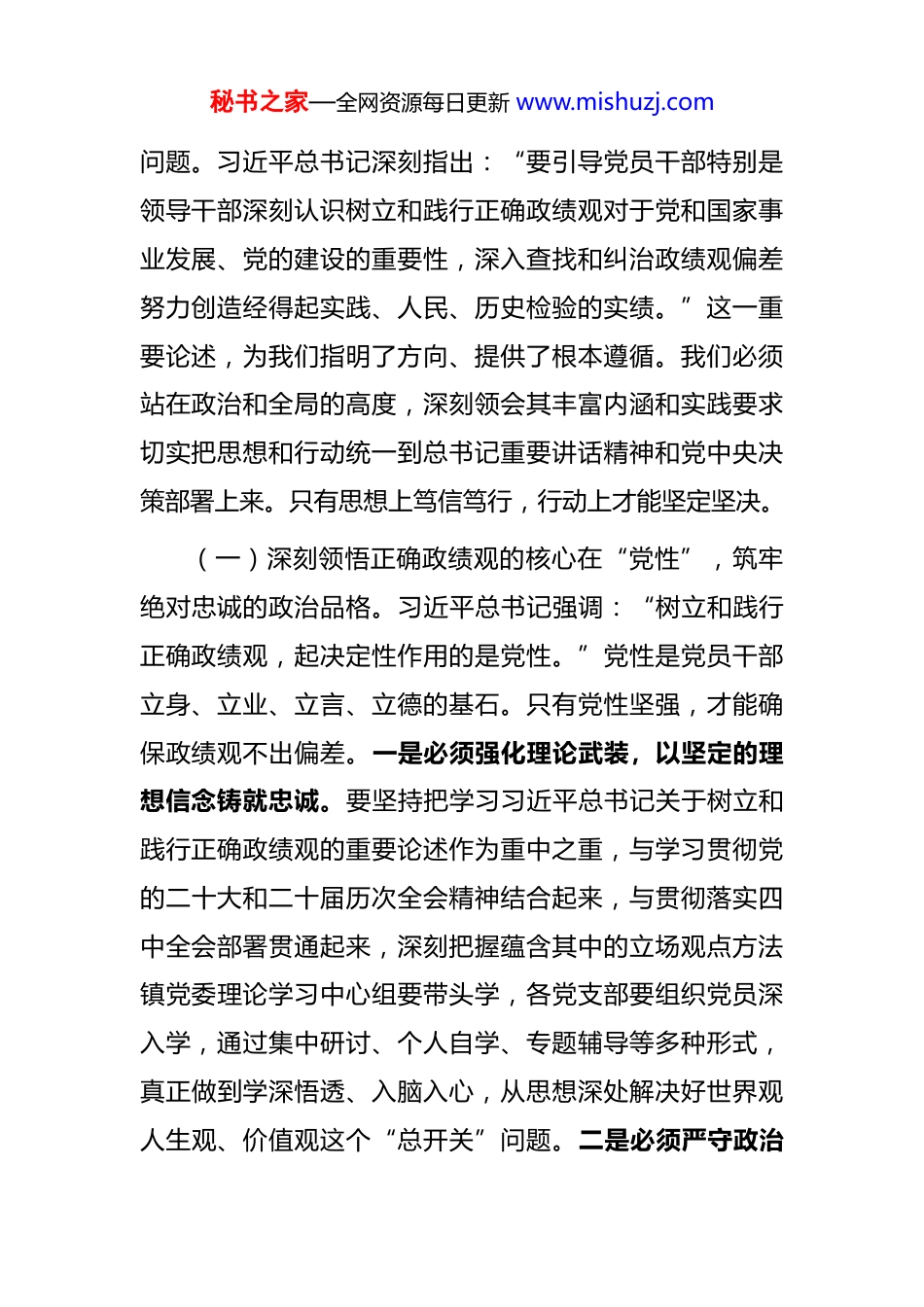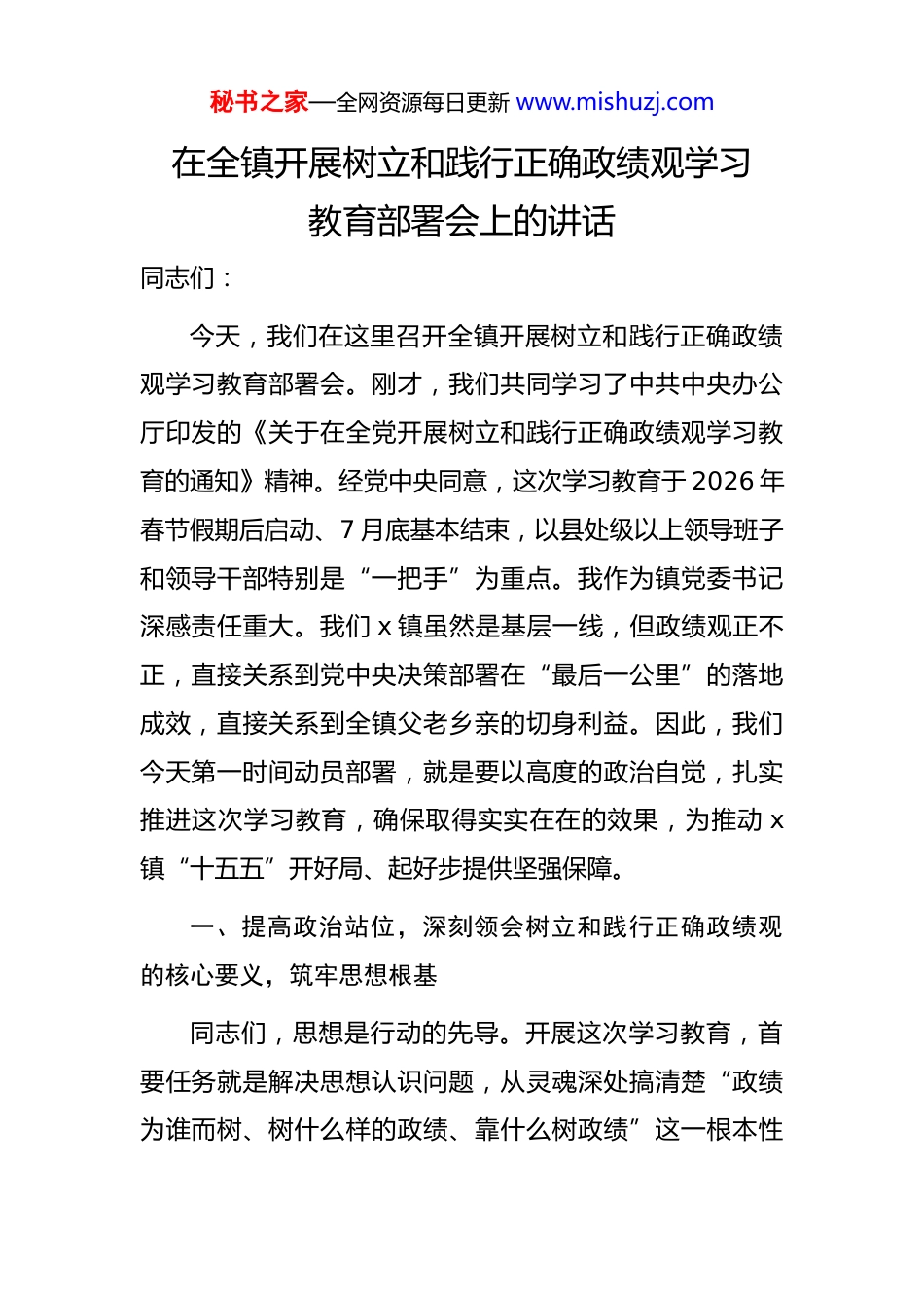 秘书之家—全网资源每日更新 www.mishuzj.com在全镇开展树立和践行正确政绩观学习教育部署会上的讲话同志们:今天,我们在这里召开全镇开展树立和践行正确政绩观学习教育部署会。刚才,我们共同学习了中共中央办公厅印发的《关于在全党开展树立和践行正确政绩观学习教育的通知》精神。经党中央同意,这次学习教育于 2026 年春节假期后启动、7 月底基本结束,以县处级以上领导班子和领导干部特别是“一把手”为重点。我作为镇党委书记深感责任重大。我们 x 镇虽然是基层一线,但政绩观正不正,直接关系到党中央决策部署在“最后一公里”的落地成效,直接关系到全镇父老乡亲的切身利益。因此,我们今天第一时间动员部署,就是要以高度的政治自觉,扎实推进这次学习教育,确保取得实实在在的效果,为推动 x镇“十五五”开好局、起好步提供坚强保障。一、提高政治站位,深刻领会树立和践行正确政绩观的核心要义,筑牢思想根基同志们,思想是行动的先导。开展这次学习教育,首要任务就是解决思想认识问题,从灵魂深处搞清楚“政绩为谁而树、树什么样的政绩、靠什么树政绩”这一根本性秘书之家—全网资源每日更新 www.mishuzj.com问题。习近平总书记深刻指出:“要引导党员干部特别是领导干部深刻认识树立和践行正确政绩观对于党和国家事业发展、党的建设的重要性,深入查找和纠治政绩观偏差努力创造经得起实践、人民、历史检验的实绩。”这一重要论述,为我们指明了方向、提供了根本遵循。我们必须站在政治和全局的高度,深刻领会其丰富内涵和实践要求切实把思想和行动统一到总书记重要讲话精神和党中央决策部署上来。只有思想上笃信笃行,行动上才能坚定坚决。(一)深刻领悟正确政绩观的核心在“党性”,筑牢绝对忠诚的政治品格。习近平总书记强调:“树立和践行正确政绩观,起决定性作用的是党性。”党性是党员干部立身、立业、立言、立德的基石。只有党性坚强,才能确保政绩观不出偏差。一是必须强化理论武装,以坚定的理想信念铸就忠诚。要坚持把学习习近平总书记关于树立和践行正确政绩观的重要论述作为重中之重,与学习贯彻党的二十大和二十届历次全会精神结合起来,与贯彻落实四中全会部署贯通起来,深刻把握蕴含其中的立场观点方法镇党委理论学习中心组要带头学,各党支部要组织党员深入学,通过集中研讨、个人自学、专题辅导等多种形式,真正做到学深悟透、入脑入心,从思想深处解决好世界观人生观、价值观这个“总开关”问题。二是必须严守政治秘书之家—全网资源每日更新 www.mishuzj.com纪律,以鲜明的政治态度践行忠诚。要始终把讲政治摆在首位,时刻关注党中央在关心什么、强调什么,深刻领会什么是党和国家最重要的利益、什么是最需要坚定维护的立场。在谋划工作、推进落实时,首先要对标对表党中央的决策部署,看看有没有偏离方向,有没有打折扣、搞变通。要坚决反对本位主义、地方保护主义,确保党中央政令畅通、令行禁止。三是必须加强党性锤炼,以严格的党内生活淬炼忠诚。要认真执行“三会一课”、民主生活会、组织生活会、谈心谈话等制度,用好批评和自我批评这个锐利武器。领导干部要以普通党员身份参加组织生活,主动检视自身在政绩观方面存在的偏差,深刻剖析问题根源要把党性分析作为民主生活会的重要内容,既查摆工作上的问题,更查找党性上的不足,通过严格的党内政治生活锻炼,不断增强党性修养,永葆共产党人的政治本色。(二)深刻领悟正确政绩观的根本在“为民”,厚植念兹在兹的赤子情怀。习近平总书记指出:“中国共产党把为民办事、为民造福作为最重要的政绩。”我们干工作创政绩,归根到底是为了让人民群众过上更好的日子。一是必须站稳人民立场,始终把群众满意作为第一标准。想问题、作决策、办事情,都要坚持从群众中来、到群众中去,把群众呼声作为第一信号,把群众需求作为第一选择秘书之家—全网资源每日更新 www.mishuzj.com把群众满意作为第一标准。要坚持开门搞教育,查摆问题听取群众意见,整改整治接受群众监督,检验成效让群众评判,真正把群众的“需求清单”转化为我们的“履职清单”。二是必须办好民生实事,始终把群众福...