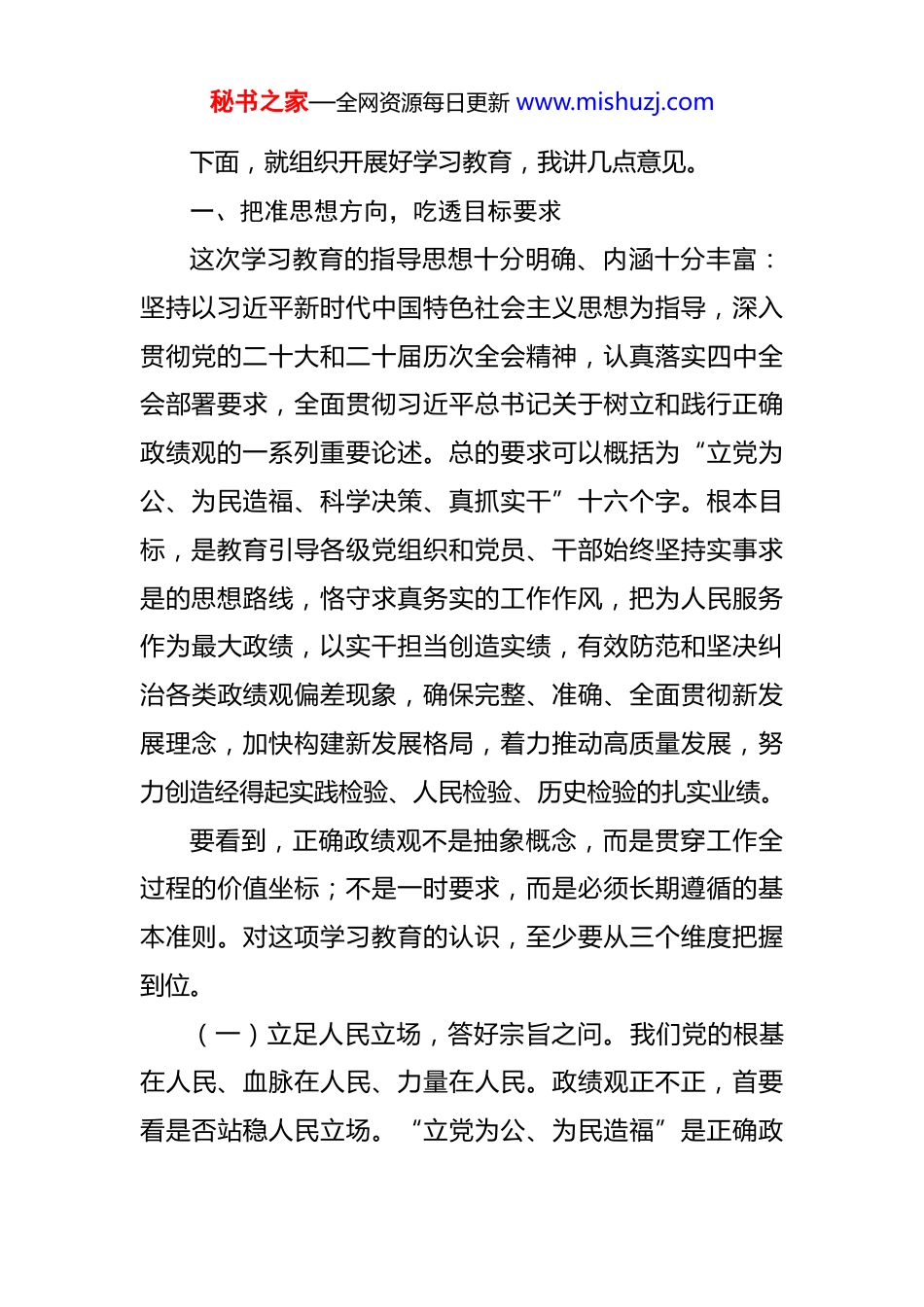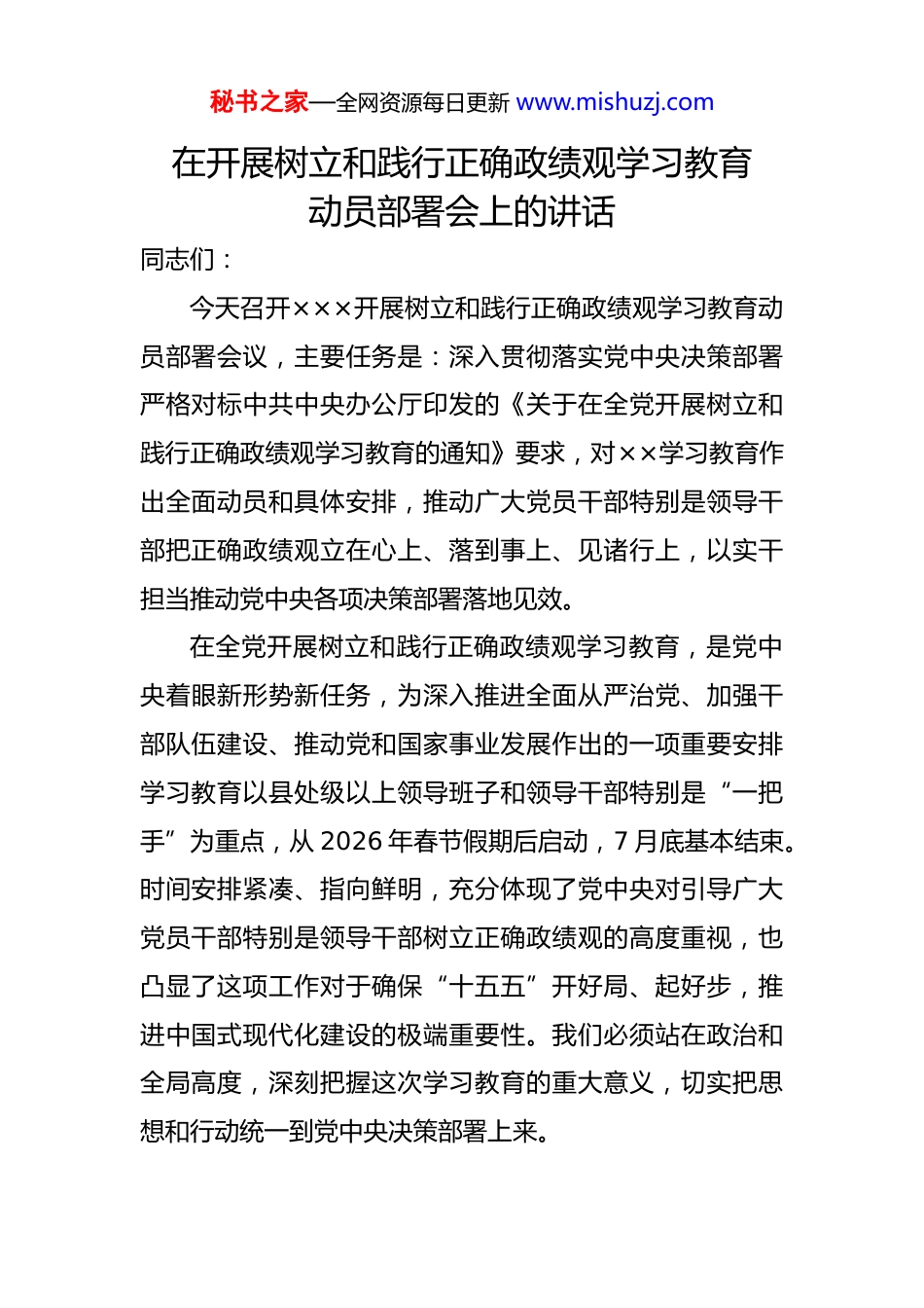 秘书之家—全网资源每日更新 www.mishuzj.com在开展树立和践行正确政绩观学习教育动员部署会上的讲话同志们:今天召开×××开展树立和践行正确政绩观学习教育动员部署会议,主要任务是:深入贯彻落实党中央决策部署严格对标中共中央办公厅印发的《关于在全党开展树立和践行正确政绩观学习教育的通知》要求,对××学习教育作出全面动员和具体安排,推动广大党员干部特别是领导干部把正确政绩观立在心上、落到事上、见诸行上,以实干担当推动党中央各项决策部署落地见效。在全党开展树立和践行正确政绩观学习教育,是党中央着眼新形势新任务,为深入推进全面从严治党、加强干部队伍建设、推动党和国家事业发展作出的一项重要安排学习教育以县处级以上领导班子和领导干部特别是“一把手”为重点,从 2026 年春节假期后启动,7 月底基本结束。时间安排紧凑、指向鲜明,充分体现了党中央对引导广大党员干部特别是领导干部树立正确政绩观的高度重视,也凸显了这项工作对于确保“十五五”开好局、起好步,推进中国式现代化建设的极端重要性。我们必须站在政治和全局高度,深刻把握这次学习教育的重大意义,切实把思想和行动统一到党中央决策部署上来。秘书之家—全网资源每日更新 www.mishuzj.com下面,就组织开展好学习教育,我讲几点意见。一、把准思想方向,吃透目标要求这次学习教育的指导思想十分明确、内涵十分丰富:坚持以习近平新时代中国特色社会主义思想为指导,深入贯彻党的二十大和二十届历次全会精神,认真落实四中全会部署要求,全面贯彻习近平总书记关于树立和践行正确政绩观的一系列重要论述。总的要求可以概括为“立党为公、为民造福、科学决策、真抓实干”十六个字。根本目标,是教育引导各级党组织和党员、干部始终坚持实事求是的思想路线,恪守求真务实的工作作风,把为人民服务作为最大政绩,以实干担当创造实绩,有效防范和坚决纠治各类政绩观偏差现象,确保完整、准确、全面贯彻新发展理念,加快构建新发展格局,着力推动高质量发展,努力创造经得起实践检验、人民检验、历史检验的扎实业绩。要看到,正确政绩观不是抽象概念,而是贯穿工作全过程的价值坐标;不是一时要求,而是必须长期遵循的基本准则。对这项学习教育的认识,至少要从三个维度把握到位。(一)立足人民立场,答好宗旨之问。我们党的根基在人民、血脉在人民、力量在人民。政绩观正不正,首要看是否站稳人民立场。“立党为公、为民造福”是正确政秘书之家—全网资源每日更新 www.mishuzj.com绩观的核心灵魂。必须始终把人民放在心中最高位置,把实现好、维护好、发展好最广大人民根本利益作为一切工作的出发点和落脚点,把为人民办了多少实事、解了多少难题、群众满不满意作为衡量政绩的根本标准,坚决反对“形象工程”“面子工程”,坚决反对劳民伤财、急功近利的短期行为。(二)对标战略全局,校准发展之向。当前,我国发展进入新阶段,贯彻新发展理念、构建新发展格局、推动高质量发展,对领导干部的政绩观提出了新的更高要求。正确的政绩观,必须体现到对党中央重大决策部署的坚决贯彻落实上,体现到对国家重大发展战略、重大规划、重大政策的精准对接和有效执行上。“十五五”时期是我国迈向全面建设社会主义现代化国家新征程的关键五年,我们必须用正确政绩观把准方向、把牢取向,确保各项工作都服务于“国之大者”,不偏离、不走样。(三)坚持实事求是,夯实治理之基。领导干部的政绩观,是其世界观、人生观、价值观在干事创业中的集中体现,直接影响决策行为和工作成效。“科学决策、真抓实干”是践行正确政绩观的关键路径。要坚持一切从实际出发,深入调查研究,尊重客观规律,善于运用科学方法进行决策和管理,坚决反对拍脑袋决策、拍胸脯蛮干。要秘书之家—全网资源每日更新 www.mishuzj.com保持一张蓝图干到底的韧劲,一任接着一任干,以踏石留印、抓铁有痕的劲头推进落实,力戒形式主义、官僚主义要通过这次学习教育,引导广大党员干部特别是领导干部真正把正确政绩观内化于心、外化于行,使其成为推动本地区本部门本单位各项事业发展的思想自觉和行动准则。二、紧扣“学...