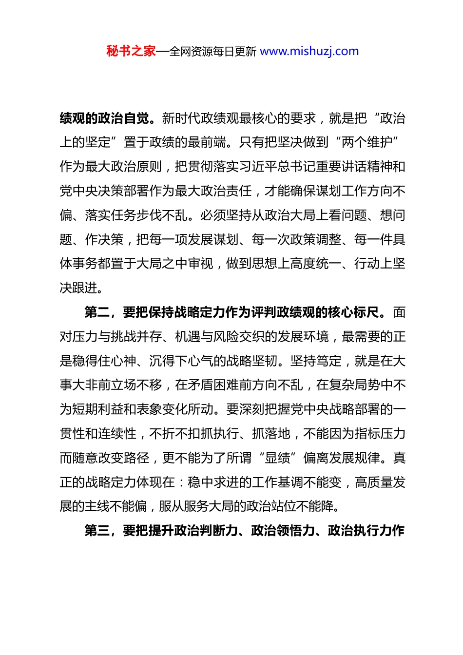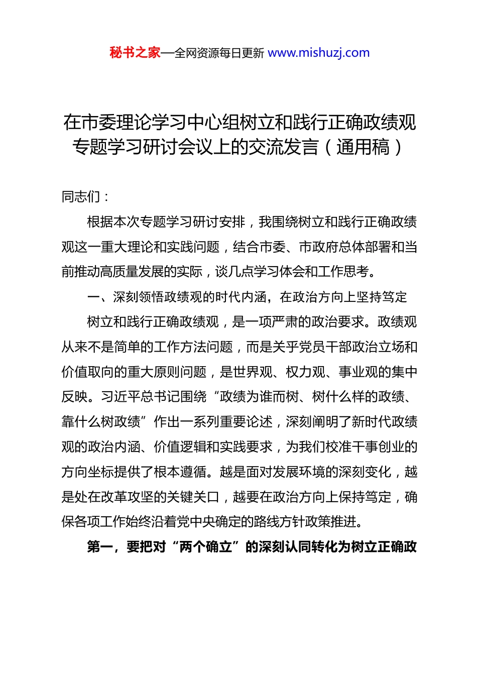 秘书之家—全网资源每日更新 www.mishuzj.com在市委理论学习中心组树立和践行正确政绩观专题学习研讨会议上的交流发言(通用稿)同志们:根据本次专题学习研讨安排,我围绕树立和践行正确政绩观这一重大理论和实践问题,结合市委、市政府总体部署和当前推动高质量发展的实际,谈几点学习体会和工作思考。一、深刻领悟政绩观的时代内涵,在政治方向上坚持笃定树立和践行正确政绩观,是一项严肃的政治要求。政绩观从来不是简单的工作方法问题,而是关乎党员干部政治立场和价值取向的重大原则问题,是世界观、权力观、事业观的集中反映。习近平总书记围绕“政绩为谁而树、树什么样的政绩、靠什么树政绩”作出一系列重要论述,深刻阐明了新时代政绩观的政治内涵、价值逻辑和实践要求,为我们校准干事创业的方向坐标提供了根本遵循。越是面对发展环境的深刻变化,越是处在改革攻坚的关键关口,越要在政治方向上保持笃定,确保各项工作始终沿着党中央确定的路线方针政策推进。第一,要把对“两个确立”的深刻认同转化为树立正确政秘书之家—全网资源每日更新 www.mishuzj.com绩观的政治自觉。新时代政绩观最核心的要求,就是把“政治上的坚定”置于政绩的最前端。只有把坚决做到“两个维护”作为最大政治原则,把贯彻落实习近平总书记重要讲话精神和党中央决策部署作为最大政治责任,才能确保谋划工作方向不偏、落实任务步伐不乱。必须坚持从政治大局上看问题、想问题、作决策,把每一项发展谋划、每一次政策调整、每一件具体事务都置于大局之中审视,做到思想上高度统一、行动上坚决跟进。 第二,要把保持战略定力作为评判政绩观的核心标尺。面对压力与挑战并存、机遇与风险交织的发展环境,最需要的正是稳得住心神、沉得下心气的战略坚韧。坚持笃定,就是在大事大非前立场不移,在矛盾困难前方向不乱,在复杂局势中不为短期利益和表象变化所动。要深刻把握党中央战略部署的一贯性和连续性,不折不扣抓执行、抓落地,不能因为指标压力而随意改变路径,更不能为了所谓“显绩”偏离发展规律。真正的战略定力体现在:稳中求进的工作基调不能变,高质量发展的主线不能偏,服从服务大局的政治站位不能降。 第三,要把提升政治判断力、政治领悟力、政治执行力作秘书之家—全网资源每日更新 www.mishuzj.com为树立正确政绩观的能力支撑。政治判断力体现方向判断是否准确,政治领悟力体现理论武装是否牢固,政治执行力体现落实政策是否坚决。三者相辅相成,决定了干部能不能在复杂局面中找准路、干成事。要增强从政治上看问题的意识,提高识变应变的能力,善于从党中央精神中找方向。更要把领悟方向变成实际行动,把理解意图转化为具体举措,把政治态度落实到发展治理全过程,使政绩的每一条数据、每一项成果都能体现对党中央精神的执行力。 第四,要把稳中求进的总要求贯穿政绩观的全过程全方位“稳”是大局,“进”是方向。坚持笃定,就是要在稳的基础上求进、在进的过程中固稳,统筹好长期与短期、当前与长远、速度与质量之间的关系,保持发展节奏不乱、工作重点不偏、政策连续性不减。要深入理解稳中求进不是简单的“不变”,而是在保持战略定力的同时以改革的办法解决前进中的问题,以创新的方式化解发展中的矛盾,以务实的举措提升整体效能。二、牢固树立为民造福根本立场,在价值取向上坚守初心树立和践行正确政绩观,根本在于坚定“人民至上”的价值取向。政绩归根结底是为了人民而创,人民满意是最重要的秘书之家—全网资源每日更新 www.mishuzj.com评价标准。习近平总书记深刻指出,为民造福是最大政绩,这既是政治要求,也是实践准则,更是党员干部应当始终坚守的价值立场。在推进现代化建设的过程中,我们所面对的矛盾更复杂、群众诉求更多样,更需要把初心信念立得更稳,把人民立场守得更牢,使发展的过程持续指向人民、发展的成果不断惠及人民。第一,要在坚定人民立场上保持自觉,使一切工作都指向群众利益。群众立场不是抽象概念,而是对每一项政策、每一件事情的基本判断标准。只有真正站在群众角度分析问题、设计政策、推动落实,政绩的方向才不会偏,工作的落点才会准...