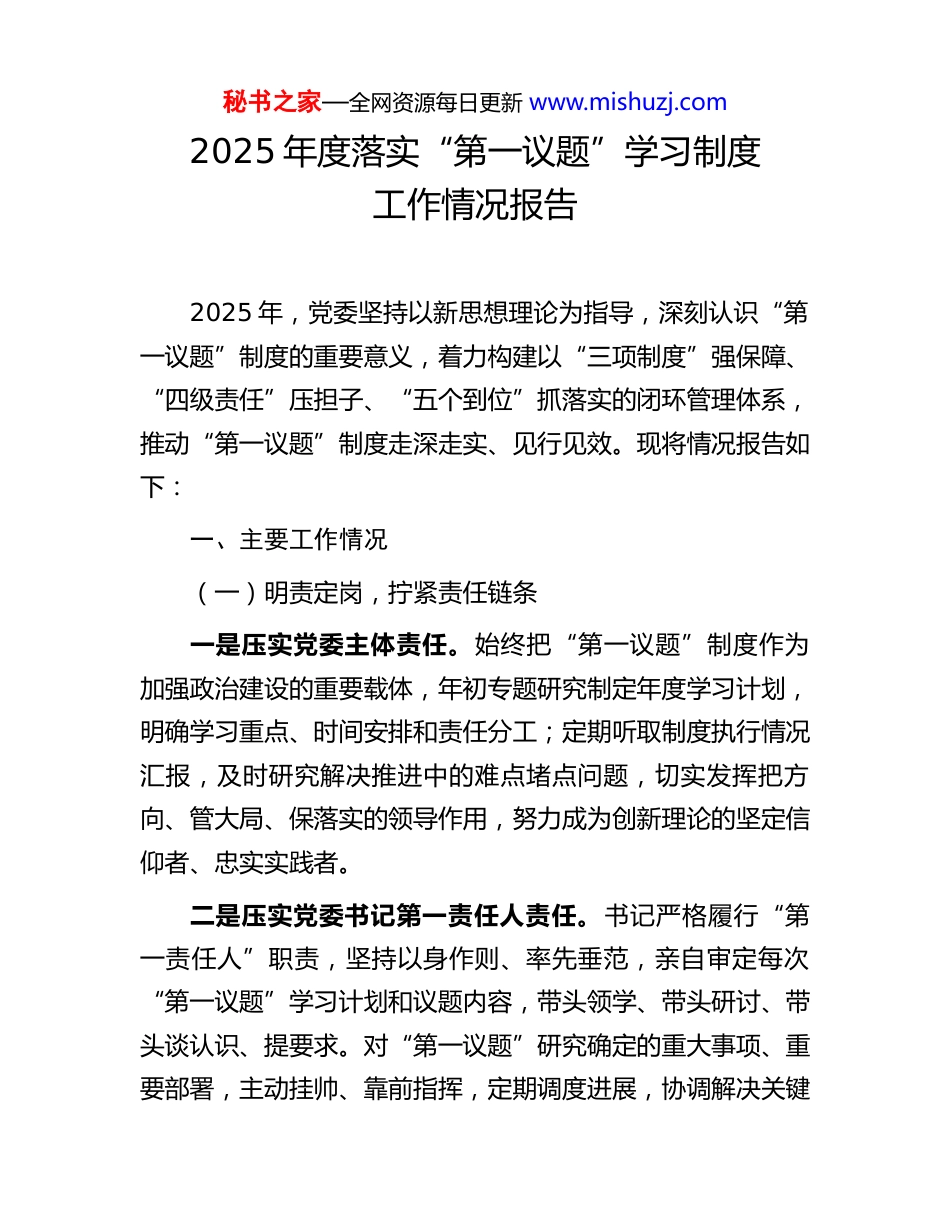 秘书之家—全网资源每日更新 www.mishuzj.com2025 年度落实“第一议题”学习制度工作情况报告2025 年,党委坚持以新思想理论为指导,深刻认识“第一议题”制度的重要意义,着力构建以“三项制度”强保障、“四级责任”压担子、“五个到位”抓落实的闭环管理体系,推动“第一议题”制度走深走实、见行见效。现将情况报告如下:一、主要工作情况(一)明责定岗,拧紧责任链条一是压实党委主体责任。始终把“第一议题”制度作为加强政治建设的重要载体,年初专题研究制定年度学习计划,明确学习重点、时间安排和责任分工;定期听取制度执行情况汇报,及时研究解决推进中的难点堵点问题,切实发挥把方向、管大局、保落实的领导作用,努力成为创新理论的坚定信仰者、忠实实践者。二是压实党委书记第一责任人责任。书记严格履行“第一责任人”职责,坚持以身作则、率先垂范,亲自审定每次“第一议题”学习计划和议题内容,带头领学、带头研讨、带头谈认识、提要求。对“第一议题”研究确定的重大事项、重要部署,主动挂帅、靠前指挥,定期调度进展,协调解决关键秘书之家—全网资源每日更新 www.mishuzj.com问题,确保制度执行不打折扣、不走过场。三是压实党委委员“一岗双责”。委员在抓好分管业务工作的同时,认真履行“一岗双责”责任,扎实推动“第一议题”议定事项在分管领域落地见效。在主持召开分管领域专题会议时,坚持把学习贯彻最新精神与业务工作同部署、同推进;定期赴分管领域、支部工作联系点检查指导“第一议题”制度落实情况,推动学习成果转化为破解难题、推动发展的实际成效。四是压实相关部门协同责任。党委办公室切实发挥统筹协调作用,加强对“第一议题”工作的全流程管理,高质量做好议题准备、会务组织、纪要编发及议定事项的督办落实;宣传部门统筹抓好新闻宣传和舆论引导工作,营造浓厚学习氛围;各业务部室结合职能职责,细化落实举措,确保“第一议题”制度要求一贯到底、层层落实。(二)立梁架柱,筑牢制度根基一是健全制度机制,确保规范执行。修订完善《“第一议题”学习制度实施细则》,明确学习内容、程序要求、成果转化等关键环节,做到有章可循、有据可依。建立“第一议题”学习资料库,动态更新最新重要讲话、重要会议精神和政策文件,确保学习内容及时、准确、权威。二是强化监督机制,推动一贯到底。将“第一议题”制秘书之家—全网资源每日更新 www.mishuzj.com度执行情况纳入政 z 监督、内部巡察、党建考核和领导班子、领导干部年度考核的重要内容,通过日常督查、专项检查、述职评议等方式,倒逼责任落实。对执行不力、流于形式的单位和个人及时提醒、通报批评,确保制度刚性运行。三是完善考核机制,激发内生动力。充分发挥考核“指挥棒”作用,将“第一议题”学习质量、转化成效与绩效考核、评优评先挂钩,树立“学用相长、实干实绩”的鲜明导向。对在推动“第一议题”成果转化中表现突出的集体和个人予以表彰激励,营造比学赶超、争先创优的良好氛围。(三)闭环管理,强化执行落实一是传达学习到位,确保入脑入心。每次“第一议题”学习后,第一时间将学习内容和贯彻落实举措印发至各成员单位,明确学习重点和实践要求,推动干部全面学、深入学、系统学。通过中心组学习、专题研讨、辅导讲座等形式,引导广大干部在深学细悟中把牢大局方向、理清工作思路、增强行动自觉。二是研究部署到位,确保方向不偏。坚持理论联系实际,班子成员每人每年至少牵头开展 1 项专题调研,围绕“第一议题”涉及的重大战略、重点任务,深入基层一线察实情、找症结、谋对策,切实提升运用创新理论研究新情况、解决新问题、总结新经验、探索新规律的能力。秘书之家—全网资源每日更新 www.mishuzj.com三是贯彻落实到位,确保见行见效。将“第一议题”议定事项有机融入年度重点工作和分管业务,逐项分解任务,明确责任部室、责任人和完成时限,实行挂图作战、压茬推进。注重把学习成果转化为推动高质量发展、深化改革创新、防范化解风险的具体举措。四是跟踪督办到位,确保一抓到底。建立“第一议题”落实工作台账,对每项议定事项实行清单化、项目化...