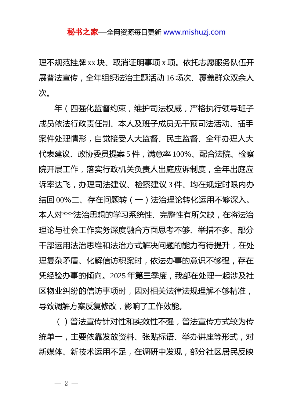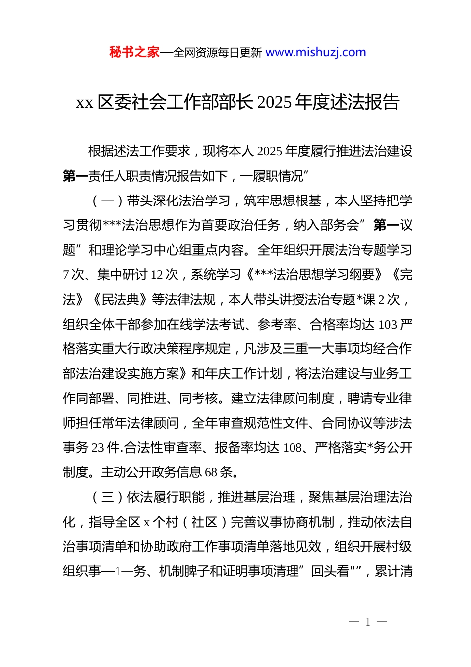 秘书之家—全网资源每日更新 www.mishuzj.comxx 区委社会工作部部长 2025 年度述法报告根据述法工作要求,现将本人 2025 年度履行推进法治建设第一责任人职责情况报告如下,一履职情况”(一)带头深化法治学习,筑牢思想根基,本人坚持把学习贯彻***法治思想作为首要政治任务,纳入部务会”第一议题”和理论学习中心组重点内容。全年组织开展法治专题学习7 次、集中研讨 12 次,系统学习《***法治思想学习纲要》《完法》《民法典》等法律法规,本人带头讲授法治专题*课 2 次,组织全体干部参加在线学法考试、参考率、合格率均达 103 严格落实重大行政决策程序规定,凡涉及三重一大事项均经合作部法治建设实施方案》和年庆工作计划,将法治建设与业务工作同部署、同推进、同考核。建立法律顾问制度,聘请专业律师担任常年法律顾问,全年审查规范性文件、合同协议等涉法事务 23 件.合法性审查率、报备率均达 108、严格落实*务公开制度。主动公开政务信息 68 条。(三)依法履行职能,推进基层治理,聚焦基层治理法治化,指导全区 x 个村(社区)完善议事协商机制,推动依法自治事项清单和协助政府工作事项清单落地见效,组织开展村级组织事—1—务、机制脾子和证明事项清理”回头看"”,累计清— 1 —秘书之家—全网资源每日更新 www.mishuzj.com理不规范挂牌 xx 块、取消证明事项 x 项。依托志愿服务队伍开展普法宣传,全年组织法治主题活动 16 场次、覆盖群众双余人次。年(四强化监督约束,维护司法权威,严格执行领导班子成员依法行政责任制、本人及班子成员无干预司法活动、插手案件处理情形,自觉接受人大监督、民主监督、全年办理人大代表建议、政协委员提案 5 件,满意率 100%、配合法院、检察院开展工作,落实行政机关负责人出庭应诉制度,全年出庭应诉率达飞,办理司法建议、检察建议 3 件、均在规定时限内办结回 00%二、存在问题转(一)法治理论转化运用不够深入。本人对***法治思想的学习系统性、完整性有所欠缺,在将法治理论与社会工作实务深度融合方面思考不够、举措不多、部分干部运用法治思维和法治方式解决问题的能力有待提升,在处理复杂矛盾、化解信访积案时,依法办事的意识不够强,存在凭经验办事的倾向。2025 年第三季度,我部在处理一起涉及社区物业纠纷的信访事项时,因对相关法律法规理解不够精准,导致调解方案反复修改,影响了工作效能。()普法宣传针对性和实效性不强,普法宣传方式较为传统单一,主要依靠发放资料、张贴标语、举办讲座等形式,对新媒体、新技术运用不足,在调研中发现,部分社区居民反映— 2 —秘书之家—全网资源每日更新 www.mishuzj.com普法内容与实际生活关联不紧密,"看不懂、记不住、用不上"的问题不同程度存在。2025 年开展的群众法治满意度调查显示,我部普法工作满意度为 82.6%,低于全区平均水平。针对青少年、老年人、流动人口等不同群体的差异化普法方案研究不够深入,普法教育的精准性有待提高。(二)依法及职能力各在短板弱项,我部作为新组建部门法治工作力量配备不足,目前仅有!名兼职人员负责法治工作,专律素有待提在规性文定方面在调论证不够充分、征求意见范国不够广的问题,202 年制定的份规性文件,事后评估发现部分条款操作性不强,需进一步修订善。落实”谁执法谁普法”责任制不够到位,与社会工作职能相关的普法责任清单尚未完全建立。(四)部门协同联动机制不够健全。在推进基层治理法治化进程中与司法、民、信的海通协领共享、联合执法、协同处等方面存在制度性得。235 年在处理 xx 小区业主维权事件时,因与相关部门街接不畅,出现重复交办、多头办理的情况、给群众带来不便、在信访工作法治化推进中,与法院、检察院的联动机制运行不够常态化,府院联动、府检联动的实际效果有待增强。(五)监督考核机制有待完善。法治建设考核评价体系不— 3 —秘书之家—全网资源每日更新 www.mishuzj.com够科学,考核指标设置存在重形式轻内容、重台账轻实效的问题。对干部依法行政能力的考核评价标准不够细化,考核结果运用不够充分。内部层级监督作用发挥...