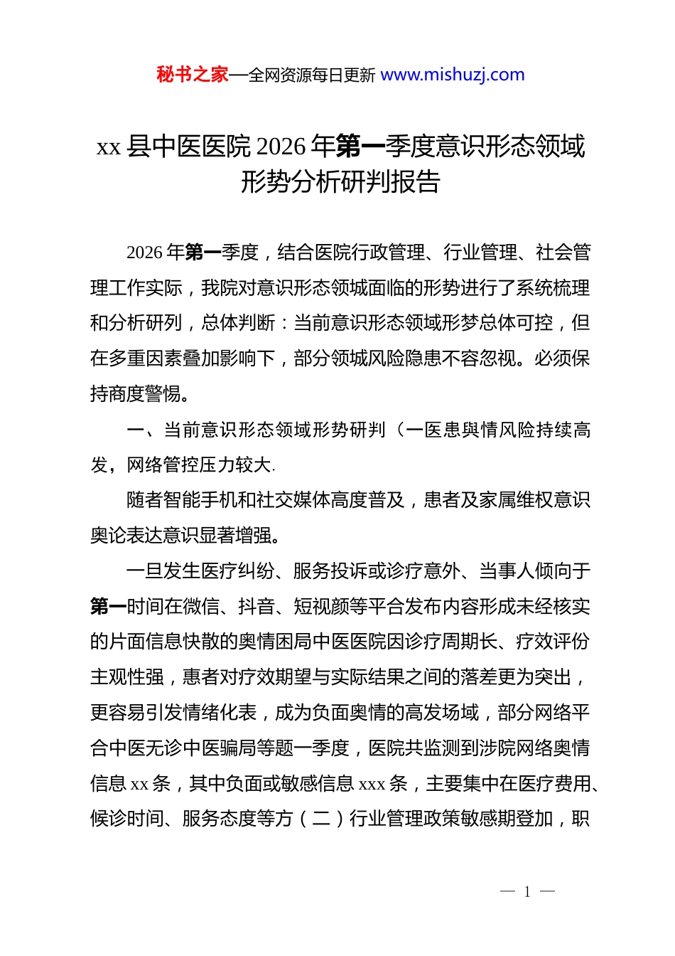 秘书之家—全网资源每日更新 www.mishuzj.comxx 县中医医院 2026 年第一季度意识形态领域形势分析研判报告2026 年第一季度,结合医院行政管理、行业管理、社会管理工作实际,我院对意识形态领城面临的形势进行了系统梳理和分析研列,总体判断:当前意识形态领域形梦总体可控,但在多重因素叠加影响下,部分领城风险隐患不容忽视。必须保持商度警惕。一、当前意识形态领域形势研判(一医患與情风险持续高发,网络管控压力较大.随者智能手机和社交媒体高度普及,患者及家属维权意识奥论表达意识显著增强。一旦发生医疗纠纷、服务投诉或诊疗意外、当事人倾向于第一时间在微信、抖音、短视颜等平合发布内容形成未经核实的片面信息快散的奥情困局中医医院因诊疗周期长、疗效评份主观性强,惠者对疗效期望与实际结果之间的落差更为突出,更容易引发情绪化表,成为负面奥情的高发场域,部分网络平合中医无诊中医骗局等题一季度,医院共监测到涉院网络奥情信息 xx 条,其中负面或敏感信息 xxx 条,主要集中在医疗费用、候诊时间、服务态度等方(二)行业管理政策敏感期登加,职— 1 —秘书之家—全网资源每日更新 www.mishuzj.com工思想波动隐患上升.2026 年一季度,医疗卫生体制改革深入推进,drg/dip 付费改革持续扩面,薪酬制度和绩效考核方案调整密集落地,医院内都深度调整期与改革阵痛期相互金加,部分临床科室医务人员对绩效方案调整反映较为强烈,认为中医科室诊疗教率评价标准与西医不具可比性,存在“干多干少一个样*””中医特色被边缘化”等情绪积聚。个别人员在非正式场合发表对改革政策的片面解读甚至抵触言论,如不及时引导,可能在科室间形成负面情绪蔓建,影响医院改革大局,此外、部分管理干部对政策理解不到位、传导不准确,存在因误读政策引发思想混乱的风险。“科普名义对中医理论休系进行系统性质疑,混淆视听、设导公众,对中医药文化传承和群众就医信心产生负面影响,县城群众中医认知水平参差不,部分惠者网络论影响,对中医治疗方案持怀疑态度,医患沟通难度加大。本院中医文化宣传方式较为单一。在新媒体阵地建设和中医药文化科普传播方面主动发声不够,客观上给错误认知留下了渗透空间。(四)社会管理领域人员流动频繁,外部渗透风险客观存在。,医院作为面向社会开放的公共服务机构,每日接诊患者— 2 —秘书之家—全网资源每日更新 www.mishuzj.com和家属人流量大、来源广、人员构成复杂、一季度就诊高峰期间,医院日均门诊量约双人次,住院惠者保持在 x 人左右,外来人员大量聚集,部分境外非政府组织或**团体借助就医探视等机 2 会渗透的风险客观存在,医院后勤、保卫等岗位流动用工人员政治教育相对薄弱,对外部不良信息的辨别抵御能力不强,构成意识形态安全的潜在漏洞。二、主要风险隐患梳理一奥情应对机制不健全。现有网络奥情监测主要依靠人工搜索,缺乏系绒性监测工具,奥情发现时效性不足;奥情处置预案不够细化,遭遇突发性负面舆情时存在反应迟缓、口径不统一的风险。”——部分干部意识形态敏感性不强,少数中层干部将意识形态工作等同于政治学习,对科室内出现的苗头性问题习惯”冷处理,愿想政治工作主动介入意识有待强化,对改革政策的解释传导存在失真失准问题。一职工网络言行缺乏规范引导,医院工作人员个人社交媒体账号使用级为随意,存在无意间转发不实信息、发表情绪化言论的情况,相关管理制度执行弹性较大,对医院形象和意识形态安全构成隐患。「一院内重点场所管理存在盲区。候诊区、住院病区等患者聚集场所偶有余教宣传品传递、虚假医疗广告散发等情况、宣传栏内容审核不够严格,意识形态阵地管理存— 3 —秘书之家—全网资源每日更新 www.mishuzj.com在漏洞。三、对策建议(一)建立健全典情监测和快速响应机制,指定专人负责网络奥情日常监测,重点关注微信、抖音等平合涉院信息,实现每-3-日巡查、重要信息即时报告,制定分级與情处置预案,明确不同级别真情的响应时限和处置流程,确保突发典情发生后 2 小时内完成研判、4 小时内作出回应,将奥情风险化解在萌芽状态。开员()加强干部意识形态工...