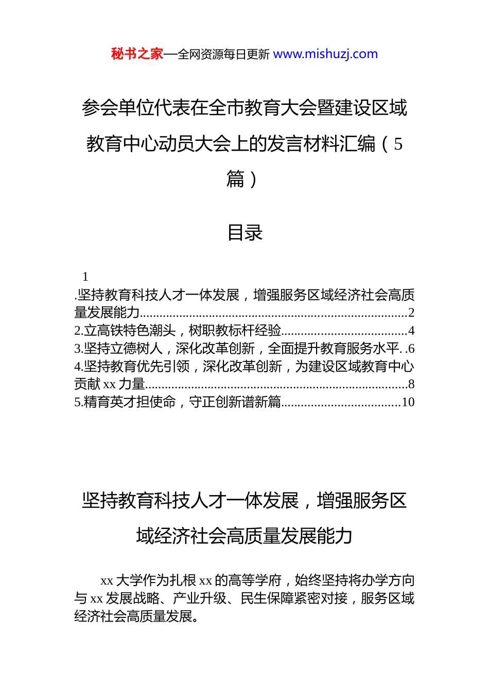 秘书之家—全网资源每日更新 www.mishuzj.com参会单位代表在全市教育大会暨建设区域教育中心动员大会上的发言材料汇编(5篇)目录1.坚持教育科技人才一体发展,增强服务区域经济社会高质量发展能力.................................................................................22.立高铁特色潮头,树职教标杆经验......................................43.坚持立德树人,深化改革创新,全面提升教育服务水平. .64.坚持教育优先引领,深化改革创新,为建设区域教育中心贡献 xx 力量................................................................................85.精育英才担使命,守正创新谱新篇....................................10坚持教育科技人才一体发展,增强服务区域经济社会高质量发展能力xx 大学作为扎根 xx 的高等学府,始终坚持将办学方向与 xx 发展战略、产业升级、民生保障紧密对接,服务区域经济社会高质量发展。秘书之家—全网资源每日更新 www.mishuzj.com学校坚持人才强校战略,打造高水平人才高地。创新人才引育思路,高层次人才增至 xxx 人,其中国家级人才新增 xx 人,博士学位教师新增 xxx 余人,人才集聚效应日益凸显。深化教育教学改革,提升人才培养质量。紧扣 xx 和 xx现代产业体系建设需要,优化学科专业布局。积极筹建计量学院,为智能衡器产业发展提供人才支撑。近三年本科毕业生留衡就业率稳步提升。其中 xxxx 年研究生在 xx 就业xxx 人,留衡率 xx.x%。坚持创新驱动,激活高质量发展引擎。核科学与技术入选“世界一流培育学科”,一级博士学位授权点增至 x 个,esi 全球排名前 x%学科增至 x 个。强化有组织科研,近三年承担技术服务和技术转让项目经费总额 x.x 亿元,其中 xx市占比 xx.x%。深化医教研协同,增强医疗服务能力。附属医院增至 x所,开放床位 x 万余张,年门急诊量约 xxx 万人次。获批国家级临床重点建设和培育专科 xx 个,建成 xx 省首个重大疫情救治基地,为 xx 建设国家区域医疗中心贡献力量。下一步,xx 大学将全面对接 xx“制造立市、文旅兴城”发展战略,聚焦核技术应用、智能装备制造、新材料等重点领域,推动教育链、科技链、人才链和产业链、创新链深度融合,为 xx 经济社会高质量发展贡献智慧和力量。立高铁特色潮头,树职教标杆经验xx 高速铁路职业技术学院立足新时代职教发展重大机遇,主动融入区域发展大局,聚力推进“教育、科技、人才”三位一体综合改革。学院坚持铸魂育人,擦亮办学底色。持续推动*的创新秘书之家—全网资源每日更新 www.mishuzj.com理论进教材、进课堂、进头脑,构建“大思政”育人格局深入挖掘红色资源,开展“红色足迹”研学,让红色基因融入血脉。拓展社会实践育人,精准对接乡村振兴、社区服务等需求,让学生在实践中学真知、长才干。着力提质赋能,锻造支撑发展硬核实力。紧扣行业需求,专业布局持续向高端化、智能化升级,新增机电一体化技术、跨境电商等紧缺专业。深化校企“双元”协同育人,牵头成立 xx 市域产教联合体,与广铁集团共建“火车头工匠学院”。生源质量稳步提升,近三成毕业生留衡兴衡,为地方经济发展持续输送高技能人才。积极服务大局,彰显特色办学典型经验。构建全链条创新创业培育体系,学生在省级以上双创大赛中屡获佳绩搭建多元化技术服务平台,主动对接企业技术难题开展定向攻关。积极响应职教出海号召,在泰国、几内亚成立“天佑”铁路学院,培养本土人才 xxx 多名,成为 xx 省中非职教合作的闪亮名片。xx 高速铁路职业技术学院将以更高的站位、更实的举措,努力培养更多大国工匠、能工巧匠,为 xx 职业教育发展和区域教育中心建设贡献澎湃的“高铁职院”力量。坚持立德树人,深化改革创新,全面提升教育服务水平目前,我市现有在校学生 xxx 万人,教职员工 xx.x 万人,教育规模稳居全省第二,“规民”和“双减”改革纵深推进,学生防溺水、心理健康教育等工作走在全省乃至全国前列,为建设区域教育中心奠定了坚实基础。市教育局将坚决贯彻市委、市政府的决策部署,紧扣区域教育中...