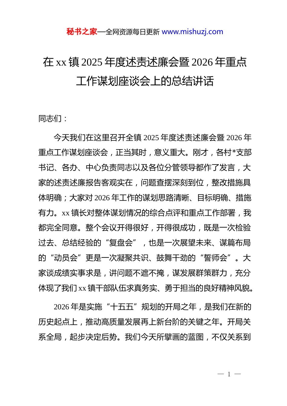 秘书之家—全网资源每日更新 www.mishuzj.com在 xx 镇 2025 年度述责述廉会暨 2026 年重点工作谋划座谈会上的总结讲话同志们:今天我们在这里召开全镇 2025 年度述责述廉会暨 2026 年重点工作谋划座谈会,正当其时,意义重大。刚才,各村*支部书记、各办、中心负责同志以及各位分管领导都作了发言,大家的述责述廉报告客观实在,问题查摆深刻到位,整改措施具体明确;大家对 2026 年工作的谋划思路清晰、目标明确、措施有力。xx 镇长对整体谋划情况的综合点评和重点工作部署,我都完全同意。整个会议开得很好,开得很成功,既是一次检验过去、总结经验的“复盘会”,也是一次展望未来、谋篇布局的“动员会”更是一次凝聚共识、鼓舞干劲的“誓师会”。大家谈成绩实事求是,讲问题不遮不掩,谋发展群策群力,充分体现了我们 xx 镇干部队伍求真务实、勇于担当的良好精神风貌。2026 年是实施“十五五”规划的开局之年,是我们在新的历史起点上,推动高质量发展再上新台阶的关键之年。开局关系全局,起步决定后势。我们今天所擘画的蓝图,不仅关系到— 1 —秘书之家—全网资源每日更新 www.mishuzj.com2026 年我们能交出一份怎样的答卷,更将为未来五年的发展奠定坚实基础。刚才会议上传达学习了******在中央农村工作会议上的****精神以及中央、自治区和 xx 区有关会议精神,这为我们指明了前进方向、提供了根本遵循。全镇上下必须深刻领会、准确把握,切实把思想和行动统一到上级的决策部署上来,以“开局即决战、起步即冲刺”的昂扬姿态,奋力开创 xx 镇各项事业发展的新局面。下面,结合大家的发言和我的思考,我再强调四点意见。一、聚焦“一个核心”,在推动产业转型升级上展现新作为发展是第一要务,产业是发展的根基。没有强大的产业支撑,乡村振兴就是无源之水、无本之木。回顾 2025 年,我们在产业发展上取得了一定的成绩,但也要清醒地看到,我们的产业结构还不够优、产业链条还不够长、品牌效益还不够响、带动能力还不够强等问题依然存在。2026 年,我们必须把产业转型与能级跃升作为核心任务来抓,全面夯实高质量发展的硬支撑。一要持续深化“棚内”“棚外”两篇文章。我们要坚持特色化、规模化、品牌化发展方向。在“棚内”经济上,要巩固提升现有优势,力争 2026 年彩椒种植规模达到 300 棚、羊肚菌种植规模达到 200 棚,形成规模效应和集聚效应。同时,要积— 2 —秘书之家—全网资源每日更新 www.mishuzj.com极引进和推广新品种、新技术,将“三零”技术口感西红柿、拇指黄瓜、香瓜等特色种植规模拓展至 500 亩以上,打造人无我有、人有我优的特色农产品矩阵。在“棚外”经济上,要统筹规划,连片发展,将这些星罗棋布的产业明珠串联起来,全力打造具有 xx 镇辨识度的优质农业示范带。二要强化项目带动和要素支撑。项目是产业发展的“牛鼻子”。我们要牢固树立“项目为王”的理念,把项目建设作为推动产业升级的强大引擎。要高标准实施好老旧大棚园区的迭代升级改造项目,通过设施更新、技术集成、管理优化,让老园区焕发新生机。要加快推进羊肚菌产业配套项目建设,在菌种研发、精深加工、冷链物流等环节下功夫,力争在延伸产业链、提升价值链上实现新突破。要立足长远,在保障 2025 年乡村振兴示范点建设项目高效稳定运营的基础上,积极谋划申报一批延链补链强链的配套项目。要主动走出去、请进来,全年争取项目资金要在 2025 年的基础上增长 10%以上,为全镇高质量发展注入源源不断的强劲动能。三要提升市场化运作能力。要改变过去单纯依靠政府投入的路径依赖,更多地运用市场逻辑、资本力量和平台思维来发展产业。要积极培育新型农业经营主体,扶持壮大家庭农场、— 3 —秘书之家—全网资源每日更新 www.mishuzj.com农民合作社和龙头企业,引导他们与小农户建立紧密的利益联结机制。要加强品牌建设和市场营销,利用电商平台、直播带货等新模式,讲好 xx 农产品的故事,提高产品附加值和市场竞争力,让我们的优质农产品不仅能“产得出”,更能“卖得好”“卖出价”二、破解“一个难题”,在深化资源盘活利用上实...